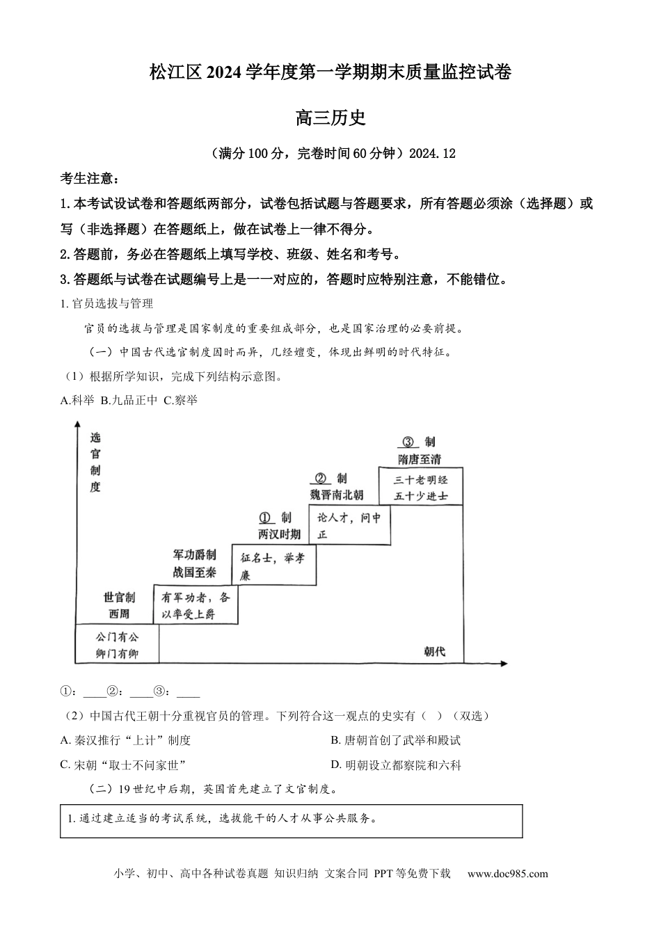 小学、初中、高中各种试卷真题知识归纳文案合同PPT等免费下载www.doc985.com松江区2024学年度第一学期期末质量监控试卷高三历史(满分100分,完卷时间60分钟)2024.12考生注意:1.本考试设试卷和答题纸两部分,试卷包括试题与答题要求,所有答题必须涂(选择题)或写(非选择题)在答题纸上,做在试卷上一律不得分。2.答题前,务必在答题纸上填写学校、班级、姓名和考号。3.答题纸与试卷在试题编号上是一一对应的,答题时应特别注意,不能错位。1.官员选拔与管理官员的选拔与管理是国家制度的重要组成部分,也是国家治理的必要前提。(一)中国古代选官制度因时而异,几经嬗变,体现出鲜明的时代特征。(1)根据所学知识,完成下列结构示意图。A.科举B.九品正中C.察举①:____②:____③:____(2)中国古代王朝十分重视官员的管理。下列符合这一观点的史实有()(双选)A.秦汉推行“上计”制度B.唐朝首创了武举和殿试C.宋朝“取士不问家世”D.明朝设立都察院和六科(二)19世纪中后期,英国首先建立了文官制度。1.通过建立适当的考试系统,选拔能干的人才从事公共服务。小学、初中、高中各种试卷真题知识归纳文案合同PPT等免费下载www.doc985.com2.成绩突出的公共服务人员可以得到晋升,能够胜任工作的人员可以得到最高奖励,以此鼓励公共服务人员勤勉的工作态度和进取心。——《关于建立常任文官制度的报告》(1854年)(3)根据材料,文官制度与科举制的共性之处有()(双选)A.考试录用B.注重才能C.治理高效D.稳定政权(三)近代以来,中国的官员选拔与管理逐步走向公平科学。(4)请将下列事件与意义一一对应。(四)对于官员的选拔与管理,有学者指出:我国历史上形式多样的选贤任能方式,自战国秦汉以后推动了阶级、阶层的流动,囊括了许多优秀人才服务于国家。……任能中的循名责实、严格考核与问责制,是管理人才、提高国家治理能力的重要手段。但用人不公、任人唯亲、任人唯近、用人体制涣散以至国家用人权力的丧失也是王朝不治而乱的历史教训。——卜宪群:《我国历史上的国家治理》(5)综上,从国家治理的视角谈谈你对官员选拔与管理的认识。2.移民与文化自古以来,人类在不断的迁徙中求生存、谋发展。(1)印欧人的迁徙推动了亚欧大陆几个重要文化区域的形成和发展。请把下列名称与图中序号一一匹配。A.雅利安人B.赫梯人C.波斯人D.希腊人小学、初中、高中各种试卷真题知识归纳文案合同PPT等免费下载www.doc985.com(2)公元前2世纪至公元2世纪与3至6世纪,亚欧游牧民族先后两次大迁徙。其带来的区域文化影响有()(双选)A.改变亚欧大陆政治格局B.形成了“希腊化世界”C.促进本民族文化的发展D.改变了美洲人口结构(3)下图为世界人口大迁徙流动方向示意图,导致这一历史变化的因素有(三选)()A.新航路开辟B.三角贸易C.经济全球化D.物种外传(4)综合上述材料,从文化交流的视角,谈谈你对移民这一历史现象的认识。3.所有历史叙述在本质上都是对历史的解释,即便是对基本事实的陈述也包含了陈述者的主观认识。对新小学、初中、高中各种试卷真题知识归纳文案合同PPT等免费下载www.doc985.com文化运动的历史叙述,在不同的教科书中有着各自的表述。材料一新文化运动①是彻底地反对封建文化的运动。在②民国初年政治黑暗、群众思想蒙昧落后的状况下,新文化运动③起了震古铄今、振聋发聩的思想解放作用。……新文化运动④从北京、上海等地开始,很快传播到许多地方,它的影响也越来越深入。——沈起炜主编:《高级中学课本历史(下册)》(上海教育出版社2005年)材料二新文化运动是一次伟大的思想解放运动。新文化运动还促进了民众的觉醒,唤起了人们对国家政治事务的关心。新文化运动也是一场全面的文化转型运动,它对中国的政治、思想、伦理、观念、文学、艺术等方面产生了深刻的影响。这场文化革新,为中国文化的发展提供了新的模式。新文化运动对传统文化的批判,也有一定的片面性。这种形式主义的偏向,产生了许多消极的影响。——朱汉国主编:《历史必修第三册》(人民出版社2008年)材料三新文化运动的倡导者积极宣传新思想、新文化,强调了文化的时代性...