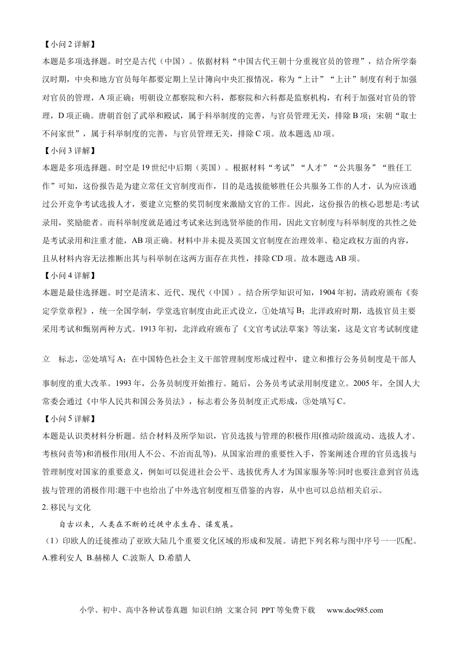 小学、初中、高中各种试卷真题知识归纳文案合同PPT等免费下载www.doc985.com松江区2024学年度第一学期期末质量监控试卷高三历史(满分100分,完卷时间60分钟)2024.12考生注意:1.本考试设试卷和答题纸两部分,试卷包括试题与答题要求,所有答题必须涂(选择题)或写(非选择题)在答题纸上,做在试卷上一律不得分。2.答题前,务必在答题纸上填写学校、班级、姓名和考号。3.答题纸与试卷在试题编号上是一一对应的,答题时应特别注意,不能错位。1.官员选拔与管理官员的选拔与管理是国家制度的重要组成部分,也是国家治理的必要前提。(一)中国古代选官制度因时而异,几经嬗变,体现出鲜明的时代特征。(1)根据所学知识,完成下列结构示意图。A.科举B.九品正中C.察举①:____②:____③:____(2)中国古代王朝十分重视官员的管理。下列符合这一观点的史实有()(双选)A.秦汉推行“上计”制度B.唐朝首创了武举和殿试C.宋朝“取士不问家世”D.明朝设立都察院和六科(二)19世纪中后期,英国首先建立了文官制度。1.通过建立适当的考试系统,选拔能干的人才从事公共服务。小学、初中、高中各种试卷真题知识归纳文案合同PPT等免费下载www.doc985.com2.成绩突出的公共服务人员可以得到晋升,能够胜任工作的人员可以得到最高奖励,以此鼓励公共服务人员勤勉的工作态度和进取心。——《关于建立常任文官制度的报告》(1854年)(3)根据材料,文官制度与科举制的共性之处有()(双选)A.考试录用B.注重才能C.治理高效D.稳定政权(三)近代以来,中国的官员选拔与管理逐步走向公平科学。(4)请将下列事件与意义一一对应。(四)对于官员的选拔与管理,有学者指出:我国历史上形式多样的选贤任能方式,自战国秦汉以后推动了阶级、阶层的流动,囊括了许多优秀人才服务于国家。……任能中的循名责实、严格考核与问责制,是管理人才、提高国家治理能力的重要手段。但用人不公、任人唯亲、任人唯近、用人体制涣散以至国家用人权力的丧失也是王朝不治而乱的历史教训。——卜宪群:《我国历史上的国家治理》(5)综上,从国家治理的视角谈谈你对官员选拔与管理的认识。【答案】(1)①.C.B.A②③(2)AD(3)AB(4)①B;A;C.②③(5)在国家治理中,建立公正、科学、严格的官员选拔与管理制度是至关重要的,其中选拔机制也可以互相借鉴、学习。通过合理的选拔机制促进社会流动,选拔优秀人才,并通过有效的管理机制确保官员认真履行职责,能够提高国家治理能力,维护社会稳定和国家繁荣。反之,若选拔和管理制度出现问题,将会引发一系列社会和政治问题,甚至导致国家的衰败。【解析】【小问1详解】根据所学可知,两汉时期实行征名士、举孝廉,是①察举制,C正确;魏晋南北朝,论人才,问中正,是②九品中正制,B正确;隋唐至清,三十老明经,五十少进士,是③科举制,A正确。小学、初中、高中各种试卷真题知识归纳文案合同PPT等免费下载www.doc985.com【小问2详解】本题是多项选择题。时空是古代(中国)。依据材料“中国古代王朝十分重视官员的管理”,结合所学秦汉时期,中央和地方官员每年都要定期上呈计簿向中央汇报情况,称为“上计”“上计”制度有利于加强对官员的管理,A项正确;明朝设立都察院和六科,都察院和六科都是监察机构,有利于加强对官员的管理,D项正确。唐朝首创了武举和殿试,属于科举制度的完善,与官员管理无关,排除B项;宋朝“取士不问家世”,属于科举制度的完善,与官员管理无关,排除C项。故本题选AD项。【小问3详解】本题是多项选择题。时空是19世纪中后期(英国)。根据材料“考试”“人才”“公共服务”“胜任工作”可知,这份报告是为建立常任文官制度而作,目的是选拔能够胜任公共服务工作的人才,认为应该通过公开竞争考试选拔人才,要建立完整的奖罚制度来激励文官的工作。因此,这份报告的核心思想是:考试录用,奖励能者。而科举制度就是通过考试来达到选贤举能的作用,因此文官制度与科举制度的共性之处是考试录用和注重才能,AB项正确。材料中并未提及英国文官制度在治理效率、稳定政权方面的内容,且从材料内容无法推断出其与科举制在这两方面存在共...