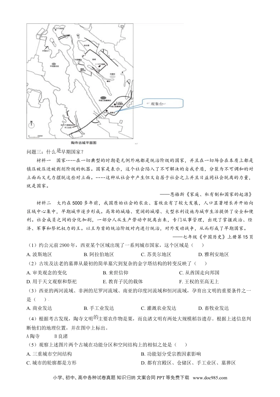 小学、初中、高中各种卷真知文案合同试题识归纳PPT等免下费载www.doc985.com虹口区2024学年度第一学期期终学生学习能力诊断测试高三历史试卷一、早期国家(24分)1.小明发现新版初一教材中,出现了“良渚古城和陶寺古城的发现,表明了早期国家的出现”这一结论,但并没有出现在现行的高中教材中,他决定一探究竟。问题一:什么是国家?问题二:良渚和陶寺考古发现了什么?考古发掘的陶寺古城和良渚古城各有特点,又有许多相似之处。小学、初中、高中各种卷真知文案合同试题识归纳PPT等免下费载www.doc985.com问题三:什么早期国家?材料一国家……在一切典型的时期毫无例外地都是统治阶级的国家,并且在一切场合在本质上都是镇压被压迫被剥削阶级的机器。国家是表示,这个社会陷入了不可解决的自我矛盾,分裂为不可调和的对立面而又无力摆脱这些对立面。……这种从社会中产生但又自居于社会之上并且日益同社会脱离的力量,就是国家。——恩格斯《家庭、私有制和国家的起源》材料二大约在5000多年前,我国原始社会的农业、畜牧业有了较大发展,人口显著增长并开始向区域中心集中,早期城市逐步形成。高耸的城墙、宽阔的城壕、大型水利设施为城市生活提供了安全和便利。社会成员之间的分化加剧,一部分人从生产劳动中脱离出来,专门从事管理,出现了掌握政治、经济、军事和祭祀权力的王。以王为首的统治阶级对内进行统治,对外发动战争,从而形成了早期国家。——七年级《中国历史》上册第15页(1)约公元前2900年,西亚某个区域出现了一系列城市国家,这个区域是()A.波斯地区B.阿拉伯地区C.苏美尔地区D.雅利安地区(2)古埃及法老的墓葬从最初的简单墓穴到复杂的金字塔结构的转变反映了()A.审美观念的变化B.来世信仰C.从酋国走向邦国D.用于天文观察和祭祀E.教育子民的载体F.王权的至高无上(3)西亚的两河流域、非洲的尼罗河流域、南亚的印度河流域和恒河流域,孕育出文明的重要条件之一是()A.商业发达B.手工业发达C.灌溉农业发达D.畜牧业发达(4)根据考古发现,陶寺文明主要农作物是粟,而良渚文明有两处大规模稻谷遗存。根据上述信息判断他们的地理位置,并在图中上标出。A陶寺B良渚(5)观察上述图片两个古城在功能分区和空间结构上的相似之处是()A.三重城市空间结构B.功能划分受宗教因素影响C.城市的轮廓都是方形D.都有宫殿区、仓储区、手工业区、墓葬区小学、初中、高中各种卷真知文案合同试题识归纳PPT等免下费载www.doc985.com(6)在良渚古城遗址中,反山墓地出土的玉器中包含了目前发现最大的刻有统一纹徽的玉琮和玉钺,其位置位于成排墓葬的中间。而在卞家山墓地,完全没有成型玉器出现。这表明()A.社会阶层分化B.阶级矛盾尖锐C.唯我独尊的观念出现D.风俗世俗化(7)在陶寺古城中有观象台的遗址,推测其功能是()A.治礼、作乐B.预防洪水C.祭天、授时D.森林防火防沙(8)根据问题一、问题二、问题三的材料,概括早期国家的内涵。二、乞丐之惑(27分)2.小赵非常好奇于电影中出现的“奉旨乞食”一幕,带着这份疑惑他查询了大量有关乞丐的资料。材料一清代政府发给乞丐行乞所用的腰牌(摘自(清)王凤生《平湖保甲事宜》)通过探究,小赵对乞丐有了一定的认知。然而乞丐作为编户齐民以外的庞大群体,中国历代政府又是如何应对?小赵通过进一步研究制作了一份简表。材料二南北朝(577年)诏给病残孤老不能自存者以衣食。唐代(734年)诏京城乞儿,悉令病坊收养,官以本钱收利给之。宋代京师旧置东、西福田院收容老、疾、孤、穷、丐者,给钱、粟者24人。后又增设南、北福田院,收容300人。元代(1271年)令各路设众济院,拨给不能自存之人粮食及柴薪。明代(1457年)诏每县设养济院一所,提供餐食、医疗和安葬服务。(1527年)令京城官员于各地方甄别街头乞讨流浪人员后送养济院。清代造乞丐牌册,发腰牌。各地设立栖流所集中安置流丐,甄别流浪人员。政府促使民间慈善组织逐步官营化。(1902年)出现贫民习艺所。民国颁布法规褒奖慈善组织;(1943年)颁布《社会救济法》,针对老幼病残孕等不同弱势群体设计教养、习艺等不同救济设施。——整理自曲彦斌《中国乞丐...