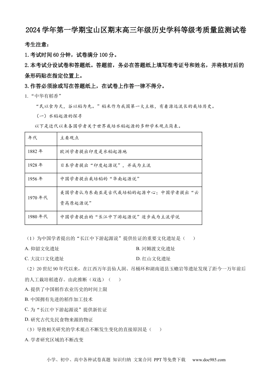 小学、初中、高中各种试卷真题知识归纳文案合同PPT等免费下载www.doc985.com2024学年第一学期宝山区期末高三年级历史学科等级考质量监测试卷考生注意:1.考试时间60分钟,试卷满分100分。2.本考试分设试卷和答题纸。答题前,务必在答题纸上填写准考证号和姓名,并将核对后的条形码贴在指定位置上。3.作答必须涂或写在答题纸上,在试卷上作答一律不得分。1.“中华有稻香”“民以食为天,谷以稻为先。”稻米作为我国第一大主粮,有着源远流长的栽培历史。(一)水稻起源的探寻以下是近代以来各国学者关于世界栽培水稻起源的多种学术观点简表。年代主要观点1882年欧洲学者提出印度是水稻起源地1928年日本学者提出“印度起源说”,并成为主流1956年中国学者提出栽培稻的“华南起源说”1970年代美国学者认为东南亚是古代栽培稻的起源中心;中国学者提出“云贵高原起源说”1980年代中国学者提出的“长江中下游起源说”逐步成为主流学说(1)为中国学者提出的“长江中下游起源说”提供佐证的重要文化遗址是()A.仰韶文化遗址B.河姆渡文化遗址C.大汶口文化遗址D.红山文化遗址(2)20世纪90年代以来,在江西万年县仙人洞、吊桶环和湖南道县玉蟾岩等遗址发现了距今一万年前后的人工栽培稻遗存。由此推断(双选)()A.提供了中国稻作农业历史的时间上限B.中国拥有先进的稻作加工技术C.为“长江中下游起源说”提供新佐证D.研究古代先民食物来源的物证(3)导致相关研究的学术观点不断发生变化的直接原因是()A.学者研究区域的不断改变小学、初中、高中各种试卷真题知识归纳文案合同PPT等免费下载www.doc985.comB.中外学者研究技术的不断升级C.中国考古成果的不断更新D.中国打破西方的学术研究垄断(二)稻作技术的演进(4)“翻翻联联衔尾鸦,荦荦确确蜕骨蛇。分畴翠浪走云阵,刺水绿针插稻芽。”诗句描绘的我国古代灌溉工具是()A.桔槔B.水排C.翻车D.筒车(5)曲辕犁提高了劳动效率和耕田质量,最先在江南水田地方推广,其定型于()A.汉朝B.唐朝C.宋朝D.明朝(6)“共和国勋章”获得者享誉海内外的著名农业科学家袁隆平院士曾说“我们不断创新,一次次打破世界水稻单产纪录”。其“创新”主要体现()A.机械技术B.生产模式C.育种技术D.人工智能技术(三)水稻的世界传播不同时代、不同类型的中外交通路线为水稻的世界传播提供了便利,将下列示意图中的交通路线填入空格中(填涂字母)(7)据考古发现,有一条我国水稻外传的路线:从西北地区经天山,到达中亚,最后传播伊朗一带。该路线是(8)据记载,公元前4世纪亚历山大探险家们将由我国传入印度的水稻带入希腊及周边地中海地区,随后从希腊和西西里岛传遍欧洲南部并延伸至北非。该路线是(9)17世纪后,欧洲殖民者将水稻从欧洲传入美洲。从这以后,大约一个世纪内水稻在卡罗莱纳州以及美国南部、南美洲的沼泽地带迅速生长起来。该路线是(四)水稻的历史影响阅读下列与水稻有关的材料,回答问题。①《诗经·豳风·七月》:“十月获稻,为此春酒,以介眉寿。”②《管子·牧民》:“仓廪实而知礼节,衣食足而知荣辱。”小学、初中、高中各种试卷真题知识归纳文案合同PPT等免费下载www.doc985.com③宋应星《天工开物》:“今天下育民人者,稻居什七,而来(小麦)、牟(大麦)、黍、稷居什三。”④电影《上甘岭》主题歌《我的祖国》:“一条大河波浪宽,风吹稻花香两岸……”⑤袁隆平院士:“我最大的愿望是饭碗要牢牢地掌握在我们中国人自己手上。”⑥联合国粮食及农业组织认定的“全球重要农业文化遗产”项目中,中国共有22项入选,数量位居世界第一、其中共有5项稻作相关遗产。(10)根据上述材料,概述中华水稻的历史影响。2.“方寸”识历史邮票俗称“方寸”,邮票是由国家发行的一种邮资凭证,常被人们称为“国家名片”、“微型百科全书”。某校学生集邮社团,以邮票为载体,分主题探寻邮票背后的历史。(一)邮政的历史(1)1982年,邮电部以公元3世纪前后西北地区驿使驰送文书情景的画像砖《驿使图》为原型,发行了一枚面值1元的小型张纪念邮票(如图)。该画像砖是我国目前发现最早的古代邮驿的形象资料,属于()A.秦汉时期B.魏...