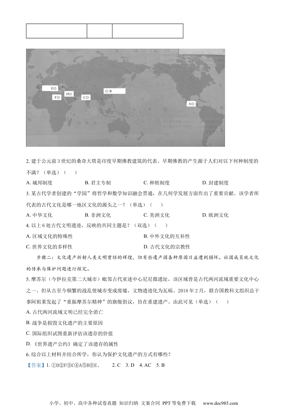 小学、初中、高中各种试卷真题知识归纳文案合同PPT等免费下载www.doc985.com杨浦区2023学年度第一学期高中等级考模拟质量调研高三历史试卷考生注意:1.考试满分100分,考试时间60分钟。2.本考试分设试卷和答题纸。试卷包括试题与答题要求。3.答题前,务必用黑色钢笔、圆珠笔或签字笔在答题纸正面清楚地填写姓名、准考证号,并将核对后的条形码贴在指定位置上。4.作答必须写在答题纸上与试卷题号对应的位置,在试卷上作答一律不得分。5.单选题必须选1项,双选题必须选2项,多选少选都不得分。文化的传承与保护。文化遗产是全人类的共同财富。某学校历史社团以“文化的传承与保护”为主题,从世界文化遗产入手组织探究活动。步骤一:古代文明遗迹是世界文化遗产的重要组成部分,社团成员搜集了6处具有代表性的古代文明遗迹图片。1.根据表格和地图,完善古代文明遗迹信息,准确匹配“古代文明遗迹”与其“地理位置”。(填写字母)古代文明遗迹名称地理位置研究意义①亚述古城亚述的首都②孟菲斯及其墓地金字塔埃及法老为自己修建的陵墓③桑奇大塔印度早期佛教建筑的代表④羽蛇神金字塔玛雅文明祭祀神灵的神庙⑤莫高窟中国佛教建筑艺术的结晶⑥帕特农神庙古希腊建筑艺术的代表小学、初中、高中各种试卷真题知识归纳文案合同PPT等免费下载www.doc985.com2.建于公元前3世纪的桑奇大塔是印度早期佛教建筑的代表。早期佛教的产生源于人们对以下何种制度的不满?(单选)()A.城邦制度B.君主专制C.种姓制度D.封建制度3.某古代学者创建的“学园”将哲学和数学知识融会贯通,在几何学发展方面作出了重要贡献。该学者所代表的古代文化是哪一地区文化的源头之一?(单选)()A.中华文化B.非洲文化C.美洲文化D.欧洲文化4.以上6处古代文明遗迹,反映的共同主题是?(双选)()A.区域文化的特殊性B.中外文化的互补性C.世界文化的多样性D.古代文化的宗教性步骤二:文化遗产折射人类文明曾经的辉煌,但有些遗产因各种原因日益遭到损坏。社团成员就文化的传承与保护问题进行探究。5.摩苏尔(今伊拉克第二大城市)毗邻古代亚述中心尼尼微遗址,该区域曾是古代两河流域重要文化中心之一。但从古至今频繁的战乱使城市变成废墟,文物遗迹化为瓦砾。2018年2月,联合国教科文组织总干事阿祖莱发起了“重振摩苏尔精神”的旗舰倡议,旨在重建遗产。由此可见(单选)()A.古代两河流域文明已经完全消亡B.战争是损毁文化遗产的主要原因C.国际组织试图重新评估该遗存的价值D.《世界遗产公约》确定了该遗存的属性6.综合以上材料并结合所学,你认为保护文化遗产的方式有哪些?【答案】1.①D②F③C④A⑤B⑥E。2.C3.D4.AC5.B小学、初中、高中各种试卷真题知识归纳文案合同PPT等免费下载www.doc985.com6.立法保护,国家通过立法进行现代意义上的保护;发挥国际组织的作用;注重自然环境和生态保护;努力打造和平与发展的国际环境,减少地区冲突和局部战争。(任3点)【解析】【分析】本大题是综合题【1题详解】根据所学知识可知,亚述古城位于美索不达米亚北部底格里斯河西岸的特殊地带上,位于雨水灌溉农业和人工灌溉农业的交界处,故①处填D;孟斐斯是古埃及城市。位于今尼罗河三角洲南部,上下埃及交界的米特·拉辛纳村,故②处填F;桑奇大塔是印度著名的古迹,印度早期王朝时代的佛塔,位于中央邦首府博帕尔附近的桑奇村,是印度有名的佛塔之城,被誉为印度佛教艺术的代表,故③处填C;羽蛇神金字塔位于墨西哥尤卡坦半岛,始建于公元9世纪,是一个四面型金字塔建筑,金字塔阶梯正对东南西北四个方向,故④处填A;莫高窟坐落于河西走廊的西部尽头的敦煌,它的开凿从十六国时期至元代,前后延续约1000年,这在中国石窟中绝无仅有,故⑤处填B;帕特农神庙位于希腊雅典卫城的古城堡中心,始建于公元前447年,故⑥处填E。【2题详解】本题是单类型单项选择题。据本题主题干的内容,可知这是正向题。据本题时间信息可知时空是:公元前3世纪(印度)。根据所学知识可知,早期佛教反对种姓制度,反对第一等级婆罗门的特权,因而也得到国王和一些富人的支持,佛教提出“众生平等”,不拒绝低种姓的人入教,教义通俗易懂...