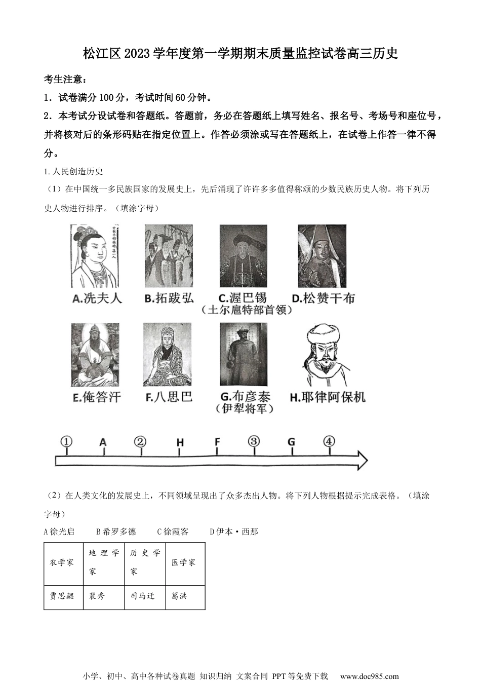 小学、初中、高中各种试卷真题知识归纳文案合同PPT等免费下载www.doc985.com松江区2023学年度第一学期期末质量监控试卷高三历史考生注意:1.试卷满分100分,考试时间60分钟。2.本考试分设试卷和答题纸。答题前,务必在答题纸上填写姓名、报名号、考场号和座位号,并将核对后的条形码贴在指定位置上。作答必须涂或写在答题纸上,在试卷上作答一律不得分。1.人民创造历史(1)在中国统一多民族国家的发展史上,先后涌现了许许多多值得称颂的少数民族历史人物。将下列历史人物进行排序。(填涂字母)(2)在人类文化的发展史上,不同领域呈现出了众多杰出人物。将下列人物根据提示完成表格。(填涂字母)A徐光启B希罗多德C徐霞客D伊本·西那农学家地理学家历史学家医学家贾思勰裴秀司马迁葛洪小学、初中、高中各种试卷真题知识归纳文案合同PPT等免费下载www.doc985.com王祯①_____②_____塔西佗③_____李时珍④_____(3)历史活动是群众的事业。下面这组拍摄于20世纪初期的照片中“华工”所做历史贡献是()(填涂字母,双选)A.为一战做出了巨大付出B.为反法西斯战争做出了贡献C.为协约国胜利作出贡献D.帮助中国政府收回山东主权(4)恩格斯强调认为:“人们总是通过每一个人追求他自己的、自觉预期的目的来创造他们的历史,而这许多按不同方向活动的愿望及其对外部世界的各种各样作用的合力,就是历史。”综合上述材料,概括你对“人民创造历史”这一主题的理解。2.船只承载历史。船是人类征服自然的工具,也成为人类文明的载体。(1)请将以上船只按时序填入下图。(填涂字母)小学、初中、高中各种试卷真题知识归纳文案合同PPT等免费下载www.doc985.com(2)请将上述图片中序号为B、E、F的商船与其主要航行区域相匹配。(3)由于某些重大的历史价值和时代意义,船甚至会成为一种精神象征。参考示例,对上述序号D代表的船只进行描述。示例:“马尼拉大帆船”是新航路开辟后(16世纪),西班牙经营的横跨太平洋贸易的主要运输工具,它将中国的丝绸、瓷器等运往墨西哥换回白银,再将白银运回马尼拉。这些白银大量流入中国,形成了一个围绕白银输入中国的贸易网络。不仅影响了中国的商品经济发展,也推动了欧洲资本主义的发展。(4)综合上述材料,结合所学知识,谈谈你对“船只承载历史”的认识。3.叙事塑造历史有历史学者认为,对于历史事件的认识往往具有“三重性”:作为历史学者眼中的历史事件本身,作为亲身经历者的切身感受,作为政治阶层的立场和价值诉求。材料一:美国学者周锡瑞所著《义和团运动的起源》书目摘录(部分)第一章山东—父和团的故乡山东的社会经济区义和团的故乡鲁西社会组织山东士绅的分布材料二:中国学者相蓝欣所著《义和团战争的起源》书目摘录(部分)第一章清廷朝政的失衡第二章失控的洋人第三章德国式的帝国主义一争夺势力范围与多变外小学、初中、高中各种试卷真题知识归纳文案合同PPT等免费下载www.doc985.com第二章秘密宗教、义和拳和民间文化山东秘密宗教起义刀枪不入和降神附体晚清习拳者和秘密宗教民间文化和农民村社第三章披着基督外衣的帝国主义洋货进口的影响……交风云……三德国的炮舰政策与胶州湾事件……六清廷的困境与义和团的兴起第五章群情激愤的山东第七章威胁动武第八章通往冲突之路……材料三“义和拳的纪律:不打人不抢老百姓的东西,就是和在教的间。”——杨顺堂、杨高堂(山东德州小杨庄村民)1960年代采访口述材料四大臣刚毅认为“奉民出死力为国宣难,入京以来,秋毫无犯。”——《中国近代史史料丛刊·义和团》材料五“见人即杀,亦不分辨,见有礼拜堂即放火烧之。”——(英)普特南·威尔《庚子使馆被围记》材料六:本年夏见,拳匪构乱,开衅友邦。……董中华之物力,结与国之欢心。——《上谕》(1901年2月14日)材料七:义和团运动……表现了中国人民不甘屈服于帝国主义及其走狗的顽强的反抗精神。——毛泽东:《中国革命和中国共产党》(1939年12月)(1)材料一和材料二中关于义和团兴起的表述有何不同?(2)分别概括材料三、四、五中亲历者眼中的义和团形象。(3)材料六和材料七中对义和团的性质分别做了怎样的...