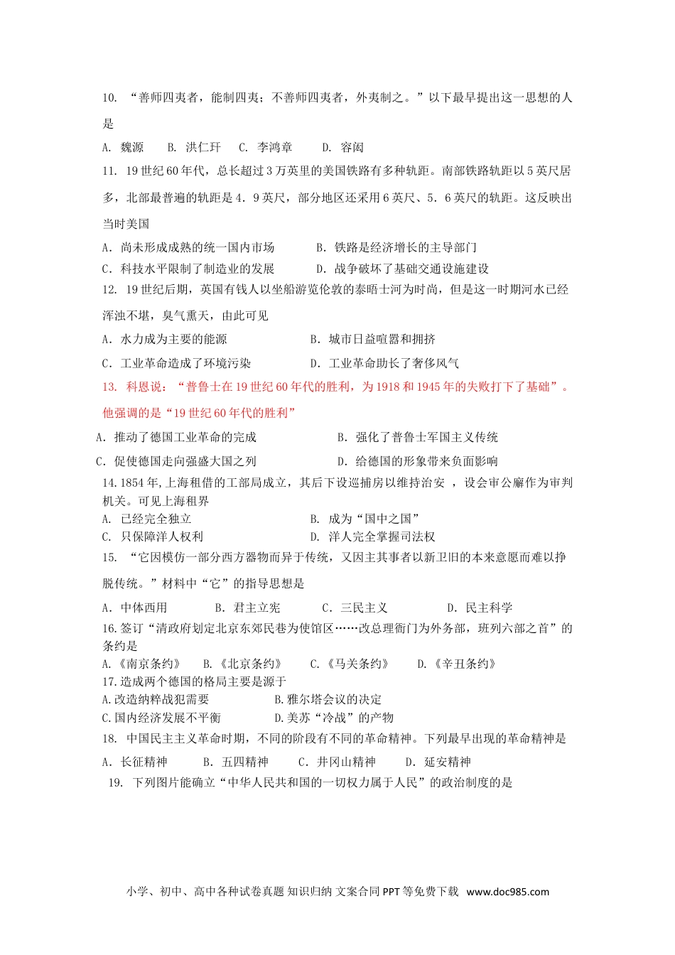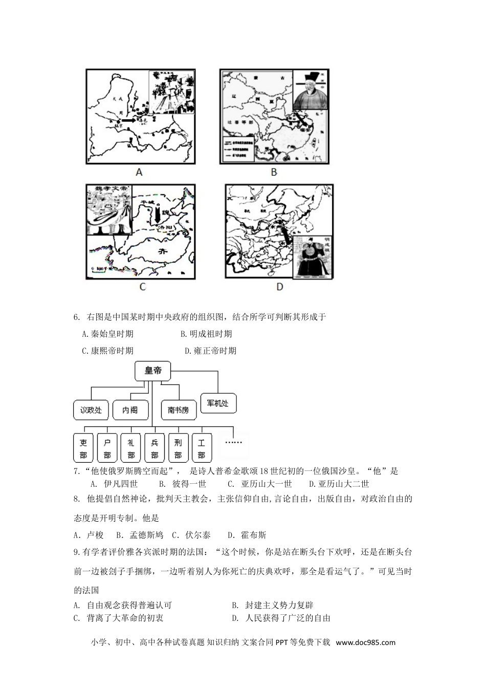 虹口区2017-2018学年第二学期等级考质量监测高三年级历史学科试卷2018.4考生注意:1.考试时间60分钟,试卷满分100分。2.本考试设试卷和答题纸两部分,试卷包括试题与答题要求;所有答题必须写在答题纸上;做在试卷上一律不得分。3.答题前,务必在答题纸上填写准考证号和姓名。4.答题纸与试卷在试题编号上是一一对应的,答题时应特别注意,不能错位。一、选择题(共40分,每小题2分。每小题只有一个正确答案)1.判定文明出现的标志时,若将其主要物化为两点:(一)金属器具被比较广泛地使用;(二)已能记载语言的成熟的文字的应用。按照此标准,中国文明社会形成的时间最迟不晚于A.一万年前B.黄帝时期C.商周时期D.秦汉时期2.下列选项中最能够直接解开历史上关于孙子和孙膑其人其书的是A.《史记》和《汉书》的相关记载B.报纸的相关报道C.学者的相关历史学著作D.银雀山同时出土相关的两部兵法竹简3.作者所创作的都是“不系人之利害者,出发点则是山间木荫,率意谈噱,于天文、方志、律历、音乐、医药、卜算无所不通,皆有所论”,此古代论著是A.《资治通鉴》B.《梦溪笔谈》C.《四库全书》D.《几何原本》4.唐代进士会在今西安著名古迹大雁塔的碑石上提名,史称“雁塔题名”。“进士”的名称来源于A.宗法制B.分封制C.科举制D.内阁制5.仔细观察下列一组王朝迁都图,为了学习先进文化而进行迁都的是小学、初中、高中各种试卷真题知识归纳文案合同PPT等免费下载www.doc985.com6.右图是中国某时期中央政府的组织图,结合所学可判断其形成于A.秦始皇时期B.明成祖时期C.康熙帝时期D.雍正帝时期7.“他使俄罗斯腾空而起”,是诗人普希金歌颂18世纪初的一位俄国沙皇。“他”是A.伊凡四世B.彼得一世C.亚历山大一世D.亚历山大二世8.他提倡自然神论,批判天主教会,主张信仰自由,言论自由,出版自由,对政治自由的态度是开明专制。他是A.卢梭B.孟德斯鸠C.伏尔泰D.霍布斯9.有学者评价雅各宾派时期的法国:“这个时候,你是站在断头台下欢呼,还是在断头台前一边被刽子手捆绑,一边听着别人为你死亡的庆典欢呼,那全是看运气了。”可见当时的法国A.自由观念获得普遍认可B.封建主义势力复辟C.背离了大革命的初衷D.人民获得了广泛的自由小学、初中、高中各种试卷真题知识归纳文案合同PPT等免费下载www.doc985.com10.“善师四夷者,能制四夷;不善师四夷者,外夷制之。”以下最早提出这一思想的人是A.魏源B.洪仁玕C.李鸿章D.容闳11.19世纪60年代,总长超过3万英里的美国铁路有多种轨距。南部铁路轨距以5英尺居多,北部最普遍的轨距是4.9英尺,部分地区还采用6英尺、5.6英尺的轨距。这反映出当时美国A.尚未形成成熟的统一国内市场B.铁路是经济增长的主导部门C.科技水平限制了制造业的发展D.战争破坏了基础交通设施建设12.19世纪后期,英国有钱人以坐船游览伦敦的泰晤士河为时尚,但是这一时期河水已经浑浊不堪,臭气熏天,由此可见A.水力成为主要的能源B.城市日益喧嚣和拥挤C.工业革命造成了环境污染D.工业革命助长了奢侈风气13.科恩说:“普鲁士在19世纪60年代的胜利,为1918和1945年的失败打下了基础”。他强调的是“19世纪60年代的胜利”A.推动了德国工业革命的完成B.强化了普鲁士军国主义传统C.促使德国走向强盛大国之列D.给德国的形象带来负面影响14.1854年,上海租借的工部局成立,其后下设巡捕房以维持治安,设会审公廨作为审判机关。可见上海租界A.已经完全独立B.成为“国中之国”C.只保障洋人权利D.洋人完全掌握司法权15.“它因模仿一部分西方器物而异于传统,又因主其事者以新卫旧的本来意愿而难以挣脱传统。”材料中“它”的指导思想是A.中体西用B.君主立宪C.三民主义D.民主科学16.签订“清政府划定北京东郊民巷为使馆区……改总理衙门为外务部,班列六部之首”的条约是A.《南京条约》B.《北京条约》C.《马关条约》D.《辛丑条约》17.造成两个德国的格局主要是源于A.改造纳粹战犯需要B.雅尔塔会议的决定C.国内经济发展不平衡D.美苏“冷战”的产物18.中国民主主义革命时期,不同的阶段有不同的革命精神。下列最早出现的革命精神是A.长征精神B.五四精神C.井冈山...