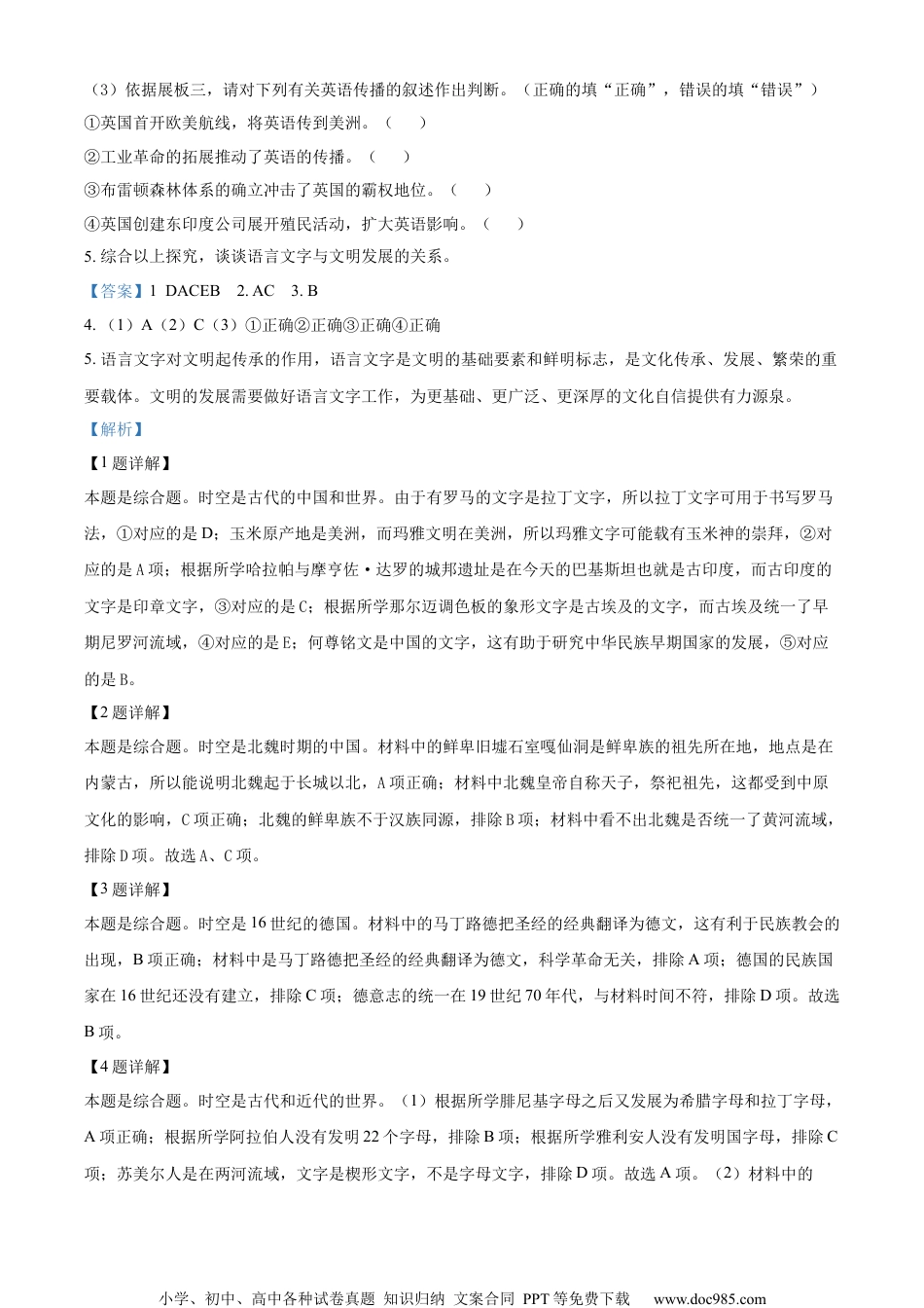 小学、初中、高中各种试卷真题知识归纳文案合同PPT等免费下载www.doc985.com浦东新区2023学年度第一学期期末教学质量检测高三历史试卷考生注意:1.本考试为闭卷考试;考试时间60分钟,满分100分。2.本考试设试卷和答题纸两部分,试卷包括试题与答题要求。所有回答必须按规定写在答题纸上,做在试卷上一概无效。3.答题纸与试卷在试题编号上是一一对应的,并留下了足够的答题空间,答题时应特别注意,不要错位。一、语言文字与文明(25分)语言文字与文明发展紧密相联。某校语言文字研究社围绕“语言文字与文明”的主题展开探讨,搜寻到以下材料。1.请将下列图片所示的古文字与表格中的说明相匹配(填选字母)古代文字相关描述①用于书写罗马法②可能载有玉米神的崇拜③出土于哈拉帕与摩亨佐·达罗的城邦遗址④可以佐证早期尼罗河流域的统一小学、初中、高中各种试卷真题知识归纳文案合同PPT等免费下载www.doc985.com⑤有助于研究中华民族早期国家的发展2.下图是北魏皇帝拓跋焘祭祖时铭刻的汉字祝文,内容为“维太平真君四年癸未岁七月廿五日天子臣焘使谒……”,发现地点在内蒙古东北部的嘎仙洞石壁上。据此能够佐证北魏统治者()(双选)鲜卑旧墟石室嘎仙洞祝文A.起于长城以北B.与汉民族同源C.接受中原文化D.统一黄河流域3.16世纪,马丁·路德将圣经《新约全书》从拉丁文翻译成德文。这直接推动了德意志()A.科学革命发生B.民族教会出现C.民族国家建立D.统一国家诞生4.语言文字的传播促进了文明的交流。研究社为探究这种历史现象,制作了三块展板。(1)展板一中的“□□□□”应填写()(单选)A.腓尼基人B.阿拉伯人C.雅利安人D.苏美尔人(2)展板二中,《古事记》和《日本书纪》的创作时代相当于中国的()(单选)A.魏晋时期B.南北朝时期C.隋唐时期D.两宋时期小学、初中、高中各种试卷真题知识归纳文案合同PPT等免费下载www.doc985.com(3)依据展板三,请对下列有关英语传播的叙述作出判断。(正确的填“正确”,错误的填“错误”)①英国首开欧美航线,将英语传到美洲。()②工业革命的拓展推动了英语的传播。()③布雷顿森林体系的确立冲击了英国的霸权地位。()④英国创建东印度公司展开殖民活动,扩大英语影响。()5.综合以上探究,谈谈语言文字与文明发展的关系。【答案】1.DACEB2.AC3.B4.(1)A(2)C(3)①正确②正确③正确④正确5.语言文字对文明起传承的作用,语言文字是文明的基础要素和鲜明标志,是文化传承、发展、繁荣的重要载体。文明的发展需要做好语言文字工作,为更基础、更广泛、更深厚的文化自信提供有力源泉。【解析】【1题详解】本题是综合题。时空是古代的中国和世界。由于有罗马的文字是拉丁文字,所以拉丁文字可用于书写罗马法,①对应的是D;玉米原产地是美洲,而玛雅文明在美洲,所以玛雅文字可能载有玉米神的崇拜,②对应的是A项;根据所学哈拉帕与摩亨佐·达罗的城邦遗址是在今天的巴基斯坦也就是古印度,而古印度的文字是印章文字,③对应的是C;根据所学那尔迈调色板的象形文字是古埃及的文字,而古埃及统一了早期尼罗河流域,④对应的是E;何尊铭文是中国的文字,这有助于研究中华民族早期国家的发展,⑤对应的是B。【2题详解】本题是综合题。时空是北魏时期的中国。材料中的鲜卑旧墟石室嘎仙洞是鲜卑族的祖先所在地,地点是在内蒙古,所以能说明北魏起于长城以北,A项正确;材料中北魏皇帝自称天子,祭祀祖先,这都受到中原文化的影响,C项正确;北魏的鲜卑族不于汉族同源,排除B项;材料中看不出北魏是否统一了黄河流域,排除D项。故选A、C项。【3题详解】本题是综合题。时空是16世纪的德国。材料中的马丁路德把圣经的经典翻译为德文,这有利于民族教会的出现,B项正确;材料中是马丁路德把圣经的经典翻译为德文,科学革命无关,排除A项;德国的民族国家在16世纪还没有建立,排除C项;德意志的统一在19世纪70年代,与材料时间不符,排除D项。故选B项。【4题详解】本题是综合题。时空是古代和近代的世界。(1)根据所学腓尼基字母之后又发展为希腊字母和拉丁字母,A项正确;根据所学阿拉伯人没有发明22个字母,排除B项;根据所学雅利...