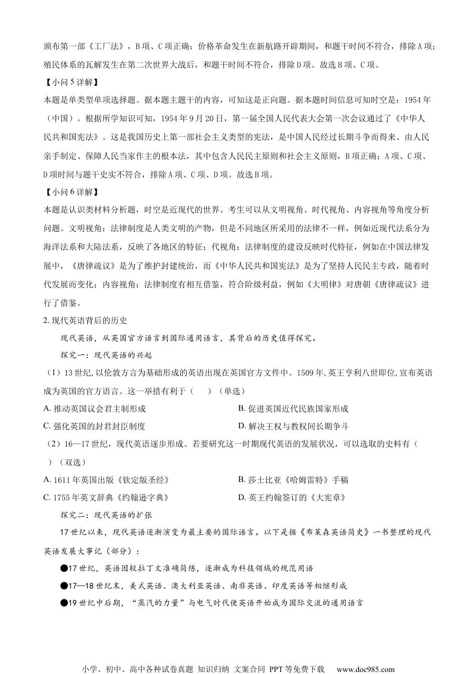 小学、初中、高中各种试卷真题知识归纳文案合同PPT等免费下载www.doc985.com2023学年第一学期质量监控高三历史试卷考生注意:1.考试时间60分钟,试卷满分100分。2.本考试设试卷和答题纸两部分,试卷包括试题与答题要求;所有答题做在答题纸上;做在试卷上一律不得分。3.答题前,务必在答题纸上填写准考证号和姓名等相关信息。4.答题纸与试卷在试题编号上是一一对应的,答题时应特别注意,不能错位。5.本卷采用网上阅卷,请注意书写的端正和规范1.法律制度法律制度是人类文明发展到一定阶段的产物,是国家意志的体现,会随着时代发展不断进步。(1)请将向下列选项与示意图中的区域相对应(填写圈号数字)A._____B._____C._____D._____E._____F._____①《罗马民法大全》②《汉谟拉比法典》③《唐律疏议》④《拿破仑法典》⑤《工厂法》⑥《社会保障法》(2)近代西方法律制度继承和发展了《罗马民法大全》中的一些精神,主要包括()(单选)①保护私有财产②崇尚法治精神③沿袭过往判例④实现人人平等A.②③B.①②C.①③D.③④(3)下列选项反映《唐律疏议》主要特点的有()(双选)A.礼法结合B.乡约教化C.提倡理学D.宣扬孝道(4)《工厂法》颁布的时代背景是()(双选)A.价格革命的影响B.工人运动的出现C.阶级结构的变化D.殖民体系的瓦解小学、初中、高中各种试卷真题知识归纳文案合同PPT等免费下载www.doc985.com(5)第一届全国人大通过的《中华人民共和国宪法》体现了“人民民主原则和社会主义原则”,该宪法颁布于()(单选)A.1949年B.1954年C.1956年D.1978年(6)综合上述内容并结合所学,谈谈对法律制度产生与发展的看法。【答案】(1)①.③.②⑤.③②.④⑥.⑤①.⑥④(2)B(3)AD(4)BC(5)B(6)文明视角:法律制度是人类文明的产物,反映了各地区的特征;时代视角:法律制度的建设反映时代特征,随着时代发展;内容视角:法律制度有相互借鉴,符合阶级利益。(从两个视角评价)【解析】【分析】本题是综合题【小问1详解】根据所学知识可知,A地区是中国,代表的法律是③《唐律疏议》;B地区是英国,代表的法律是⑤《工厂法》;C地区是两河流域,代表的法律是②《汉谟拉比法典》;D地区是美国,代表法律是⑥《社会保障法》;E地区古罗马,代表法律是①《罗马民法大全》;F地是法国,代表法律是④《拿破仑法典》。故填写为:A:③;B:⑤;C:②;D:⑥;E:①;F:④。【小问2详解】本题是单类型单项选择题。据本题主题干的内容,可知这是正向题。据本题时间信息可知时空是:近代的西方。根据所学知识可知,近代西方法律制度继承和发展了《罗马民法大全》中的一些精神,主要包括保护私有财产和崇尚法治精神,①②正确,B项正确;沿袭过往判例属于海洋法系的特点,而《罗马民法大全》属于大陆法系,排除③项,排除A项、C项、D项;近代西方法治理念提倡人人平等,但并未实现人人平等,排除④项,排除D项;故选B项。【小问3详解】本题是单类型双项选择题。据本题主题干的内容,可知这是正向题。据本题时间信息可知时空是:唐代(中国)。根据所学知识可知,《唐律疏议》是礼法结合的典范,如对儒家伦理中的“孝”特别重视,要求维护“孝”的伦理的相关律文有数十条之多,A项、D项正确;宋朝以后,理学在社会上广泛传播,深入社会基层,并以乡约形式直接面向底层百姓宣讲,和题干时间不符合,排除B项;理学出现在宋朝时期,和题干时间不符合,排除C项。故选A项、D项。【小问4详解】本题是单类型双项选择题。据本题主题干的内容,可知这是正向题。据本题时间信息可知时空是:近代的英国。随着工业革命推进,机器生产代替手工劳动,阶级结构发生了变化,出现了工业无产阶级,工业革命创造了社会财富,但是工业无产阶级并未因此而走向富裕,财富流入工业资产阶级手中,贫富差距拉大,工业无产阶级为了争取权利,发起了系列工人运动,在此背景下,英国资产阶级为了缓和矛盾,在1802年小学、初中、高中各种试卷真题知识归纳文案合同PPT等免费下载www.doc985.com颁布第一部《工厂法》,B项、C项正确;价格革命发生在新航路开辟期间,和题干时间不符合,排除A项;殖民体...