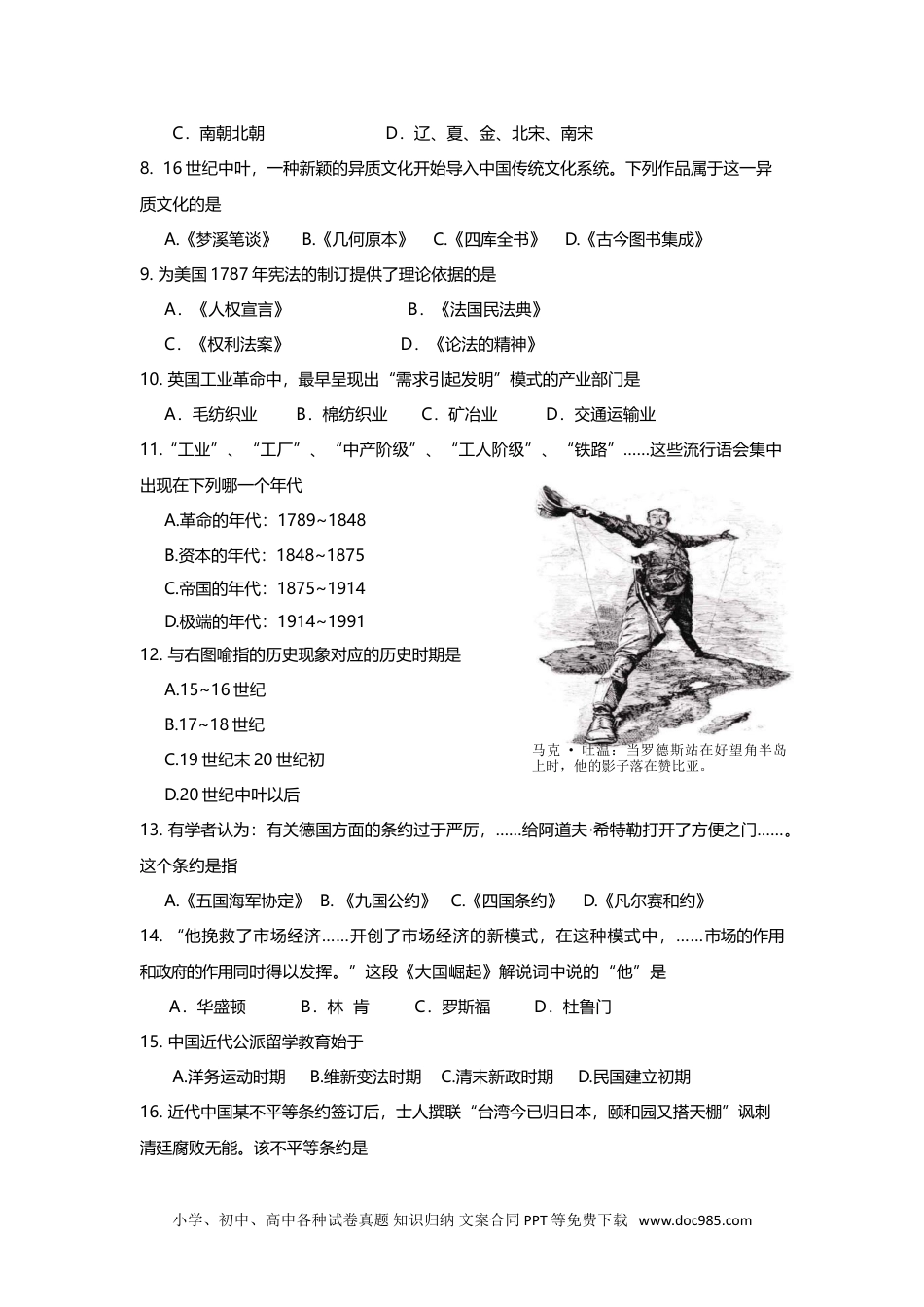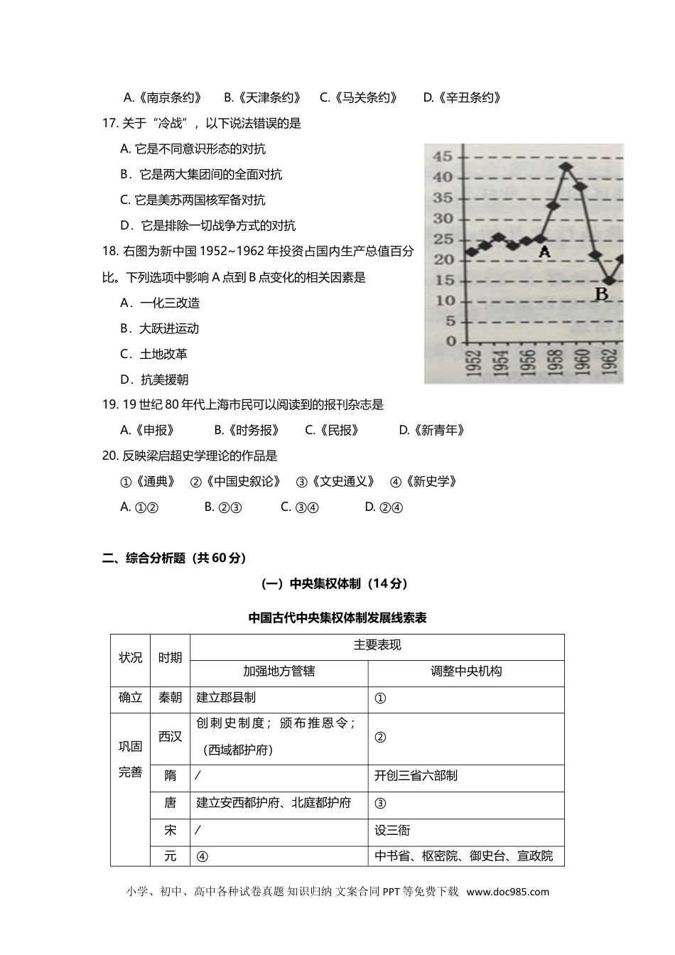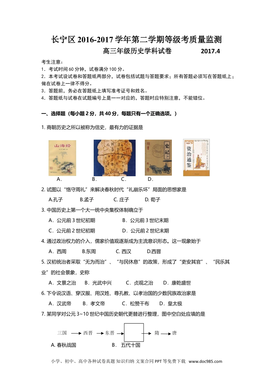 长宁区2016-2017学年第二学期等级考质量监测高三年级历史学科试卷2017.4考生注意:1.考试时间60分钟,试卷满分100分。2.本考试设试卷和答题纸两部分,试卷包括试题与答题要求;所有答题必须写在答题纸上;做在试卷上一律不得分。3.答题前,务必在答题纸上填写准考证号和姓名。4.答题纸与试卷在试题编号上是一一对应的,答题时应特别注意,不能错位。一、选择题(每小题2分,共40分,每题只有一个正确选项。)1.商朝历史之所以被称为信史,最有力的证据是A.B.C.D.2.试图以“恪守周礼”来解决春秋时代“礼崩乐坏”局面的思想家是A.孔子B.孟子C.庄子D.荀子3.中国历史上第一个大一统中央集权体制确立于A.公元前3世纪初期B.公元前3世纪末期C.公元前2世纪初期D.公元前2世纪末期4.通过政治权力的介入,儒家价值观逐渐成为主流意识形态。这一现象始于A.西周B.东周C.西汉D.西晋5.汉初统治者采取“无为而治”、“与民休息”的政策,形成了“吏安其官”、“民乐其业”的社会景象,史称A.文景之治B.光武中兴C.贞观之治D.康乾盛世6.下令说汉语、穿汉服、用汉姓、尊孔教、以孝治国的少数民族政治家是A.汉武帝B.孝文帝C.松赞干布D.皇太极7.某同学对公元3~10世纪中国历史朝代更替进行整理,图中空白处应填的是A.春秋战国B.五代十国小学、初中、高中各种试卷真题知识归纳文案合同PPT等免费下载www.doc985.com三国西晋东晋隋唐C.南朝北朝D.辽、夏、金、北宋、南宋8.16世纪中叶,一种新颖的异质文化开始导入中国传统文化系统。下列作品属于这一异质文化的是A.《梦溪笔谈》B.《几何原本》C.《四库全书》D.《古今图书集成》9.为美国1787年宪法的制订提供了理论依据的是A.《人权宣言》B.《法国民法典》C.《权利法案》D.《论法的精神》10.英国工业革命中,最早呈现出“需求引起发明”模式的产业部门是A.毛纺织业B.棉纺织业C.矿冶业D.交通运输业11.“工业”、“工厂”、“中产阶级”、“工人阶级”、“铁路”……这些流行语会集中出现在下列哪一个年代A.革命的年代:1789~1848B.资本的年代:1848~1875C.帝国的年代:1875~1914D.极端的年代:1914~199112.与右图喻指的历史现象对应的历史时期是A.15~16世纪B.17~18世纪C.19世纪末20世纪初D.20世纪中叶以后13.有学者认为:有关德国方面的条约过于严厉,……给阿道夫·希特勒打开了方便之门……。这个条约是指A.《五国海军协定》B.《九国公约》C.《四国条约》D.《凡尔赛和约》14.“他挽救了市场经济……开创了市场经济的新模式,在这种模式中,……市场的作用和政府的作用同时得以发挥。”这段《大国崛起》解说词中说的“他”是A.华盛顿B.林肯C.罗斯福D.杜鲁门15.中国近代公派留学教育始于A.洋务运动时期B.维新变法时期C.清末新政时期D.民国建立初期16.近代中国某不平等条约签订后,士人撰联“台湾今已归日本,颐和园又搭天棚”讽刺清廷腐败无能。该不平等条约是小学、初中、高中各种试卷真题知识归纳文案合同PPT等免费下载www.doc985.com马克·吐温:当罗德斯站在好望角半岛上时,他的影子落在赞比亚。A.《南京条约》B.《天津条约》C.《马关条约》D.《辛丑条约》17.关于“冷战”,以下说法错误的是A.它是不同意识形态的对抗B.它是两大集团间的全面对抗C.它是美苏两国核军备对抗D.它是排除一切战争方式的对抗18.右图为新中国1952~1962年投资占国内生产总值百分比。下列选项中影响A点到B点变化的相关因素是A.一化三改造B.大跃进运动C.土地改革D.抗美援朝19.19世纪80年代上海市民可以阅读到的报刊杂志是A.《申报》B.《时务报》C.《民报》D.《新青年》20.反映梁启超史学理论的作品是①《通典》②《中国史叙论》③《文史通义》④《新史学》A.①②B.②③C.③④D.②④二、综合分析题(共60分)(一)中央集权体制(14分)中国古代中央集权体制发展线索表状况时期主要表现加强地方管辖调整中央机构确立秦朝建立郡县制①巩固完善西汉创刺史制度;颁布推恩令;(西域都护府)②隋∕开创三省六部制唐建立安西都护府、北庭都护府③宋∕设三衙元④中书省、枢密院、御史台、宣政院小学、初中、高中各种试卷真题知识归纳文案合同PPT...