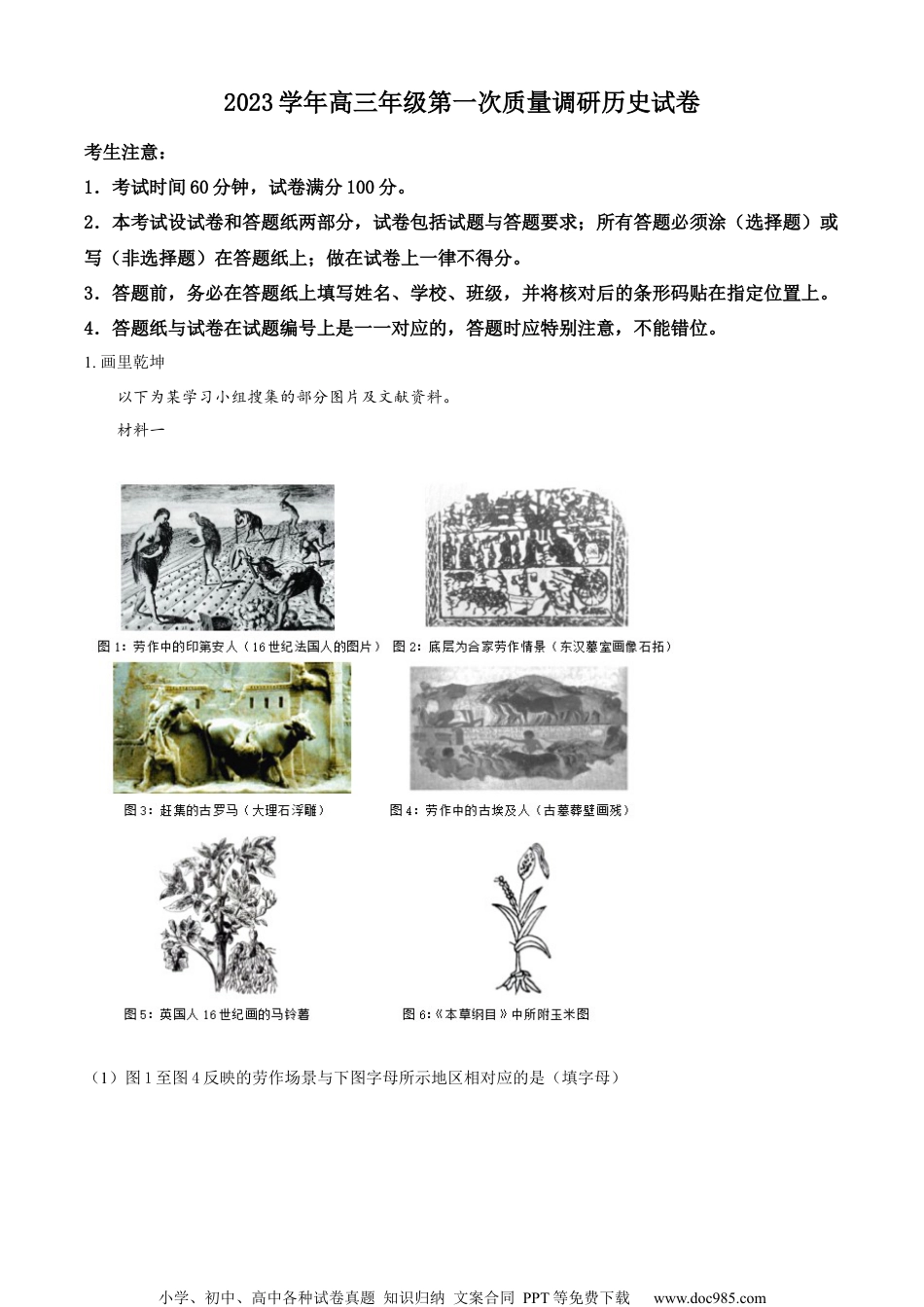 小学、初中、高中各种试卷真题知识归纳文案合同PPT等免费下载www.doc985.com2023学年高三年级第一次质量调研历史试卷考生注意:1.考试时间60分钟,试卷满分100分。2.本考试设试卷和答题纸两部分,试卷包括试题与答题要求;所有答题必须涂(选择题)或写(非选择题)在答题纸上;做在试卷上一律不得分。3.答题前,务必在答题纸上填写姓名、学校、班级,并将核对后的条形码贴在指定位置上。4.答题纸与试卷在试题编号上是一一对应的,答题时应特别注意,不能错位。1.画里乾坤以下为某学习小组搜集的部分图片及文献资料。材料一(1)图1至图4反映的劳作场景与下图字母所示地区相对应的是(填字母)小学、初中、高中各种试卷真题知识归纳文案合同PPT等免费下载www.doc985.com(2)图5、图6物种原产地与上图字母所示地区相对应是(单选)(3)从材料一中6幅图片内容看,该学习小组研究主题最有可能是()(单选)A.生产工具与劳作方式B.日常生活与商业贸易C.食物生产与物种交流D.居住环境与交通变迁(4)图2画像石为1950年江苏睢宁出土。有学者认为最上层是仙人骑鹿,中层为人物会面,下层为合家劳作。该画像石内容透露出东汉社会哪些重要历史信息?材料二17世纪上半叶,英国入侵爱尔兰,捣毁庄稼,致使大多数农作物歉收乃至颗粒无收,唯有生长在地下的马铃薯安然无恙,帮助爱尔兰人度过了荒年。爱尔兰成了以马铃薯为主食的国家。——摘编自《经济与社会生活》邑境山多田少,居民倍增,稻谷不足以给,则于山上种包谷(玉米)、洋芋……之类。深林剪伐殆尽,巨阜危峰,一望皆包谷也。——(清)袁景晖《建始县志》(5)根据材料二,概述马铃薯、玉米传入后对当地社会产生的影响。【答案】(1)DACB(2)D(3)C(4)图片源于东汉墓室画像石,反映东汉事死如生的观念及当时手工业技术水平、艺术特点。上层内容透露当时人们的宗教观念,中层内容透露出贵族生活社交礼仪、社会生活及社会阶层分化。下层透露出经济上家庭为单位的劳作方式,铁器牛耕为主要生产工具和技术。(5)改变了当地的食物结构,如爱尔兰“马铃薯为主食”;丰富了粮食种类,提高了抗饥荒能力,如爱尔兰和中国。对当地生态环境也产生了一定影响,如“深林剪伐殆尽”。【解析】【小问1详解】小学、初中、高中各种试卷真题知识归纳文案合同PPT等免费下载www.doc985.com本题是连线题。根据“印第安人”并结合所学内容可知,印第安人生活在美洲地区,位于图中的D处;根据“东汉墓室”可知与中国有关,位于图中的A处;根据“古罗马人”并结合所学内容可知,古罗马位于古代欧洲,位于图中的C处;根据“古埃及人”并结合所学内容可知,古埃及位于尼罗河流域,位于图中的B处。【小问2详解】本题是连线题。结合所学内容可知,马铃薯和玉米都是原产自美洲的农作物,所以其原产地对应的字母所示地区应该是D处。【小问3详解】本题是单类型单项选择题。据本题主题干的设问词,可知这是正向题。据本题时间信息可知准确时空是古代世界。根据6幅图片的内容和注释可知,这些图片大多与农业劳作、商品贸易、物种交流有关。所以该学习小组研究的主题最有可能是实物生产与物种交流,C项正确;这些图片中没有涉及生产工具,排除A项;图片体现的是劳作生活,而非日常生活,排除B项;这些图片没有体现居住环境,排除D项。故选C项。【小问4详解】本题是特点类材料分析题。时空:东汉时期(中国)。根据画像石内容和所学可知,该画像石为墓葬中的画像,所以反映了东汉事死如生的观念及当时手工业技术水平、艺术特点。上层内容透露当时人们的宗教观念,中层内容透露出贵族生活社交礼仪、社会生活及社会阶层分化。下层透露出经济上家庭为单位的劳作方式,铁器牛耕为主要生产工具和技术。【小问5详解】本题是影响类材料分析题。时空:近代世界。马铃薯、玉米传入当地后的影响:根据“帮助爱尔兰人度过了荒年。爱尔兰成了以马铃薯为主食的国家”、“稻谷不足以给,则于山上种包谷(玉米)、洋芋……之类。深林剪伐殆尽,巨阜危峰,一望皆包谷也”可知,首先是改变了当地的食物结构,如爱尔兰“马铃薯为主食”;马铃薯、玉米的传入丰富了粮食种类,提...