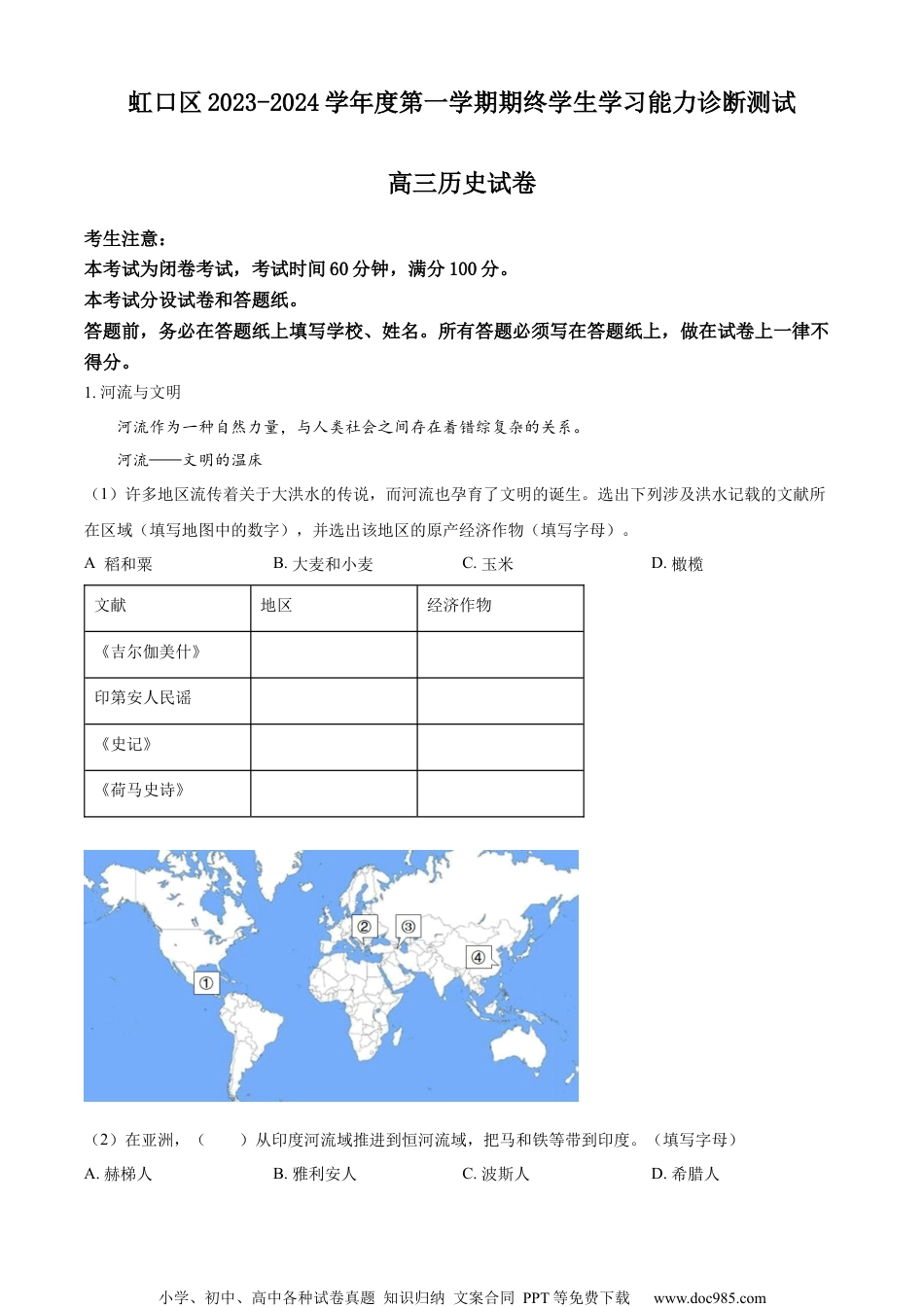 小学、初中、高中各种试卷真题知识归纳文案合同PPT等免费下载www.doc985.com虹口区2023-2024学年度第一学期期终学生学习能力诊断测试高三历史试卷考生注意:本考试为闭卷考试,考试时间60分钟,满分100分。本考试分设试卷和答题纸。答题前,务必在答题纸上填写学校、姓名。所有答题必须写在答题纸上,做在试卷上一律不得分。1.河流与文明河流作为一种自然力量,与人类社会之间存在着错综复杂的关系。河流——文明的温床(1)许多地区流传着关于大洪水的传说,而河流也孕育了文明的诞生。选出下列涉及洪水记载的文献所在区域(填写地图中的数字),并选出该地区的原产经济作物(填写字母)。A.稻和粟B.大麦和小麦C.玉米D.橄榄文献地区经济作物《吉尔伽美什》印第安人民谣《史记》《荷马史诗》(2)在亚洲,()从印度河流域推进到恒河流域,把马和铁等带到印度。(填写字母)A.赫梯人B.雅利安人C.波斯人D.希腊人小学、初中、高中各种试卷真题知识归纳文案合同PPT等免费下载www.doc985.com(3)密西西比河贯穿于整个美国历史进程中,填写完成下列时间轴。(4)1938年6月,国民政府炸开花园口黄河大堤,以打破敌军的作战计划。但同时也淹没了河南、皖北等地区大片土地,给广大民众造成极大灾难。该事件发生与哪场战争有关?(5)综合以上材料和所学,谈谈你对河流与人类文明关系的看法。2.大食物观党的二十大报告中指出:“树立大食物观,……构建多元化食物供给体系。”其有着深厚历史渊源,是传统与当代、历史与现实的有机统一。材料一:仓廪实而知礼节,衣食足而知荣辱。——《管子•牧民》食者,民之本也。——《淮南子•主书训》国家大本,足食为先。——《宋史•宋太宗二》材料二:藕与蜜同食,可以休粮。——宋《续博物志》令天下卫所屯田军士人树桑百根,随地宜植柿、栗、胡桃等物,以备岁歉。——《明大政记》三月采食天坛之龙须菜,味极清美;香椿芽拌面筋,嫩柳叶拌豆腐,乃寒食之佳品。——清《帝京岁时纪胜》材料三:大生产呀么嗬咳……军队和人民齐动员呀么嗬咳……人问我什么队伍……八路军呀么嗬咳……自己动手么嗬咳……丰衣足食么嗬咳……加紧生产……为抗战呀么嗬咳。——歌曲《军民大生产》(1942-1943年)我们的家乡,在希望的田野上……一片冬麦那个一片高粱,十里哟荷塘,十里果香……禾苗在农民的汗水里抽穗……牛羊在牧人的笛声中成长……我们世世代代,在这田野上劳动,为她幸福,为她增光。——歌曲《在希望的田野上》(1981年)(1)材料一分别从哪些角度论证了食物的重要性?小学、初中、高中各种试卷真题知识归纳文案合同PPT等免费下载www.doc985.com(2)根据材料二,中国古代食物来源包括哪些种类?(3)材料三是诞生在不同年代歌曲的歌词选段,说出歌曲分别歌颂的历史事件。(4)写出材料三中歌词的史料价值。(5)根据材料一、二、三,总结“大食物观”的历史渊源。(6)根据选必二第一单元《食物生产与社会生活》的学习,为大家践行“大食物观”献计献策。3.奥斯曼帝国的兴衰小唐在了解奥斯曼帝国兴起时,对以下观点产生了好奇:材料一:奥斯曼帝国在建立和不断扩张的过程中,威胁到东西方之间陆路贸易通道的安全,也使来自亚洲的商品因加价而奇贵,……这也成为激励西欧人出海远航的一个动因。围绕该问题,小唐寻找了以下材料:材料二:奥斯曼帝国扩张表(部分)时间扩张情况1354年土耳其人开始进入欧洲。1453年攻陷君士坦丁堡,原本统治此处的①帝国宣告灭亡。1516-1517年先后占领叙利亚、巴勒斯坦、埃及等地。材料三:葡萄牙海外探险活动情况表(部分)时间葡萄牙海外探险情况1415年国王率远征军进攻摩洛哥北部港口城市休达1443年首次驶过非洲西海岸博哈多尔角1462年定居于非洲海岸附近的佛得角群岛(位于北大西洋)1469年组织人员探险抵达西非加纳等地1487迪亚士绕过非洲南端好旺角,到达非洲东海岸小学、初中、高中各种试卷真题知识归纳文案合同PPT等免费下载www.doc985.com年材料四:古代商业贸易路线图小唐发现奥斯曼帝国的衰落也引起了近代国人的关注。材料五:俄土之战,土危亡矣……事事受列国钳制。……土耳其独立,利在与吾交通。吾即...