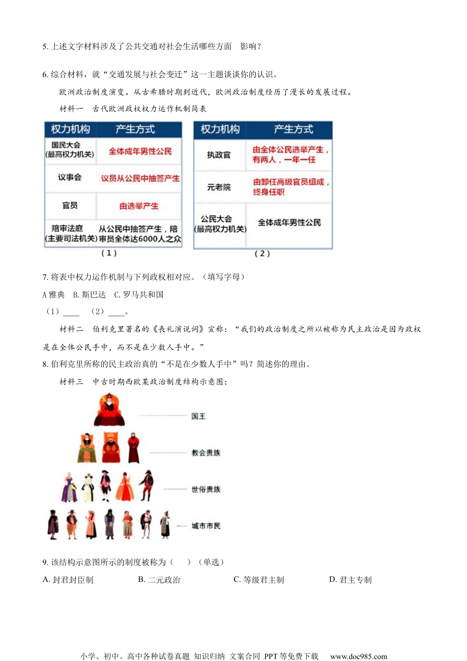 小学、初中、高中各种试卷真题知识归纳文案合同PPT等免费下载www.doc985.com2023-2024学年上海奉贤区第一学期高三期末历史练习卷考生注意:1.考试时间60分钟,试卷满分100分。2.本考试设试卷和答题纸两部分,试卷包括试题与答题要求;所有答题必须涂(选择题)或写(非选择题)在答题纸上;做在试卷上一律不得分。3.答题前,务必在答题纸上填写准考证号和姓名,并将核对后的条形码贴在指定位置。4.答题纸与试卷在试题编号上是一一对应的,答题时应特别注意,不能错位。双选题有两个正确选项,全部选对得满分,多选少选不得分。交通发展与社会变迁。1.以下是人类历史上出现过的交通工具。请按照其出现的先后顺序进行排列。(填写字母)A.“黄鹄号”轮船(模型)B.C919大型客机C.福特T型汽车D.史蒂芬孙制造的蒸汽机车2.近代以来,交通工具发生了重大变革,引发其变革的重要原因是____。(填写历史事件)3.人类在漫长的历史中曾不断探索海洋。下列关于人类对海洋的探索从区域扩展到全球的条件表述正确的是()(双选)A.造船技术的改进B.对海洋资源的渴求C.丝绸之路的拓展D.星盘的出现与使用4.下列运河中,改变了全球航运格局,降低了东西方物资交流成本的是()(双选)A.京杭大运河B.米迪运河C.苏伊士运河D.巴拿马运河材料1922年上海的公共汽车公司的营业广告:“要求事业速成,必须交通便利,要求事业速成,必须时间经济……愈来愈省时间,有利于农工商学各界”。在《上海电车公司章程及守则》中就有乘客不准在车上吸烟,不准在车上吐痰,不准妨碍他人,不准与司机谈话,醉酒、衣衫污秽及患有传染病者不准登车等规定。上海电车开通以后,最初的两条电车线路将上海的工业区和两个租界的西区、外滩等分处东西的外侨社区连接起来,从而使原来比较分散的各区域成为了一个具有紧密联系的整体。在电车交通的带动下,上海西区得以迅速开发起来。——鲍成志《试论新式公共交通兴起与近代中国城市发展》小学、初中、高中各种试卷真题知识归纳文案合同PPT等免费下载www.doc985.com5.上述文字材料涉及了公共交通对社会生活哪些方面的影响?6.综合材料,就“交通发展与社会变迁”这一主题谈谈你的认识。欧洲政治制度演变。从古希腊时期到近代,欧洲政治制度经历了漫长的发展过程。材料一古代欧洲政权权力运作机制简表7.将表中权力运作机制与下列政权相对应。(填写字母)A.雅典B.斯巴达C.罗马共和国(1)____。(2)____。材料二伯利克里著名的《丧礼演说词》宣称:“我们的政治制度之所以被称为民主政治是因为政权是在全体公民手中,而不是在少数人手中。”8.伯利克里所称的民主政治真的“不是在少数人手中”吗?简述你的理由。材料三中古时期西欧某政治制度结构示意图:9.该结构示意图所示的制度被称为()(单选)A.封君封臣制B.二元政治C.等级君主制D.君主专制小学、初中、高中各种试卷真题知识归纳文案合同PPT等免费下载www.doc985.com10.由各阶层集中在一起决策的机构,在英国被称为____,在法国则称为____。(两空均为单选)A.议会B.制宪会议C.大陆会议D.三级会议材料四1.凡未经议会同意,以国王权威停止法律或停止法律实施之僭越权力,为非法权力。4.凡未经议会准许,借口国王特权,为国王而征收,或供国王使用而征收金钱,超出议会准许之时限或方式者,皆为非法。6.除经议会同意外,平时在本王国内征募或维持常备军,皆属违法。——1688年《权利法案》11.《权利法案》是如何构建英国政治制度的?12.综合上述材料,你认为西方国家政治制度发展有着怎样的历史传承?“黄河宁,天下平”。自古以来,黄河与中华民族的生存发展息息相关。它哺育了中华儿女,更以自己特有的影响力塑造着中华民族。材料一古代中国的黄河祭祀殷商时期甲骨卜辞中,关于黄河祭祀的记载达五百多条。殷人每年都要举行多次黄河祭祀活动,以求雨、求年。春秋战国人们祈求战争胜利、结盟和立誓等,都会“沉璧于河”,请求河神保佑或见证。宋元宋代河患屡发,对河神的敬畏和崇拜愈发深厚,河神庙在史籍中的记载也越来越多。元代祭祀黄河,祈求风调雨顺、国泰民安。清朝有清一代是黄河泛滥较为频繁的一段时期,为保安澜...