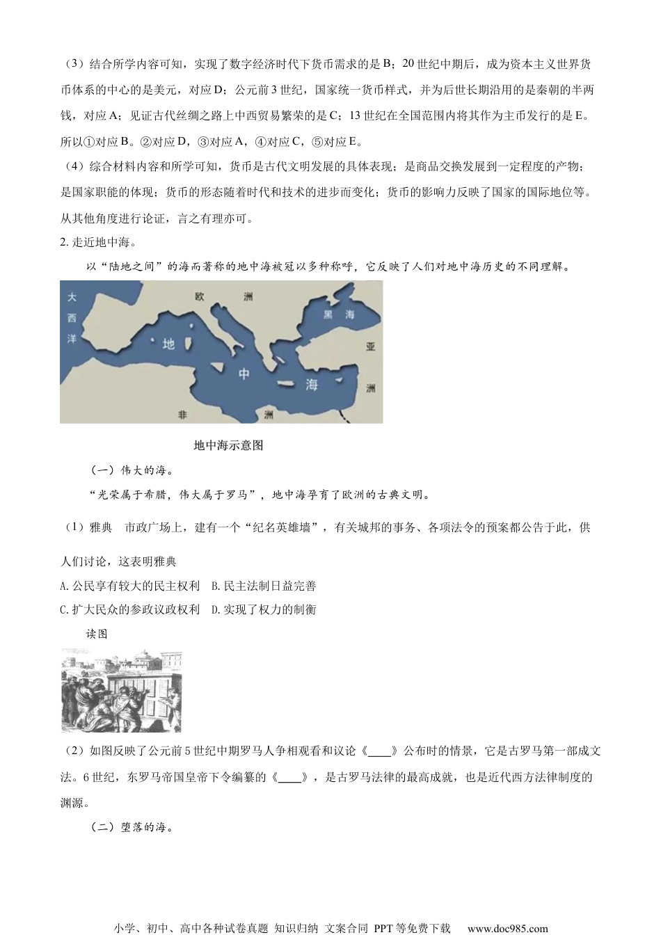 小学、初中、高中各种试卷真题知识归纳文案合同PPT等免费下载www.doc985.com历史练习卷1.货币之语。货币在人类社会中扮演着十分重要的角色,是人类历史发展的缩影。让我们通过以下活动,聆听“货币之语”。活动一:A.苏美尔债务货币B.印第安贝壳珠串C.商朝铜贝(1)将考古发现的早期货币与地图所示的文明区域相匹配。活动二:从文献著述中探讨货币功能。“农工商交易之路通,而龟贝金钱刀布之币行焉。”——司马迁“货币是为了解决交换中的困难而产生的,它是一种‘中介的货物’。”——亚里士多德(2)以上材料揭示了货币早期的功能有(双选)A.价值尺度B.流通手段C.贮藏手段D.世界货币活动三:小学、初中、高中各种试卷真题知识归纳文案合同PPT等免费下载www.doc985.com图片说明①实现数字经济时代下的货币需求②20世纪中期后,成为资本主义世界货币体系的中心③公元前3世纪,国家统一货币样式,并为后世长期沿用④见证古代丝绸之路上中西贸易的繁荣⑤13世纪在全国范围内将其作为主币发行(3)将图片与相关说明一一对应(填涂字母)(4)活动小结:结合以上材料,简述“货币之语”传递了哪些信息?【答案】(1)①A②C③B。(2)A、B。(3)BDACE。(4)是古代文明发展的具体表现;是商品交换发展到一定程度的产物;是国家职能的体现;货币的形态随着时代和技术的进步而变化;货币的影响力反映了国家的国际地位等。(任2,与材料相关的其它答案酌情赋分)【解析】【详解】(1)结合所学内容可知,苏美尔位于两河流域,所以苏美尔的债务货币对应①;印第安贝壳珠串对应的是③,商朝是黄河流域的文明,所以商朝铜贝对应的是③。(2)根据“农工商交易之路通”、“货币是为了解决交换中的困难而产生的”可知货币早期的功能有价值尺度和流通手段。没有体现其具有贮藏手段和世界货币的功能。小学、初中、高中各种试卷真题知识归纳文案合同PPT等免费下载www.doc985.com(3)结合所学内容可知,实现了数字经济时代下货币需求的是B;20世纪中期后,成为资本主义世界货币体系的中心的是美元,对应D;公元前3世纪,国家统一货币样式,并为后世长期沿用的是秦朝的半两钱,对应A;见证古代丝绸之路上中西贸易繁荣的是C;13世纪在全国范围内将其作为主币发行的是E。所以①对应B。②对应D,③对应A,④对应C,⑤对应E。(4)综合材料内容和所学可知,货币是古代文明发展的具体表现;是商品交换发展到一定程度的产物;是国家职能的体现;货币的形态随着时代和技术的进步而变化;货币的影响力反映了国家的国际地位等。从其他角度进行论证,言之有理亦可。2.走近地中海。以“陆地之间”的海而著称的地中海被冠以多种称呼,它反映了人们对地中海历史的不同理解。(一)伟大的海。“光荣属于希腊,伟大属于罗马”,地中海孕育了欧洲的古典文明。(1)雅典的市政广场上,建有一个“纪名英雄墙”,有关城邦的事务、各项法令的预案都公告于此,供人们讨论,这表明雅典A.公民享有较大的民主权利B.民主法制日益完善C.扩大民众的参政议政权利D.实现了权力的制衡读图(2)如图反映了公元前5世纪中期罗马人争相观看和议论《____》公布时的情景,它是古罗马第一部成文法。6世纪,东罗马帝国皇帝下令编纂的《____》,是古罗马法律的最高成就,也是近代西方法律制度的渊源。(二)堕落的海。小学、初中、高中各种试卷真题知识归纳文案合同PPT等免费下载www.doc985.com“在这千年之中,人类的意识处于梦寐或半睡醒状态”,有史家认为这一时期是“黑暗的时代”,地中海成为“堕落的海”。材料一“无论如何,中世纪都不是一个沉睡的、可怕的时代,而是一个充满变化的时代。公元600年的欧洲和公元1000年或1400年的欧洲有着截然不同的景象。”——朱迪斯·M·本内特《欧洲中世纪史》材料二(3)材料二的图片中能印证材料一“不同景象”的是:____和____。(填涂字母)(4)结合上述两则材料,联系史实谈谈对“堕落的海”的认识。(三)智慧的海。地中海见证了无数哲人、先贤的诞生。(5)请梳理西方人文主义的发展历程,完成表格。(填涂字母)代表人物作品或主张苏格拉底①②真理高于一切但丁《神曲》马丁·路德③孟...