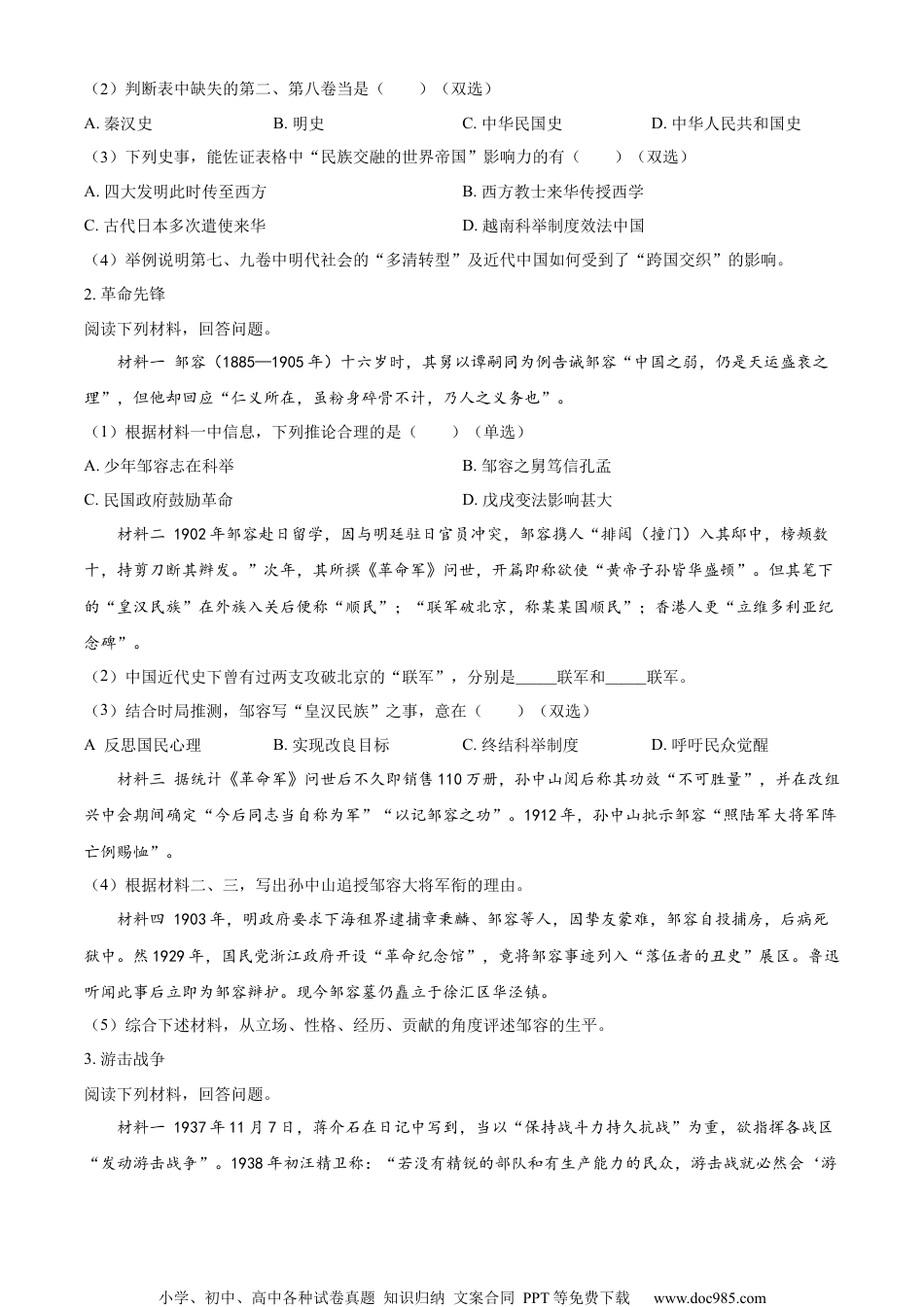 小学、初中、高中各种试卷真题知识归纳文案合同PPT等免费下载www.doc985.com2023学年第二学期徐汇区学习能力诊断卷高三历史试卷考生注意:本次考试为闭卷考试,考试时间60分钟,满分100分。答题前,务必在答题纸下正确填写学校、姓名和考号,在试卷下答题一律不得分。答题纸与试卷的试题编号一一对应,答题时应特别注意,不能错位。1.史界新说《联经中国史》共九卷,每卷“标题”所注之“副标题”彰显了史家对这一时代的认识。(1)据下表提示,填入适当选项,使“标题”与“副标题”相对应。(填涂字母)卷目标题副标题第一卷下古史①第三卷②华丽的贵族时代第四卷隋唐五代史③第五卷④传统的延续与变迁第六卷⑤⑥第七卷明史多清转型的华夏再造第九卷近代史跨国交织下的帝国命运A.多族群视角的古代文明B.宋史C.魏晋南北朝史D.民族交融的世界帝国E.辽金清史F.北南角力中的新秩序小学、初中、高中各种试卷真题知识归纳文案合同PPT等免费下载www.doc985.com(2)判断表中缺失的第二、第八卷当是()(双选)A.秦汉史B.明史C.中华民国史D.中华人民共和国史(3)下列史事,能佐证表格中“民族交融的世界帝国”影响力的有()(双选)A.四大发明此时传至西方B.西方教士来华传授西学C.古代日本多次遣使来华D.越南科举制度效法中国(4)举例说明第七、九卷中明代社会的“多清转型”及近代中国如何受到了“跨国交织”的影响。2.革命先锋阅读下列材料,回答问题。材料一邹容(1885—1905年)十六岁时,其舅以谭嗣同为例告诫邹容“中国之弱,仍是天运盛衰之理”,但他却回应“仁义所在,虽粉身碎骨不计,乃人之义务也”。(1)根据材料一中信息,下列推论合理的是()(单选)A.少年邹容志在科举B.邹容之舅笃信孔孟C.民国政府鼓励革命D.戊戌变法影响甚大材料二1902年邹容赴日留学,因与明廷驻日官员冲突,邹容携人“排闼(撞门)入其邸中,榜颊数十,持剪刀断其辫发。”次年,其所撰《革命军》问世,开篇即称欲使“黄帝子孙皆华盛顿”。但其笔下的“皇汉民族”在外族入关后便称“顺民”;“联军破北京,称某某国顺民”;香港人更“立维多利亚纪念碑”。(2)中国近代史下曾有过两支攻破北京的“联军”,分别是_____联军和_____联军。(3)结合时局推测,邹容写“皇汉民族”之事,意在()(双选)A.反思国民心理B.实现改良目标C.终结科举制度D.呼吁民众觉醒材料三据统计《革命军》问世后不久即销售110万册,孙中山阅后称其功效“不可胜量”,并在改组兴中会期间确定“今后同志当自称为军”“以记邹容之功”。1912年,孙中山批示邹容“照陆军大将军阵亡例赐恤”。(4)根据材料二、三,写出孙中山追授邹容大将军衔的理由。材料四1903年,明政府要求下海租界逮捕章秉麟、邹容等人,因挚友蒙难,邹容自投捕房,后病死狱中。然1929年,国民党浙江政府开设“革命纪念馆”,竟将邹容事迹列入“落伍者的丑史”展区。鲁迅听闻此事后立即为邹容辩护。现今邹容墓仍矗立于徐汇区华泾镇。(5)综合下述材料,从立场、性格、经历、贡献的角度评述邹容的生平。3.游击战争阅读下列材料,回答问题。材料一1937年11月7日,蒋介石在日记中写到,当以“保持战斗力持久抗战”为重,欲指挥各战区“发动游击战争”。1938年初汪精卫称:“若没有精锐的部队和有生产能力的民众,游击战就必然会‘游小学、初中、高中各种试卷真题知识归纳文案合同PPT等免费下载www.doc985.com而不击’”。年底,汪精卫投敌。(1)据材料一,结合所学,判断下列说法的正误,正确的填涂A,错误的填涂B。①蒋介石书写日记当日,或听闻日军部队逼近陪都重庆的消息………………()②汪精卫的表态足以证明他对叛国投敌一事早已有多年的预谋………………()③蒋介石和汪精卫都认为发动游击战争应当是抗日的有效手段………………()④在全面抗战爆发之初国民党内部各派便呈现矛盾重重的态势………………()材料二1939年,国民党方面诬称:“共产党口是心非,游而不击”。1940年蒋介石在“全国军以下参谋长会议”下污蔑第十八集团军“游而不击、袭击友军、包庇叛军”。(2)下列史实能有力驳斥材料二中所谓中共“游而不击”言论的有()(双...