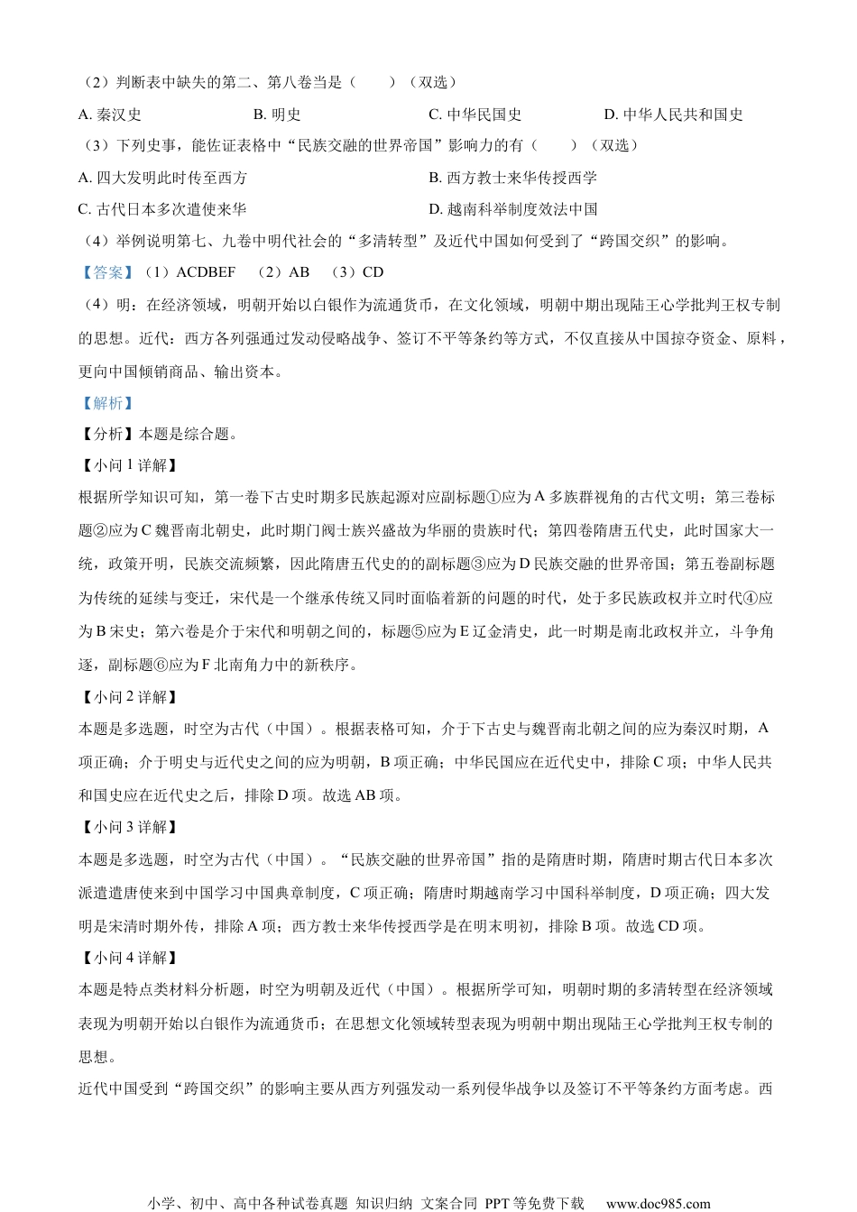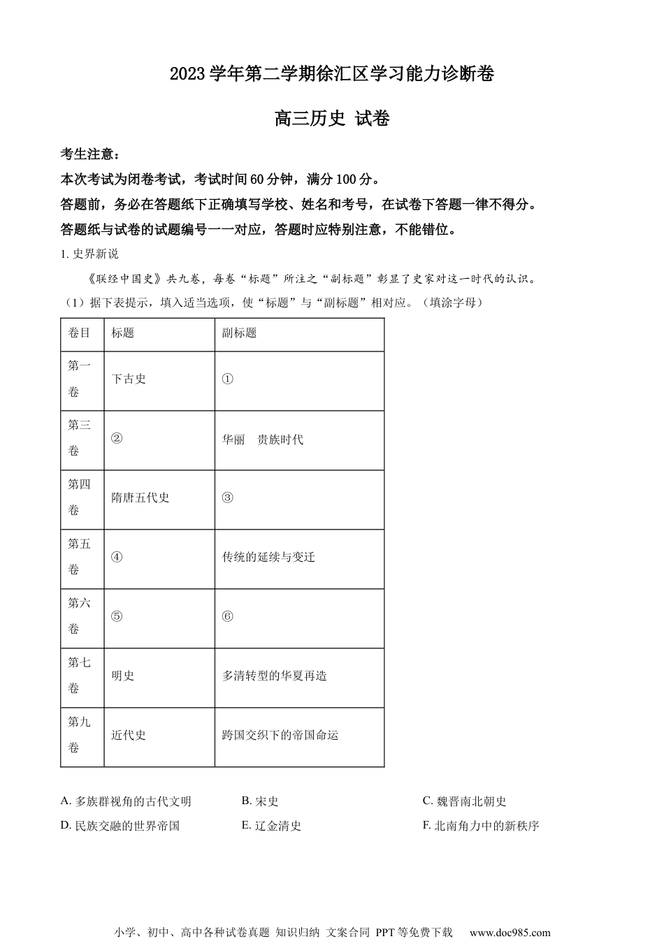 小学、初中、高中各种试卷真题知识归纳文案合同PPT等免费下载www.doc985.com2023学年第二学期徐汇区学习能力诊断卷高三历史试卷考生注意:本次考试为闭卷考试,考试时间60分钟,满分100分。答题前,务必在答题纸下正确填写学校、姓名和考号,在试卷下答题一律不得分。答题纸与试卷的试题编号一一对应,答题时应特别注意,不能错位。1.史界新说《联经中国史》共九卷,每卷“标题”所注之“副标题”彰显了史家对这一时代的认识。(1)据下表提示,填入适当选项,使“标题”与“副标题”相对应。(填涂字母)卷目标题副标题第一卷下古史①第三卷②华丽的贵族时代第四卷隋唐五代史③第五卷④传统的延续与变迁第六卷⑤⑥第七卷明史多清转型的华夏再造第九卷近代史跨国交织下的帝国命运A.多族群视角的古代文明B.宋史C.魏晋南北朝史D.民族交融的世界帝国E.辽金清史F.北南角力中的新秩序小学、初中、高中各种试卷真题知识归纳文案合同PPT等免费下载www.doc985.com(2)判断表中缺失的第二、第八卷当是()(双选)A.秦汉史B.明史C.中华民国史D.中华人民共和国史(3)下列史事,能佐证表格中“民族交融的世界帝国”影响力的有()(双选)A.四大发明此时传至西方B.西方教士来华传授西学C.古代日本多次遣使来华D.越南科举制度效法中国(4)举例说明第七、九卷中明代社会的“多清转型”及近代中国如何受到了“跨国交织”的影响。【答案】(1)ACDBEF(2)AB(3)CD(4)明:在经济领域,明朝开始以白银作为流通货币,在文化领域,明朝中期出现陆王心学批判王权专制的思想。近代:西方各列强通过发动侵略战争、签订不平等条约等方式,不仅直接从中国掠夺资金、原料,更向中国倾销商品、输出资本。【解析】【分析】本题是综合题。【小问1详解】根据所学知识可知,第一卷下古史时期多民族起源对应副标题①应为A多族群视角的古代文明;第三卷标题②应为C魏晋南北朝史,此时期门阀士族兴盛故为华丽的贵族时代;第四卷隋唐五代史,此时国家大一统,政策开明,民族交流频繁,因此隋唐五代史的的副标题③应为D民族交融的世界帝国;第五卷副标题为传统的延续与变迁,宋代是一个继承传统又同时面临着新的问题的时代,处于多民族政权并立时代④应为B宋史;第六卷是介于宋代和明朝之间的,标题⑤应为E辽金清史,此一时期是南北政权并立,斗争角逐,副标题⑥应为F北南角力中的新秩序。【小问2详解】本题是多选题,时空为古代(中国)。根据表格可知,介于下古史与魏晋南北朝之间的应为秦汉时期,A项正确;介于明史与近代史之间的应为明朝,B项正确;中华民国应在近代史中,排除C项;中华人民共和国史应在近代史之后,排除D项。故选AB项。【小问3详解】本题是多选题,时空为古代(中国)。“民族交融的世界帝国”指的是隋唐时期,隋唐时期古代日本多次派遣遣唐使来到中国学习中国典章制度,C项正确;隋唐时期越南学习中国科举制度,D项正确;四大发明是宋清时期外传,排除A项;西方教士来华传授西学是在明末明初,排除B项。故选CD项。【小问4详解】本题是特点类材料分析题,时空为明朝及近代(中国)。根据所学可知,明朝时期的多清转型在经济领域表现为明朝开始以白银作为流通货币;在思想文化领域转型表现为明朝中期出现陆王心学批判王权专制的思想。近代中国受到“跨国交织”的影响主要从西方列强发动一系列侵华战争以及签订不平等条约方面考虑。西小学、初中、高中各种试卷真题知识归纳文案合同PPT等免费下载www.doc985.com方各列强通过发动侵略战争、签订不平等条约等方式,不仅直接从中国掠夺资金、原料,更向中国倾销商品、输出资本。2.革命先锋阅读下列材料,回答问题。材料一邹容(1885—1905年)十六岁时,其舅以谭嗣同为例告诫邹容“中国之弱,仍是天运盛衰之理”,但他却回应“仁义所在,虽粉身碎骨不计,乃人之义务也”。(1)根据材料一中信息,下列推论合理的是()(单选)A.少年邹容志在科举B.邹容之舅笃信孔孟C.民国政府鼓励革命D.戊戌变法影响甚大材料二1902年邹容赴日留学,因与明廷驻日官员冲突,邹容携人“排闼(撞门)入其邸中,榜颊数十,持剪刀断其辫发。”次年,其所撰《革命军》...