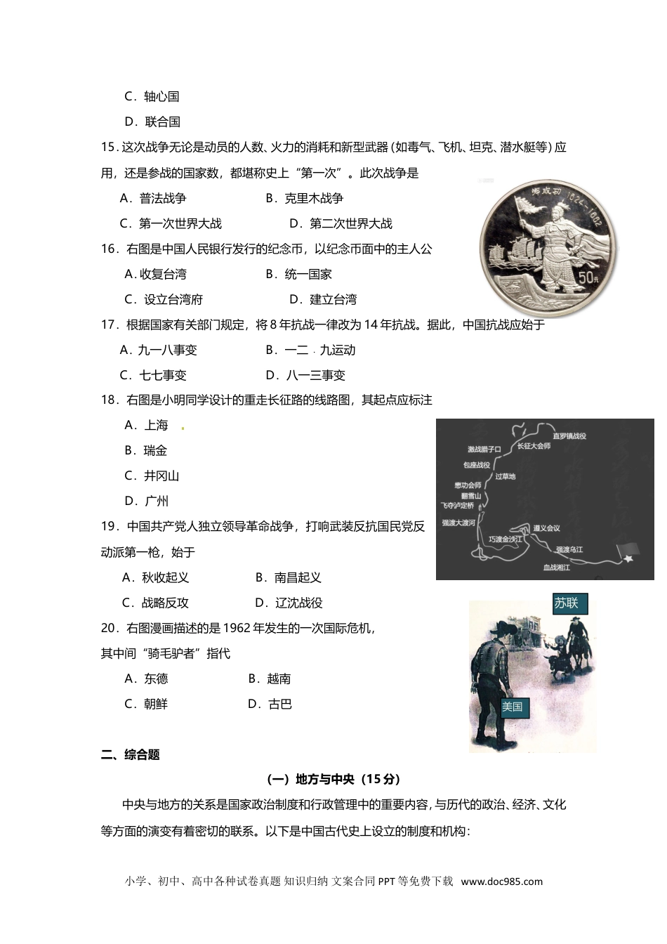 浦东新区2016-2017学年第二学期等级考质量监测高三年级历史学科试卷2017.4考生注意:1.考试时间60分钟,试卷满分100分。2.本考试设试卷和答题纸两部分,试卷包括试题与答题要求;所有答题必须写在答题纸上;做在试卷上一律不得分。3.答题前,务必在答题纸上填写准考证号和姓名。4.答题纸与试卷在试题编号上是一一对应的,答题时应特别注意,不能错位。一、选择题(共20题,每题2分。每题只有一个正确答案,请将代表该答案的选项字母做在答题纸上,做在试卷上没有分数。)1.近代以来,堪称中华民族文化认同的符号应是A.炎黄子孙B.四大发明C.《四库全书》D.中央集权2.汉武帝时代,执掌政务的政府机关是A.内朝B.外朝C.中朝D.刺史3.在《史记》与《资治通鉴》中,下列历史都有记述的是A.殷墟甲骨B.封邦建国C.秦朝统一D.光武中兴4.观察右图,当时中国的首都位于A.①B.②C.③D.④5.朱元璋曾言“慨念生民,久陷于胡,倡义举兵,恢复中原。”文中的“胡”是指A.匈奴人B.契丹人C.女真人D.蒙古人6.在下列遗址中,有可能存在稻谷遗存的是A.临潼姜寨B.上海崧泽C.偃师二里头D.安阳殷墟7.下列著作汇聚了大多数启蒙思想家及其理念的是A.《论法的精神》B.《政府论》C.《社会契约论》D.《百科全书》小学、初中、高中各种试卷真题知识归纳文案合同PPT等免费下载www.doc985.com①②③④8.右图油画真实地再现了100年前的某一历史场景。这一场景是A.攻占巴士底狱B.武昌起义C.萨拉热窝事件D.彼得格勒武装起义9.19世界50年代,生活在北方的美国人更多地倾向于支持联邦政府A.降低关税B.提高关税C.发展奴隶贸易D.严禁开发西部10.观察右图,该漫画反映的场景最可能发生在A.英国革命前B.法国大革命前C.美国独立战争后D.工业革命后11.咸丰帝在逃亡路上,曾谕令奕䜣“与该夷将本年所议续约,画押盖印,并将八年天津和约互换”。文中所言的“续约”是指A.《天津条约》B.《北京条约》C.《马关条约》D.《辛丑条约》12.观察右图,漫画中的“内乱”主要是指A.二次革命B.护国运动C.新文化运动D.五四运动13.从地理看,非洲、美洲和大洋洲等地区是客观存在着的,而西方学者却一直用“发现”一词来叙述他们在这些地区的早期活动。此叙事所持的观念是A.唯物史观B.英雄史观C.欧洲中心论D.历史进化论14.右图所示是19世纪末的国际形势,图中以三角形串联起来的国家,组建成了A.协约国B.同盟国小学、初中、高中各种试卷真题知识归纳文案合同PPT等免费下载www.doc985.com美国苏联C.轴心国D.联合国15.这次战争无论是动员的人数、火力的消耗和新型武器(如毒气、飞机、坦克、潜水艇等)应用,还是参战的国家数,都堪称史上“第一次”。此次战争是A.普法战争B.克里木战争C.第一次世界大战D.第二次世界大战16.右图是中国人民银行发行的纪念币,以纪念币面中的主人公A.收复台湾B.统一国家C.设立台湾府D.建立台湾17.根据国家有关部门规定,将8年抗战一律改为14年抗战。据此,中国抗战应始于A.九一八事变B.一二﹒九运动C.七七事变D.八一三事变18.右图是小明同学设计的重走长征路的线路图,其起点应标注A.上海B.瑞金C.井冈山D.广州19.中国共产党人独立领导革命战争,打响武装反抗国民党反动派第一枪,始于A.秋收起义B.南昌起义C.战略反攻D.辽沈战役20.右图漫画描述的是1962年发生的一次国际危机,其中间“骑毛驴者”指代A.东德B.越南C.朝鲜D.古巴二、综合题(一)地方与中央(15分)中央与地方的关系是国家政治制度和行政管理中的重要内容,与历代的政治、经济、文化等方面的演变有着密切的联系。以下是中国古代史上设立的制度和机构:小学、初中、高中各种试卷真题知识归纳文案合同PPT等免费下载www.doc985.comA.郡县制B.刺史制C.行省制D.内阁E.三省六部制F.枢密院G.军机处问题:21.从历史看,其设立之初主要为了加强对地方管理的是(填入字母);为了强化君主权力的是(填入字母)。(7分)22.结合上述选项,完成下列填空(8分)。(1)其基本架构在中国历史上延续时间最久的是。(2)由中央派遣官员以加强对地方的...
