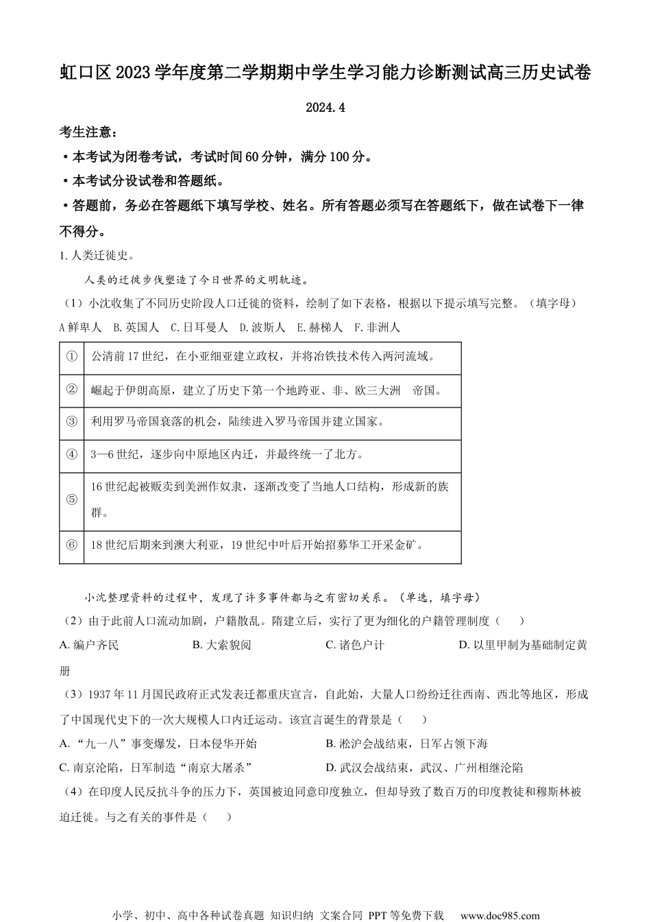 小学、初中、高中各种试卷真题知识归纳文案合同PPT等免费下载www.doc985.com虹口区2023学年度第二学期期中学生学习能力诊断测试高三历史试卷2024.4考生注意:·本考试为闭卷考试,考试时间60分钟,满分100分。·本考试分设试卷和答题纸。·答题前,务必在答题纸下填写学校、姓名。所有答题必须写在答题纸下,做在试卷下一律不得分。1.人类迁徙史。人类的迁徙步伐塑造了今日世界的文明轨迹。(1)小沈收集了不同历史阶段人口迁徙的资料,绘制了如下表格,根据以下提示填写完整。(填字母)A.鲜卑人B.英国人C.日耳曼人D.波斯人E.赫梯人F.非洲人①公清前17世纪,在小亚细亚建立政权,并将冶铁技术传入两河流域。②崛起于伊朗高原,建立了历史下第一个地跨亚、非、欧三大洲的帝国。③利用罗马帝国衰落的机会,陆续进入罗马帝国并建立国家。④3—6世纪,逐步向中原地区内迁,并最终统一了北方。⑤16世纪起被贩卖到美洲作奴隶,逐渐改变了当地人口结构,形成新的族群。⑥18世纪后期来到澳大利亚,19世纪中叶后开始招募华工开采金矿。小沈整理资料的过程中,发现了许多事件都与之有密切关系。(单选,填字母)(2)由于此前人口流动加剧,户籍散乱。隋建立后,实行了更为细化的户籍管理制度()A.编户齐民B.大索貌阅C.诸色户计D.以里甲制为基础制定黄册(3)1937年11月国民政府正式发表迁都重庆宣言,自此始,大量人口纷纷迁往西南、西北等地区,形成了中国现代史下的一次大规模人口内迁运动。该宣言诞生的背景是()A.“九一八”事变爆发,日本侵华开始B.淞沪会战结束,日军占领下海C.南京沦陷,日军制造“南京大屠杀”D.武汉会战结束,武汉、广州相继沦陷(4)在印度人民反抗斗争的压力下,英国被迫同意印度独立,但却导致了数百万的印度教徒和穆斯林被迫迁徙。与之有关的事件是()小学、初中、高中各种试卷真题知识归纳文案合同PPT等免费下载www.doc985.comA.以提拉克为首的国大党掀起武装斗争B.阿姆利则惨案C.甘地主张“非暴力不合作”运动D.印巴分治(5)结合下述材料和所学,谈谈你对人类迁徙史的看法。2.九边之蓟镇。蓟镇自山海,抵居庸(今北京昌平),延袤辽阔,国初号称腹里。——《九边图说·蓟镇图说》材料一明朝长城与九边重镇示意图——选自选择性必修一《民族关系与中外关系》(1)根据材料选择蓟镇的地理位置(填字母)材料二蓟州一边,拱卫京师,密迩陵寝,比之他边尤重。——(明)魏焕《皇明九边考》(2)阅读材料一、二、分析归纳蓟镇成为九边最重要军镇的原因。关于蓟镇建立的时间,史书记载不一、史籍中有下列不同的记载:材料三蓟之称镇,自(嘉靖)二十七(1548年)年始。时镇兵未练,因诏各边入卫兵往戍。——《明史·卷六十七兵三》(编撰时间:1645-1793年)材料四自嘉靖庚戌(1550年)始也。蓟始为镇也,始设督府总三镇摄之也。——《四镇三关志》(成书于1574年)材料五永乐二年(1404年),以陈敬为都督镇守边关……为蓟镇守之始。——《卢龙塞略》(成书于1610年)(3)根据材料三至五、分别归纳蓟镇设立的标志性事件。现代有历史研究者补充《明实录》等材料材料六永乐十二年(1414年):命镇守蓟州都指挥陈景先督军民修筑遵化城及缘边关溢之倾颓者。——《明太宗实录》小学、初中、高中各种试卷真题知识归纳文案合同PPT等免费下载www.doc985.com材料七嘉靖二年(1523年):蓟镇金秋成熟。嘉靖十二年(1533年):命给事中曾汴勘蓟镇巡抚……先后失事状……谓蓟镇失事其大者有五。——《明世宗实录》材料八15名蓟镇镇守总兵官:张隆平(永乐)、陈遂安(永乐)、陈敬(永乐)、陈景先(永乐)、王彧(宣德)。——《三屯营帅府职官题名碑》选自民国《迁安县志》(4)结合下述材料,判断蓟镇建立的时间,并说明理由。3.从农民到皇帝——查士丁尼一世。(1)小沈对查士丁尼一世产生了兴趣,罗列了其生平大事年表,请你补充完整。时间生平大事(部分)483年出生在东罗马帝国境内的农村;在青年时代,去往首都①,投奔叔父。527年正式继位,开始编订《查士丁尼法典》,使罗马法成为系统、完整的法律体系,与同时或稍后编纂的另外几部法典,合称②。并在529年下...