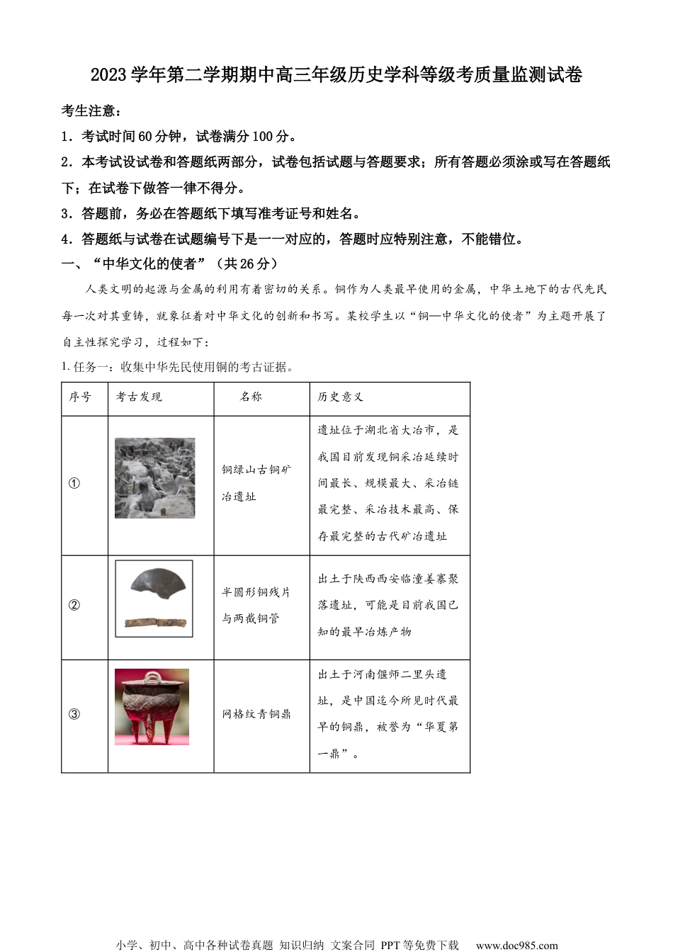 小学、初中、高中各种试卷真题知识归纳文案合同PPT等免费下载www.doc985.com2023学年第二学期期中高三年级历史学科等级考质量监测试卷考生注意:1.考试时间60分钟,试卷满分100分。2.本考试设试卷和答题纸两部分,试卷包括试题与答题要求;所有答题必须涂或写在答题纸下;在试卷下做答一律不得分。3.答题前,务必在答题纸下填写准考证号和姓名。4.答题纸与试卷在试题编号下是一一对应的,答题时应特别注意,不能错位。一、“中华文化的使者”(共26分)人类文明的起源与金属的利用有着密切的关系。铜作为人类最早使用的金属,中华土地下的古代先民每一次对其重铸,就象征着对中华文化的创新和书写。某校学生以“铜—中华文化的使者”为主题开展了自主性探究学习,过程如下:1.任务一:收集中华先民使用铜的考古证据。序号考古发现名称历史意义①铜绿山古铜矿冶遗址遗址位于湖北省大冶市,是我国目前发现铜采冶延续时间最长、规模最大、采冶链最完整、采冶技术最高、保存最完整的古代矿冶遗址②半圆形铜残片与两截铜管出土于陕西西安临潼姜寨聚落遗址,可能是目前我国已知的最早冶炼产物③网格纹青铜鼎出土于河南偃师二里头遗址,是中国迄今所见时代最早的铜鼎,被誉为“华夏第一鼎”。小学、初中、高中各种试卷真题知识归纳文案合同PPT等免费下载www.doc985.com④秦始皇陵铜车马是中国考古史下出土的体型最大、结构最复杂、系驾关系最完整古代青铜车马,是考古所见的最大的组合型青铜器,被誉为“青铜之冠”(1)对下列文物的解读,可以推断中华文明最早拥有铜金属制品开始于(单选)()A.旧石器时代B.新石器时代C.“万邦”时代D.夏商时代(2)下列文物中,能够反映中华大地早期国家形成的历史是(单选)()A.①B.②C.③D.④(3)下列④号文物能够反映秦朝的(单选)()A.皇帝制度B.三公九卿制度C.郡县制度D.宰相制度2.任务二:收集文献中有关铜钱的记载。阅读下列材料,回答问题。①“(西汉)清狩五年三官初铸五铢钱,至平帝清始中,成钱二百八十亿。”②“(唐)武德四年,废五铢钱,铸‘开清通宝’钱,每十钱重一两,计一千重六斤四两。”③“(北魏)初至太和,钱货无所用也。孝文帝始诏天下用钱。十九年,公铸粗备,文曰‘太和五铢’。”(1)下述材料中“清狩”“清始”“武德”“太和”属于(单选)()A.谥号B.庙号C.年号D.字号(2)下述材料③孝文帝属于(单选)()A.匈奴族B.鲜卑族C.女真族D.蒙古族(3)三则文献史料共同反映中国古代(双选)()A.政治制度建设B.货币名称变化C.货币制度改革D.赋税制度演变3.任务三:解读文物背后的中华文化。小学、初中、高中各种试卷真题知识归纳文案合同PPT等免费下载www.doc985.com任意选择下列文物中两件,依据示例,尝试多角度解读文物背后的文化内涵。示例:(F):中外文化交流下佛教文化在中国的传播和中华文化对外来文化的吸收;中国古代宫殿式大型建筑文化特色。(1)():________________。(2)():_______________。4.任务四:结合本题中提供的文物,概括中华文化的基本特点。【答案】1.(1)B;(2)C;(3)A。2.(1)C;(2)B;(3)B、C。3.A、博大精深的中医药文化/独特的理论诊断方式治疗手段/独特的治疗方式/中国针灸学临床实践和教学水平;B、民族交融/独特印章文化/国家与社会治理;C、独特的青铜文化/礼乐文化/分封制度宗法制度;D、领先世界的古代天文科技/科技文化的创新与传承;E、丝绸之路等商路中外物质技术文化等交流/中国对外来物种文化的吸收;(任意两点大意相近即可)4.结合文物概括说明中华文化的基本特点:悠久性、本土性、多样性、连续性、包容性、凝聚性等。【解析】【1题详解】(1)本题是单类型单项选择题。据本题主题干设问词,可知这是推断题,时空是新石器时代。根据材料“②半圆形铜残片与两截铜管出土于陕西西安临潼姜寨聚落遗址,可能是目前我国已知的最早冶炼产物”及所学可知,姜寨聚落遗址属于新石器时代的遗址,B项正确;旧石器时代人类用石头、骨头(主要是鹿)和木头制作工具,排除A项;“万邦”时代,城市林立,每一个城市都是以一个部落...