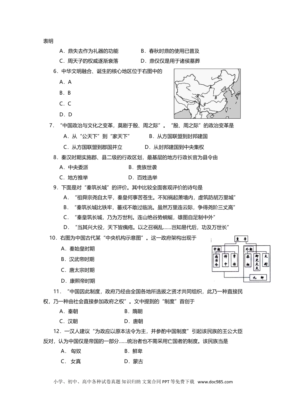 奉贤区2014-2015学年第一学期期末考质量监测高三年级历史学科试卷2015.1考生注意:1.考试时间120分钟,满分150分。2.本考试设试卷和答题纸两部分,所有答题必须全部写在(或涂在)答题纸上。3.答题前,务必在答题纸上填写学校、班级、姓名和学号等信息。4.答题纸与试卷在试题编号上是一一对应的,答题时应特别注意,不能错位。一、选择题(共75分)以下每小题2分,共60分,每题只有一个正确选项。1.“这两个文明基本上都是土生土长地自行发展出来的,也都有自然天险屏障或地理上的偏安,让它们自成一个世界,为统一政权的出现提供有利养分”。学者说的两大文明最可能是A.古代印度、埃及文明B.古代罗马、中国文明C.古代埃及、中国文明D.古代希腊、两河文明2.观察右图,公元前8世纪到公元前6世纪,城邦制度开始形成的地区是图中的A.AB.BC.CD.D3.“其首都是欧洲地区及地中海世界最大的政治、经济和宗教中心,控制欧洲和亚洲之间的贸易与文化往来”。文中的“首都”指的是A.罗马B.阿维尼翁C.开罗D.君士坦丁堡4.“男人在田间劳动,女人操持家务;大家一起去教堂做弥撒,听牧师布道;享用一日三餐(三餐的内容不尽一样)或领主为酬劳农奴的收割而提供的丰盛晚宴……”。这段文字描述的当是A.中世纪庄园B.西周诸侯国C.古希腊城邦D.印度种姓制5.河南郑州发现春秋时期郑国祭祀坑,其中一坑内出土一套九件青铜鼎。安徽寿县发现的春秋晚期蔡侯墓,出土十件列鼎。湖北随县战国早期的曾侯乙墓亦出土九件鼎。这小学、初中、高中各种试卷真题知识归纳文案合同PPT等免费下载www.doc985.com表明A.鼎失去作为礼器的功能B.春秋时鼎的使用已普及C.周天子的权威逐渐衰落D.鼎仅仅是用于诸侯墓葬6.中华文明融合、诞生的核心地区位于右图中的A.AB.BC.CD.D7.“中国政治与文化之变革,莫剧于殷、周之际”。“殷、周之际”的政治变革是A.从“公天下”到“家天下”B.从方国联盟到封邦建国C.从方国联盟到郡国并立D.从封邦建国到中央集权8.秦汉时期实施郡、县二级的行政区划,最基层的地方行政长官为县令由A.中央委派B.贵族世袭C.地方推举D.百姓选举9.下面是对“秦筑长城”的评价。其中比较全面客观评价的诗句是A.“祖舜宗尧自太平,秦皇何事苦苍生。不知祸起萧墙内,虚筑防胡万里城”B.“秦筑长城比铁牢,蕃戎不敢过临洮。虽然万里连云际,争得尧阶三丈高”C.“秦皇筑长城,乃为万世利。连山绝谷势蜿蜒,雄图自足制中外”D.“当其兴大役,天下皆痍疮。以之召祸乱……岂知易代后,功及万世长”10.右图为中国古代某“中央机构示意图”。这一政府架构出现于A.秦始皇时期B.汉武帝时期C.唐太宗时期D.康熙帝时期11.“中国因此制度,政府乃经由全国各地所选拔之贤才共同组织,此乃一种直接民权,乃一种由社会直接参加政府之权”。文中提到的“制度”首创于A.秦朝B.隋朝C.汉朝D.唐朝12.一汉人建议“为政应以原本法令为主,并参酌中国制度”引起该民族的王公大臣反对,认为中国仅是帝国的一部分……统治者也不需采用亡国者的制度。该民族当是A.匈奴B.鲜卑C.女真D.蒙古小学、初中、高中各种试卷真题知识归纳文案合同PPT等免费下载www.doc985.com13.某学者赞扬中国历史上的一项技术推动了西方的文艺复兴、启蒙运动等历史发展,是重大的“革命”。这位学者赞扬的技术是A.炼金术B.观星术C.航海技术D.活字印刷术14.《宋史》中出现了“焦守节(卷261)、李克让(卷270)、陈从信(卷277)、赵安仁(卷287)、钱端礼(卷385)、张忠恕(卷409)”等名字,与之有关的社会思潮是A.佛学B.法学C.玄学D.理学15.“今我朝罢丞相……以后子孙做皇帝时,并不许立丞相”。“我朝”是指A.汉朝B.唐朝C.明朝D.清朝16.“康熙初年,闽、浙、粤三省沿海郡县,迁民内居,筑界墙、严海禁,洋舶自此不得入”。下列解释最合理的是A.闽浙粤地区受到骚扰,应当是日本倭寇引起的纠纷B.海禁政策是禁止中国人出海,与清初三藩之乱有关C.外国船只不得入,应是针对来自欧洲各国的贸易商D.当时郑成功攻打各省沿海,这个政策应该针对台湾17.中国古代不同朝代为解决水灾,中央政府的...
