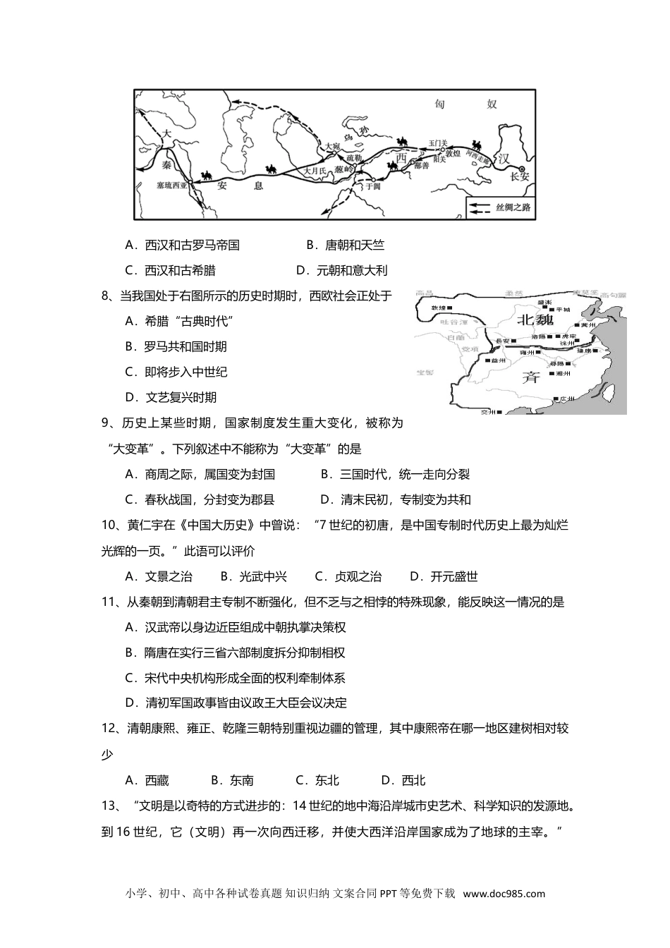 崇明县2014-2015学年第一学期期末考质量监测高三年级历史学科试卷2015.1考生注意:1.考试时间120分钟,满分150分。2.本考试设试卷和答题纸两部分,所有答题必须全部写在(或涂在)答题纸上。3.答题前,务必在答题纸上填写学校、班级、姓名和学号等信息。4.答题纸与试卷在试题编号上是一一对应的,答题时应特别注意,不能错位。一、选择题(共75分)1—30题,每小题2分,共60分,每题只有一个正确选项。1、在文字记载出现之前,人类已经经历漫长的文明演进过程。考古学者观察其间的变化,可以运用哪类发掘作为社会进步分期的历史标准A.遗址的周边环境B.遗址动植物残留C.发掘的人类遗骸D.人类使用的工具2、根据考古学家的发掘,世界上最早的图书馆亚述的巴尼拔图书馆,里面藏有大量的泥版。它位于今天的A.印度B.中国C.伊拉克D.埃及3、帕特农神庙是雅典灿烂古文明的历史见证,它建成于下列时间轴的哪一阶段前2000年前1100年前800年前500年前330年ABCD4、对西欧中世纪城市市民与封建领主之间的关系表达得比较恰当的一项是A.两者始终处于对立状况B.随城市发展而动态发展C.处于统治与被统治关系D.前期协作后期转向对立5、公元745年,唐玄宗下诏:“波斯经教,出自大秦(罗马),传习而来,久行中国。爰初建寺,因以为名。”诏书中所提到的“经教”属于A.道教B.基督教C.佛教D.伊斯兰教6、“不慕古,不留今,与时变,与俗化。”主张这一观点的最有可能是A.法家B.道家C.儒家D.墨家7、公元前后,在下图中这条要道的东西两端各有一个重要的文明古国,它们分别为小学、初中、高中各种试卷真题知识归纳文案合同PPT等免费下载www.doc985.comA.西汉和古罗马帝国B.唐朝和天竺C.西汉和古希腊D.元朝和意大利8、当我国处于右图所示的历史时期时,西欧社会正处于A.希腊“古典时代”B.罗马共和国时期C.即将步入中世纪D.文艺复兴时期9、历史上某些时期,国家制度发生重大变化,被称为“大变革”。下列叙述中不能称为“大变革”的是A.商周之际,属国变为封国B.三国时代,统一走向分裂C.春秋战国,分封变为郡县D.清末民初,专制变为共和10、黄仁宇在《中国大历史》中曾说:“7世纪的初唐,是中国专制时代历史上最为灿烂光辉的一页。”此语可以评价A.文景之治B.光武中兴C.贞观之治D.开元盛世11、从秦朝到清朝君主专制不断强化,但不乏与之相悖的特殊现象,能反映这一情况的是A.汉武帝以身边近臣组成中朝执掌决策权B.隋唐在实行三省六部制度拆分抑制相权C.宋代中央机构形成全面的权利牵制体系D.清初军国政事皆由议政王大臣会议决定12、清朝康熙、雍正、乾隆三朝特别重视边疆的管理,其中康熙帝在哪一地区建树相对较少A.西藏B.东南C.东北D.西北13、“文明是以奇特的方式进步的:14世纪的地中海沿岸城市史艺术、科学知识的发源地。到16世纪,它(文明)再一次向西迁移,并使大西洋沿岸国家成为了地球的主宰。”小学、初中、高中各种试卷真题知识归纳文案合同PPT等免费下载www.doc985.com(房龙《人类的故事》)这一时期文明进步的成就包括A.城市复兴、科学兴起B.启蒙运动、英国革命C.文艺复兴、宗教改革D.宗教改革、启蒙运动14、第一次工业革命是一场经济和社会关系的变革。它包括生产组织变革、技术变革和社会阶级关系变革。下列与之对应最具代表性的是A.工场蒸汽机产业工人阶级B.工厂蒸汽机工业资产阶级C.工场珍妮机金融资产阶级D.工厂飞梭中小资产阶级15、资产阶级革命或改革完成后,英、法、美、德各国先后建立了形式各异的资产阶级民主制度,但核心都是由议会掌握了国家的A.立法权B.行政权C.司法权D.外交权16、“当英国人从陶醉中惊醒,猛然看见帝国上空的夕阳时,新的太阳已经在大西洋的另一端升起。”(纪录片《大国崛起》)。在世界近代史上,这轮“新的太阳”指的是A.法国B.德国C.日本D.美国17、国歌记录了一个国家的历史和追求。以下歌词摘自德国国歌的是A.统一、权力和自由,是我们千秋万代的誓言B.这就是星条旗,愿它永远飘扬;在这自由国家,勇士的家乡C.公民们,投入战斗!前进,前进,万众一心,把敌人消灭净D.愿她保护法...