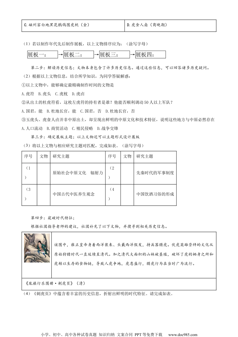 小学、初中、高中各种试卷真题知识归纳文案合同PPT等免费下载www.doc985.com2021学年第二学期高三历史教学质量监测试卷1.虎年看虎2022年是中国农历虎年,某校委托历史学社布置学校宣传栏。经学生讨论,决定选择不同时期“虎”形象的文物,制作“虎年看虎”主题展板。第一步:精选典型文物;社团精选了不同时期四件“虎”形象的文物,并搜寻到相关历史信息。出土时仅存左半符。符文字大意为:国君掌握右半符,杜地长官持有左半符。凡调动甲士50人以上,由国君派使者持右符与左符验合后,地方长官按使者传达之命令行动。后石家河文化地处江汉平原,受中原文化影响较为明显,其出土文物中屡屡出现玉虎形象。A.杜虎符(战国秦)B.后石家河文化玉虎头(新石器时代)位于河北的磁州窑是北方民窑代表。该枕为卧虎形,枕面绘有写意画,枕底墨书“大定二年六月二十六日张家”。瓷虎枕是金代盛行用具,有辟邪寓意。晋代葛洪《肘后备急方》有虎头枕治疗睡眠相关疾病记载。出土于湖南地区的酒器。一般认为“虎食人”形象早已有之,但其承载的含义存在争议,有“震慑奴隶”“虎食厉鬼”等多种说法。小学、初中、高中各种试卷真题知识归纳文案合同PPT等免费下载www.doc985.comC.磁州窑白地黑花鹡鸰图虎枕(金)D.虎食人卣(商晚期)(1)若以制作年代先后制作展板,以上文物排序应为:(涂写字母)第二步:解读历史信息;文物本身包含了许多历史信息。通过这些信息,可以回答诸多历史疑问。(2)根据以上文物信息,结合所学知识,为同学答疑解惑:①以上文物中,能够确定最精确制作时间的文物是A.虎符B.虎头C.虎枕D.虎卣②从出土的杜虎符看,这枚左虎符的持有者是谁?他能否顺利调动50人以上军队?A.国君,能B.杜地长官,能C.国君,否D.杜地长官,否③玉虎头、虎食人卣并非中原出土,却呈现出鲜明的中原文化和技术特征,说明这些地方与中原必然存在A.人口流动B.商贸活动C.殖民侵略D.战争交锋第三步:确定展板主题;以上文物还可以主题形式设计展板(3)将以上文物与相应研究主题对匹配,完成如表。(涂写字母)序号文物研究主题序号文物研究主题(1)原始社会中原文化的辐射力(2)先秦时代的军事制度(3)中国古代中医养生观念(4)中国饮酒习俗的形成第四步:窥破时代特征;根据社团指导老师的建议,社团补充了以下文物,并搜寻到相关历史信息。该图中,雍正皇帝身着西洋装束、头戴西洋假发,持兵器猎虎。伏虎英雄崇拜的文化从原始狩猎时代一直延续至清代。加之清代大面积的山林被垦殖,破坏了虎的栖身之所和虎赖以生存的食物链,导致人虎争地,虎患盛行,猎虎行为在当时广为流行。《胤禛行乐图册·刺虎页》(清)(4)《刺虎页》中蕴含着丰富的历史信息,折射出鲜明的时代特征。请完成如表。小学、初中、高中各种试卷真题知识归纳文案合同PPT等免费下载www.doc985.com【答案】(1)BDAC(2)CDA(3)BACD(4)(1)西方文化伴随着新航路开辟和资本主义发展,已渗透影响中国。(2)人口急剧增长使资源危机日益显露,人地矛盾凸显,社会矛盾加剧。【解析】【小问1详解】根据材料“杜虎符(战国秦)”是战国秦国;根据材料“后石家河文化玉虎头(新石器时代)”是新石器时代;根据材料“磁州窑白地黑花鹡鸰图虎枕(金)”可知,是金朝;根据材料“虎食人卣(商晚期)”是商晚期;故顺序是BDAC。【小问2详解】结合所学知识可知,在杜虎符(战国秦)、后石家河文化玉虎头(新石器时代)、磁州窑白地黑花鹡鸰图虎枕(金)、虎食人卣(商晚期)等四种文物中,能够确定最精确制作时间的文物是C项,排除ABD项。根据材料“出土时仅存左半符。符文字大意为:国君掌握右半符,杜地长官持有左半符。凡调动甲士50人以上,由国君派使者持右符与左符验合后,地方长官按使者传达之命令行动。”可知,从出土的杜虎符看,这枚左虎符的持有者是杜地长官,他不能顺利调动50人以上军队,D项正确,排除ABC项。结合所学知识可知,玉虎头、虎食人卣并非中原出土,却呈现出鲜明的中原文化和技术特征,说明这些地方与中原必然存在人口流动,A项正确;商贸活动、殖民侵略、战争交锋等信息都与题干无关,排除BCD项。【小问3...