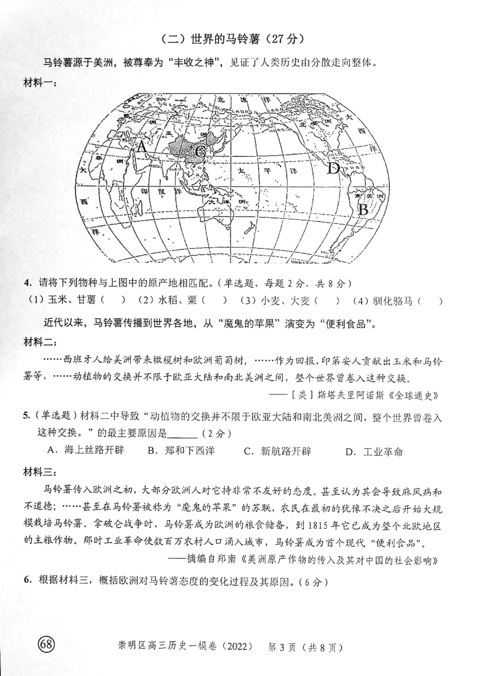 上海市崇明区2022届高三一模等级考历史试题.docx