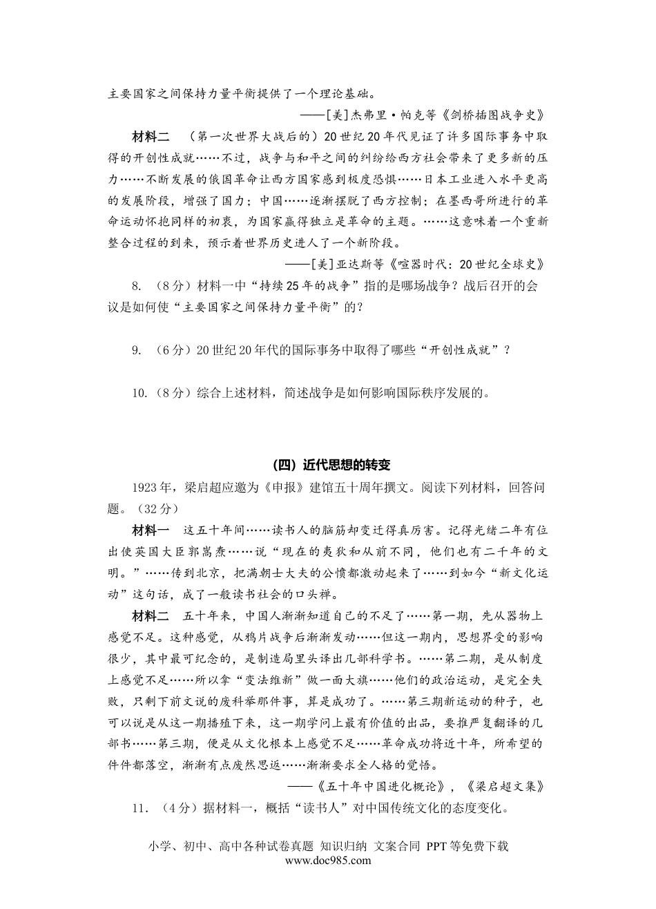 小学、初中、高中各种试卷真题知识归纳文案合同PPT等免费下载www.doc985.com2021学年第一学期高中历史练习卷(一)区域文明的成果阅读下列材料,回答问题。(22分)1.(10分)将上述图片所示文明成果放入示意图中相应位置。(填写字母)①;②;③F;④;⑤;⑥。2.(4分)上述文明成果属于历史遗址的是、;属于历史文献的是、。(填写字母)3.(8分)按照下列示例完成任务。⑥小学、初中、高中各种试卷真题知识归纳文案合同PPT等免费下载www.doc985.com示例:文学方面,可以用图A和图F作研究。任务一:方面,可以用图C和图做研究。任务二:建筑方面,可以用图和图做研究。(二)中国的政治制度阅读下列材料,回答问题。(24分)钱穆在《中国历史研究法》中指出:我们研究制度,必然是一种通学。一方面,每一制度,必前有所因,无可凭空特起,必须通古今;又一方面,每一制度,同时必与其他制度相通合一,始得成为某一时代、某一政府之某一制度,必须通彼此。4.(2分)钱穆主张“通古今”“通彼此”,强调了研究制度须注重()A.相同与不同的比较B.背景与条件的分析C.纵向与横向的联系D.主观与客观的综合5.(6分)以中国公务员制度为例,说明其是如何“通古今”“通彼此”的。6.(10分)在上面时间轴的序号内填入适当内容。①_________________;②_________________;③_________________;④_________________;⑤_________________。7.(6分)依据时间轴,概述中国古代政治制度的演变趋势。(三)相隔百年的战争19世纪初与20世纪初,先后发生了两次欧洲为主体的大规模战争。阅读下列材料,回答问题。(22分)材料一在1815年平定欧洲各国之间已持续25年的战争……胜利者们同意给予法国人一个温厚的和平……由于兼顾了所有主要国家的利益,(1815年的这次)会议成为西方文明史上最成功的谈判会议之一……就整体而言,这次会议为小学、初中、高中各种试卷真题知识归纳文案合同PPT等免费下载www.doc985.com主要国家之间保持力量平衡提供了一个理论基础。——[美]杰弗里·帕克等《剑桥插图战争史》材料二(第一次世界大战后的)20世纪20年代见证了许多国际事务中取得的开创性成就……不过,战争与和平之间的纠纷给西方社会带来了更多新的压力……不断发展的俄国革命让西方国家感到极度恐惧……日本工业进入水平更高的发展阶段,增强了国力;中国……逐渐摆脱了西方控制;在墨西哥所进行的革命运动怀抱同样的初衷,为国家赢得独立是革命的主题。……这意味着一个重新整合过程的到来,预示着世界历史进人了一个新阶段。——[美]亚达斯等《喧器时代:20世纪全球史》8.(8分)材料一中“持续25年的战争”指的是哪场战争?战后召开的会议是如何使“主要国家之间保持力量平衡”的?9.(6分)20世纪20年代的国际事务中取得了哪些“开创性成就”?10.(8分)综合上述材料,简述战争是如何影响国际秩序发展的。(四)近代思想的转变1923年,梁启超应邀为《申报》建馆五十周年撰文。阅读下列材料,回答问题。(32分)材料一这五十年间……读书人的脑筋却变迁得真厉害。记得光绪二年有位出使英国大臣郭嵩焘……说“现在的夷狄和从前不同,他们也有二千年的文明。”……传到北京,把满朝士大夫的公愤都激动起来了……到如今“新文化运动”这句话,成了一般读书社会的口头禅。材料二五十年来,中国人渐渐知道自己的不足了……第一期,先从器物上感觉不足。这种感觉,从鸦片战争后渐渐发动……但这一期内,思想界受的影响很少,其中最可纪念的,是制造局里头译出几部科学书。……第二期,是从制度上感觉不足……所以拿“变法维新”做一面大旗……他们的政治运动,是完全失败,只剩下前文说的废科举那件事,算是成功了。……第三期新运动的种子,也可以说是从这一期播殖下来,这一期学问上最有价值的出品,要推严复翻译的几部书……第三期,便是从文化根本上感觉不足……革命成功将近十年,所希望的件件都落空,渐渐有点废然思返……渐渐要求全人格的觉悟。——《五十年中国进化概论》,《梁启超文集》11.(4分)据材料一,概括“读书人”对中国传统文化的态度变化。小学、初中、高中各种试卷真题...