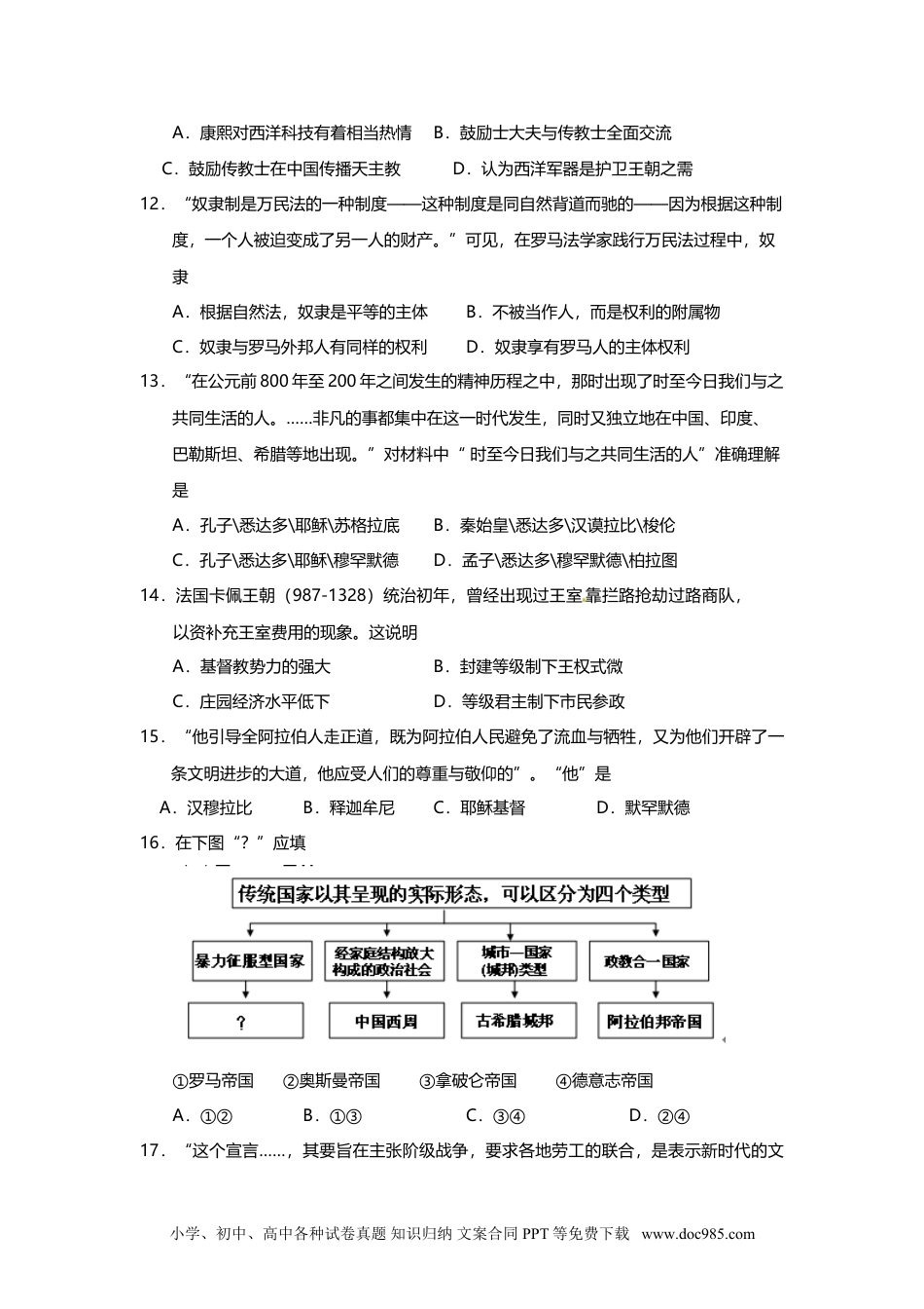 松江区2013-2014学年第一学期期末考质量监测高三年级历史学科试卷2014.1考生注意:1.考试时间120分钟,满分150分。2.本考试设试卷和答题纸两部分,所有答题必须全部写在(或涂在)答题纸上。3.答题前,务必在答题纸上填写学校、班级、姓名和学号等信息。4.答题纸与试卷在试题编号上是一一对应的,答题时应特别注意,不能错位。一、选择题(共75分)以下每小题2分,共60分,每题只有一个正确选项。1.图中的法老,手上有两根权杖,一根管辖生者,一根管辖死者。据此推测,反映的主要理念是A.众权于一身B.来世信仰C.死者为尊D.天人感应2.史学家陈寅恪在王国维的挽词称赞他:“考释殷书开盛业”。“盛业”是指A.通过考古证实炎黄传说B.通过甲骨文考实商史C.通过甲骨文考实夏史D.提出“存而不补”方法3.从右边地图的信息中可以判断是中国古代的A.大秦王朝B.西汉初年C.东汉政权D.南宋政权4.“守旧而又维新,复古而又开明,这样一种二重性的立场,使得儒家学说能够一手伸向过去,一手伸向未来,在正在消逝的贵族分封制社会和方兴的大一统社会之间架起了桥梁。”完成这个架桥任务的是A.孔子B.孟子C.董仲舒D.朱熹小学、初中、高中各种试卷真题知识归纳文案合同PPT等免费下载www.doc985.com5.“从公元25年到公元140年之间,汉代的人口从5900万减少到4800万。”导致这一变化的主要因素是A.农民起义导致人口减少B.豪强势力,隐匿人口C.北方少数民族大量内迁D.军阀割据,战乱不断6.中国服饰在不同历史时期特征各异,如战国的“清新”、唐的“丰满华丽”、宋的“理性美”,这些特征折射出的历史现象分别是A.百家争鸣、民主政治、新思潮萌发B.罢黜百家、政治腐朽、理学盛行[来源:学科网]C.百家争鸣、经世致用、国家富强D.百家争鸣、国家富强、理学盛行7.“居天地之中者日中国,居天地之偏者日四夷。四夷外也,中国内也。”此话反映了中国士大夫A.注重经典考证B.推崇理学独尊C.以自我为中心D.重视国家主权8.1901年,梁启超在《中国史叙论》中把中国历史区分为“中国之中国”、“亚洲之中国”、“世界之中国”三个阶段。其中第二阶段可能最适合A.秦始皇统一前的中国B.清朝1840年以后的中国C.远古传说时期的中国D.秦朝到明朝时期的中国9.在13世纪前期到15世纪前期的两百年内,欧亚大陆上中国与欧洲的直接联系被打通,出现这一局面的主要因素是A.蒙古帝国的建立B.奥斯曼帝国的建立C.新航路的开辟D.海上丝绸之路的繁荣10.中国古代文化在两汉时期是与草原文化的融合,在魏晋唐宋时期主要是与南亚文化的交流。15—16世纪面对的是欧洲文化,这些文化包括①基督教神学②自然科学③人文学术④民主科学A.①②③B.②③④C.①③④D.①②④11.康熙帝通过南怀仁致信西方耶稣会士:“凡擅长天文学、光学、静力学、动力学等物质科学之耶稣会士,中国无不欢迎。”此信说明:小学、初中、高中各种试卷真题知识归纳文案合同PPT等免费下载www.doc985.comA.康熙对西洋科技有着相当热情B.鼓励士大夫与传教士全面交流[来源:学科网]C.鼓励传教士在中国传播天主教D.认为西洋军器是护卫王朝之需12.“奴隶制是万民法的一种制度——这种制度是同自然背道而驰的——因为根据这种制度,一个人被迫变成了另一人的财产。”可见,在罗马法学家践行万民法过程中,奴隶A.根据自然法,奴隶是平等的主体B.不被当作人,而是权利的附属物C.奴隶与罗马外邦人有同样的权利D.奴隶享有罗马人的主体权利13.“在公元前800年至200年之间发生的精神历程之中,那时出现了时至今日我们与之共同生活的人。……非凡的事都集中在这一时代发生,同时又独立地在中国、印度、巴勒斯坦、希腊等地出现。”对材料中“时至今日我们与之共同生活的人”准确理解是A.孔子\悉达多\耶稣\苏格拉底B.秦始皇\悉达多\汉谟拉比\梭伦C.孔子\悉达多\耶稣\穆罕默德D.孟子\悉达多\穆罕默德\柏拉图14.法国卡佩王朝(987-1328)统治初年,曾经出现过王室靠拦路抢劫过路商队,以资补充王室费用的现象。这说明A.基督教势力的强大B.封建等级制下王权式微C.庄园经济水平低下D.等级君主制下市民参政15.“...