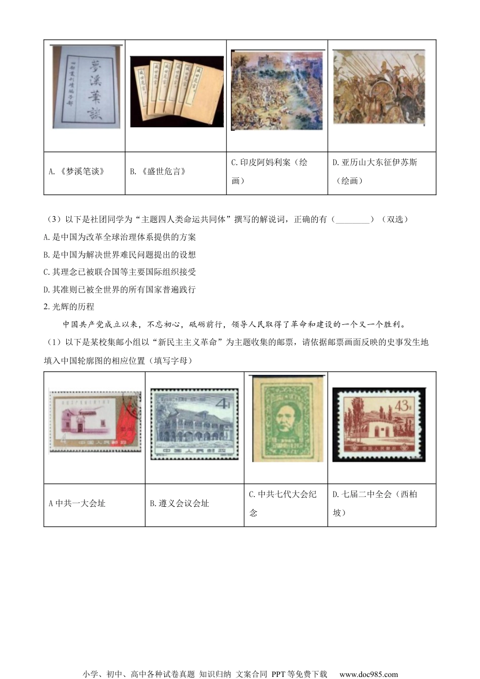 小学、初中、高中各种试卷真题知识归纳文案合同PPT等免费下载www.doc985.com浦东新区2021学年第二学期高中练习卷高三历史试卷1.文明的交流历史长河中的人类文明区域日益拓展,联系日益紧密。某校准备举办主题为“全球化视野下的文明交流”的图片展,由历史社团学生布置。(1)以下是社团搜集的图片资料,请依据图片反映的历史信息安排到相应专题下(填写字母)主题一古代丝路文明主题二整体世界初现主题三近代文化交锋主题四人类命运共同体(2)社团同学若想进一步研究“主题三近代文化交锋”,他们还可以参考下列中的哪些材料?(________)(双选)小学、初中、高中各种试卷真题知识归纳文案合同PPT等免费下载www.doc985.comA.《梦溪笔谈》B.《盛世危言》C.印皮阿妈利案(绘画)D.亚历山大东征伊苏斯(绘画)(3)以下是社团同学为“主题四人类命运共同体”撰写的解说词,正确的有(________)(双选)A.是中国为改革全球治理体系提供的方案B.是中国为解决世界难民问题提出的设想C.其理念已被联合国等主要国际组织接受D.其准则已被全世界的所有国家普遍践行2.光辉的历程中国共产党成立以来,不忘初心,砥砺前行,领导人民取得了革命和建设的一个又一个胜利。(1)以下是某校集邮小组以“新民主主义革命”为主题收集的邮票,请依据邮票画面反映的史事发生地填入中国轮廓图的相应位置(填写字母)A.中共一大会址B.遵义会议会址C.中共七代大会纪念D.七届二中全会(西柏坡)小学、初中、高中各种试卷真题知识归纳文案合同PPT等免费下载www.doc985.com①________②________③________④________(2)以下是某同学以“新中国成立以来的重大会议”为主题整理的历史图片,请与下列的图片说明相匹配(填写字母)①代行全国人大职权,颁布《共同纲领》。②通过了第一部社会主义类型的宪法。③为新中国融入战后国际社会打开了新局面。④提出“求同存异”方针,成为国际关系的基本准则。⑤停止“阶级斗争为纲”,重新确立党的思想路线、政治路线和组织路线。⑥明确党的根本任务是集中力量发展生产力,实现工业化,满足人民需要。(3)依据上述材料,概述中国共产党成立以来在革命和建设中取得了哪些成就?3.“玄武门之变”疑云对同一历史事件,往往有不同的记载,玄武门之变就是其中一例。小学、初中、高中各种试卷真题知识归纳文案合同PPT等免费下载www.doc985.com材料一(武德九年六月)四日,太宗(李世民)将左右九人至玄武门自卫……建成、元吉(李世民的兄与弟)行至临湖殿,觉变,即回马,将东归宫府。……俄而东宫及齐府精兵二千人结阵驰攻玄武门,守门兵仗拒之,不得入……太宗左右数百骑来赴难,建成等兵遂败散。——《旧唐书》卷64《隐太子传》注:《旧唐书》成书于五代时期,隐太子是李建成。(1)据材料一可知,在玄武门之变中(________)(双选)A.李建成发动了政变B.李建成因兵败被杀C.李世民结盟李元吉D.李世民是自卫反击材料二(地府判官)自出问头(写在纸上审讯犯人的问题)云:“问大唐天子……为甚杀兄弟于前殿,囚慈父于后宫?仰答!”……(皇帝)把得问头寻读,闷闷不已。——《唐太宗入冥记》注:《唐太宗入冥记》成书于武则天时期,是一篇民间话本。(2)材料二所述的事实与材料一有何不同?材料三玄武门守将常何的墓志铭拓本在敦煌被发现,铭文记载:武德七年,(常何)奉太宗令追入京,赐金刀子一枚……九年六月四日,令总北门之寄(负责玄武门守卫)。(3)请解读“墓志铭拓本”对研究玄武门之变的价值。材料四太宗曰:“今欲自看国史……卿可撰录进来。”太宗见六月四日事,语多微文(隐晦)。乃谓玄龄曰:“……宜即改削浮词,直书其事。”——(唐)吴兢《贞观政要》卷7(4)综合上述材料,你认为玄武门之变是哪一方发动的?说明你的理由。4.“铁路梦”火车的发明极大地拓展了陆上移动空间与物流能力,不断地发展着人类的“铁路梦”。材料一苏格兰人乔治·史蒂文森,制造出他著名的“移动引擎”,这使煤的价格降低了将近七成,还让曼彻斯特与利物浦之间开通第一条客运专线成为可能。从此,人们可以用前所未闻的15英里的速度,从一个城市奔向另一个城市。—...
