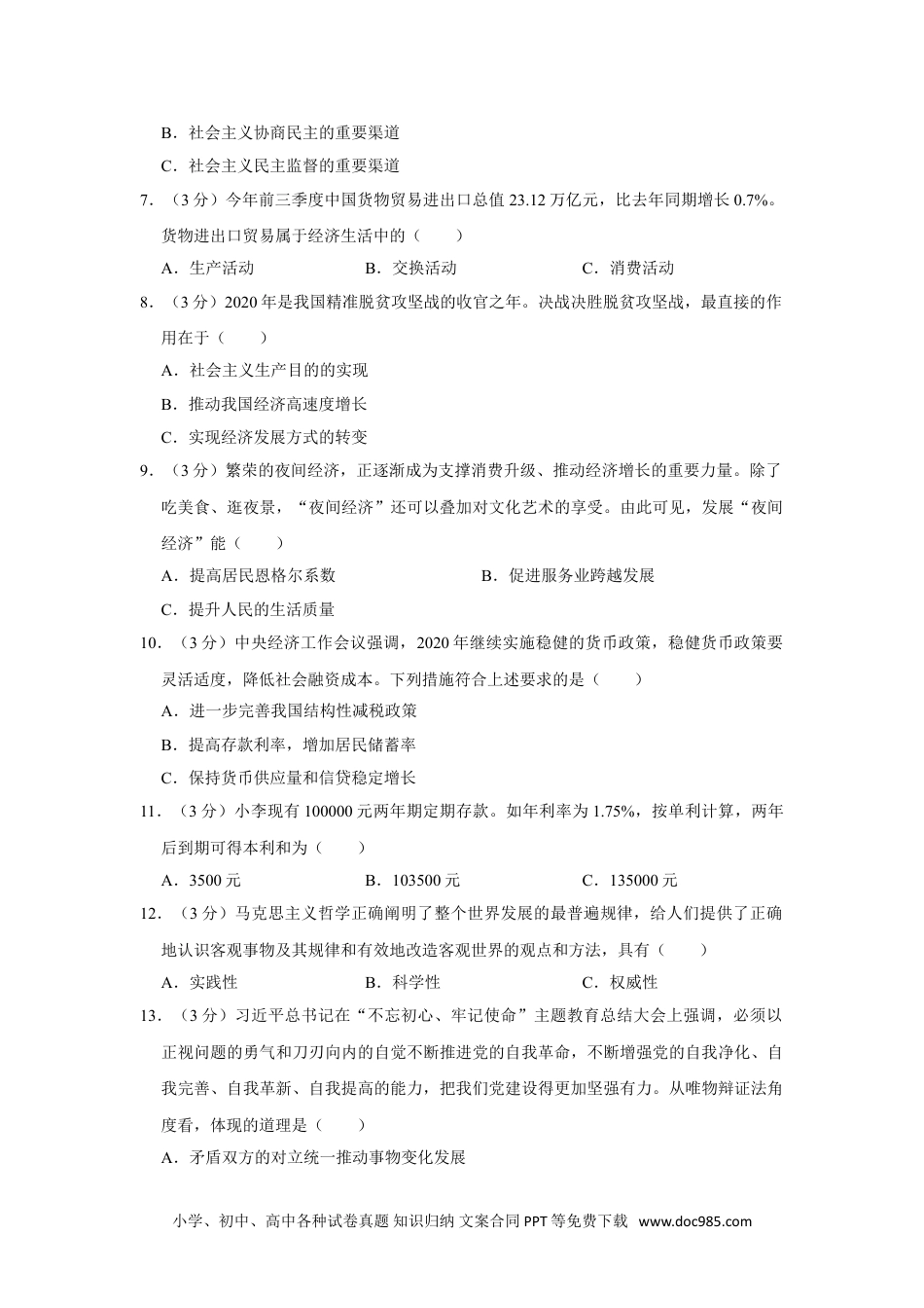 2020-2021学年上海市松江区高三(上)期末政治试卷(一模)一、单项选择题:(共60分,每小题3分)1~16题,每小题只能选一个答案,选出正确答案得3分,错选的0分。17~20题,每小题只能选一个答案,选出最佳答案得3分,次佳答案得2分,错选得0分。1.(3分)上海公检法各部门全力开展扫黑除恶专项斗争,维护上海社会安定和人民安宁。这体现了()A.对敌实行专政是我国国体的最大特点B.对敌实行专政是人民享有民主的保障C.对人民民主是对敌专政的前提和基础2.(3分)国务院常务会议指出,要坚持“两个毫不动摇”,支持国企和民企改革发展。这体现我国国家政权行使的职能是()A.组织和领导社会主义现代化建设B.协调人民内部的关系和利益C.组织社会公共服务3.(3分)党的十九届四中全会强调,要坚持和完善人民当家作主制度体系。其中,我国的根本政治制度是()A.人民代表大会制度B.民族区域自治制度C.基层群众自治制度4.(3分)社会主义民主是一种新型民主,是维护人民根本利益的最广泛、最真实、最管用的民主。我国社会主义民主最根本的特点是()A.坚持党的领导、人民代表大会、依法治国三者的有机统一B.坚持党的领导、人民当家作主、依法治国三者的有机统一C.坚持党的领导、人民民主专政、依法治国三者的有机统一5.(3分)“沧海横流,方显英雄本色”,在抗击疫情的严峻斗争中,各级党组织和广大党员不畏牺牲,冲锋在前。这体现的党的领导是()A.政治领导B.思想领导C.组织领导6.(3分)全国政协十三届三次会议期间,政协委员们就如何织密公共卫生防护网、如何提升社会治理水平、如何“保企业”“保就业”“保民生”,提出了一条条富有针对性的真知灼见。这体现人民政协是()A.多党合作和政治协商的国家机构小学、初中、高中各种试卷真题知识归纳文案合同PPT等免费下载www.doc985.comB.社会主义协商民主的重要渠道C.社会主义民主监督的重要渠道7.(3分)今年前三季度中国货物贸易进出口总值23.12万亿元,比去年同期增长0.7%。货物进出口贸易属于经济生活中的()A.生产活动B.交换活动C.消费活动8.(3分)2020年是我国精准脱贫攻坚战的收官之年。决战决胜脱贫攻坚战,最直接的作用在于()A.社会主义生产目的的实现B.推动我国经济高速度增长C.实现经济发展方式的转变9.(3分)繁荣的夜间经济,正逐渐成为支撑消费升级、推动经济增长的重要力量。除了吃美食、逛夜景,“夜间经济”还可以叠加对文化艺术的享受。由此可见,发展“夜间经济”能()A.提高居民恩格尔系数B.促进服务业跨越发展C.提升人民的生活质量10.(3分)中央经济工作会议强调,2020年继续实施稳健的货币政策,稳健货币政策要灵活适度,降低社会融资成本。下列措施符合上述要求的是()A.进一步完善我国结构性减税政策B.提高存款利率,增加居民储蓄率C.保持货币供应量和信贷稳定增长11.(3分)小李现有100000元两年期定期存款。如年利率为1.75%,按单利计算,两年后到期可得本利和为()A.3500元B.103500元C.135000元12.(3分)马克思主义哲学正确阐明了整个世界发展的最普遍规律,给人们提供了正确地认识客观事物及其规律和有效地改造客观世界的观点和方法,具有()A.实践性B.科学性C.权威性13.(3分)习近平总书记在“不忘初心、牢记使命”主题教育总结大会上强调,必须以正视问题的勇气和刀刃向内的自觉不断推进党的自我革命,不断增强党的自我净化、自我完善、自我革新、自我提高的能力,把我们党建设得更加坚强有力。从唯物辩证法角度看,体现的道理是()A.矛盾双方的对立统一推动事物变化发展小学、初中、高中各种试卷真题知识归纳文案合同PPT等免费下载www.doc985.comB.发挥主观能动性以尊重客观规律为前提C.矛盾的特殊性要求具体问题具体分析14.(3分)“中国经济是一片大海,而不是一个小池塘。”“狂风骤雨可以掀翻小池塘,但不能掀翻大海。”回望中国经济发展历程,风风雨雨是常态,在经历了一次次狂风骤雨后,却总能履险如夷、化危为机,在风雨之后更加茁壮。这给我们的哲学启示是()A.事物发展是内因和外因共同作用的结果B.事物发展是前进...