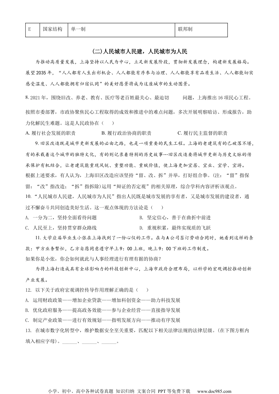 小学、初中、高中各种试卷真题知识归纳文案合同PPT等免费下载www.doc985.com虹口区2021学年度第二学期学生学习能力诊断测试高三政治试卷考生注意:1.试卷满分100分,考试时间60分钟。2,本考试分设试卷和答题纸。试卷主要为综合题,包括选择题、简答题、论述题等。3.答题前,务必在答题纸上填写姓名、学校和班级。作答必须涂或写在答题纸上,在试卷上作答一律不得分。(一)传承红色精神,接续百年历程“红色精神”是指中国共产党领导中国人民在革命、建设、改革等各个时期所形成的伟大革命精神。历史川流不息,精神代代相传。立足新时代,我们更要赓续红色血脉,激扬起继往开来、不懈奋斗的精神力量。1.(多选)“红色精神”是指中国共产党领导中国人民在革命、建设、改革等各个时期所形成的伟大革命精神。以下对“红色精神”形成的历史时期和内涵理解正确的是()A.建党精神一一社会主义革命与建设时期一一坚持真理、坚守理想、践行初心、担当使命B.长征精神一一新民主主义革命时期一一不畏艰难险阻、不畏牺牲、顾全大局、严守纪律C.两弹一星精神一一改革开放与社会主义现代化建设时期一一自力更生、勇攀科学高峰D.抗疫精神一一中国特色社会主义新时代一一生命至上、举国同心、舍生忘死、尊重科学2.第一批纳入中国共产党人精神谱系的伟大精神是建党精神、井冈山精神、苏区精神、长征精神……无论时代如何变迁,“红色精神”都是鼓舞和激励中国人民不断攻坚克难砥砺前行的强大精神动力。这说明()A.任何事物都是矛盾的普遍性与特殊性的统一B.正确的意识是人类社会历史发展的根本动力C.发挥主观能动性是人们认识世界的必要前提3.强大的精神力量铸就了一个个扛起中华民族伟大复兴大任的中华脊梁。一位同学在了解了许多“民族脊梁”的感人事迹后,感叹:他们是知此平凡而伟大,他们虽死犹生。这一观点()A.违背了矛盾律,平凡与伟大、生与死都是自相矛盾B.体现辩证思维,平凡与伟大、生与死不同角度思考C.体现抽象思维,平凡与伟大、生与死概括英雄本质4.建党百年之际,党中央领导全党全国人民学“四史”,赓续红色精神血脉,这是党进行()A.政治领导,制定国家路线方针小学、初中、高中各种试卷真题知识归纳文案合同PPT等免费下载www.doc985.comB.组织领导,贯彻落实方针政策C.思想领导,凝聚人民思想共识5.“改革开放精神”是中国共产党在探索和发展中国特色社会主义过程中形成的精神品格。中国特色社会主义迈入新时代,中国坚持改革开放,构建更高水平的开放型经济新体制。2019年,全国人大通过《中华人民共和国外商投资法》,2021年12月27日,国家发布《外商投资准入特别管理措施(负面清单)(2021年版)》,以高水平开放推动我国经济高质量发展。在全球跨国投资受疫情影响大幅下滑的背景下,中国市场仍对外资具有较大吸引力。我国2020年和2021年吸引外资稳中有增,保持世界第二位。2016年至2020年我国实际利用外资额。注:2010年开始,中国成为世界第二大经济体。根据上述材料所示,结合我国经济发展情况和政策导向,预测我国利用外资的发展趋势并说明理由。从北斗升空、全民战疫到脱贫攻坚,新时代一个个伟大成就既析射出精神的力量,更彰显了中国特色社会主义理论的力量和制度的优势。中国特色社会主义理论是马克思主义普遍原理和中国实际相结合的理论,是马克思主义中国化的最新理论成果。6.上述表述是对中国特色社会主义理论______。(选填:内涵定义或外延划分)7.(多选)为探究我国成功的“密码”,一位同学将中美政治制度进行了比较,其比较分析正确的是______。比较内容中国美国A国体人民民主专政资产阶级专政B民主特点民主和专政的统一民主只属于统治阶级C政体人民代表大会制度议会共和制D政党制度中国共产党领导下的多党合作和政治协商制度两党制小学、初中、高中各种试卷真题知识归纳文案合同PPT等免费下载www.doc985.comE国家结构单一制联邦制(二)人民城市人民建,人民城市为人民为推动高质量发展,上海坚持以人民为中心,立足新发展阶段,贯彻新发展理念,构建新发展格局。展望2035年,“人人都有人生出彩机会、人人都能有序参与治理、人人都能享有品质生活、人人都能切...