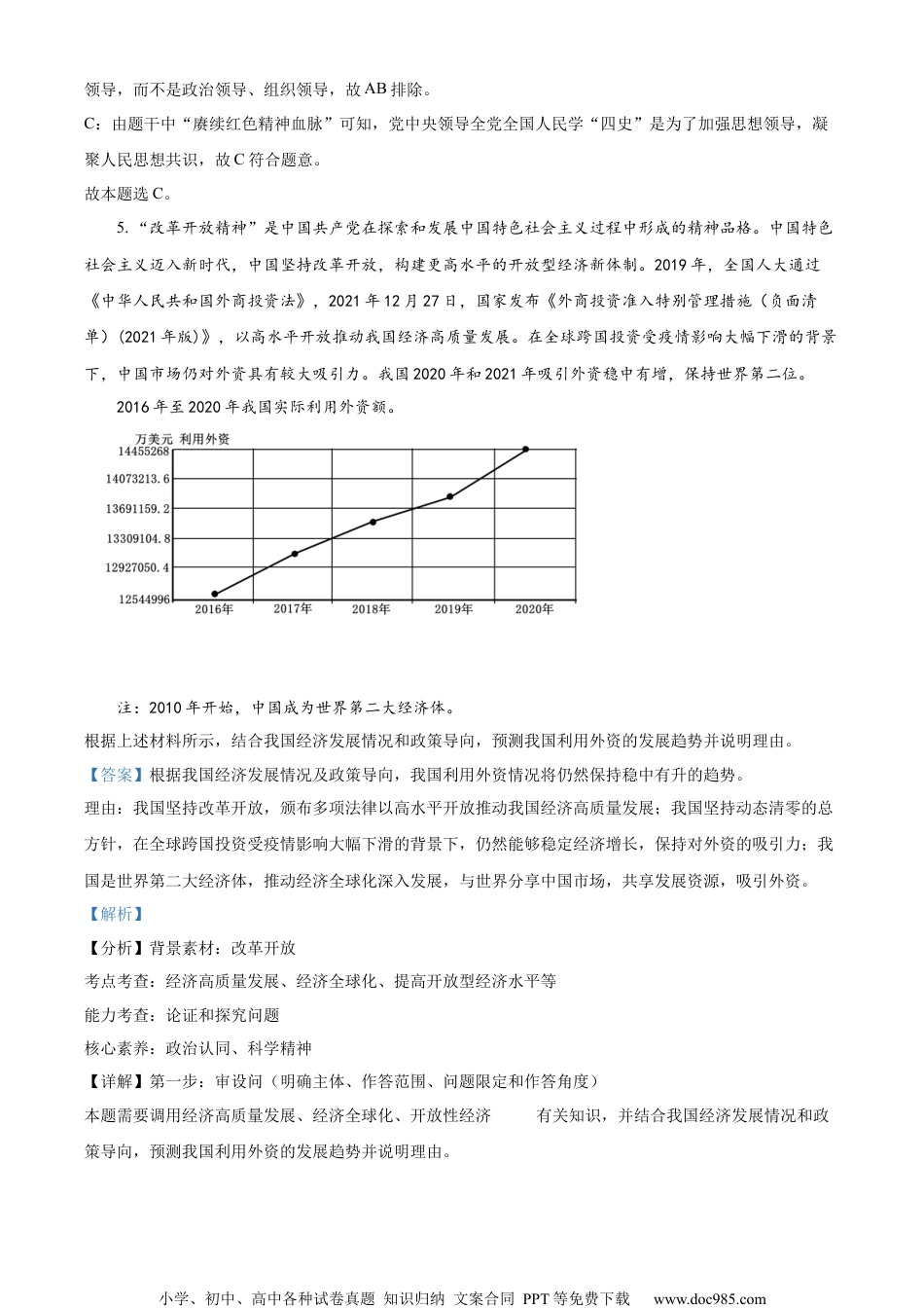 小学、初中、高中各种试卷真题知识归纳文案合同PPT等免费下载www.doc985.com虹口区2021学年度第二学期学生学习能力诊断测试高三政治试卷考生注意:1.试卷满分100分,考试时间60分钟。2,本考试分设试卷和答题纸。试卷主要为综合题,包括选择题、简答题、论述题等。3.答题前,务必在答题纸上填写姓名、学校和班级。作答必须涂或写在答题纸上,在试卷上作答一律不得分。(一)传承红色精神,接续百年历程“红色精神”是指中国共产党领导中国人民在革命、建设、改革等各个时期所形成的伟大革命精神。历史川流不息,精神代代相传。立足新时代,我们更要赓续红色血脉,激扬起继往开来、不懈奋斗的精神力量。1.(多选)“红色精神”是指中国共产党领导中国人民在革命、建设、改革等各个时期所形成的伟大革命精神。以下对“红色精神”形成的历史时期和内涵理解正确的是()A.建党精神一一社会主义革命与建设时期一一坚持真理、坚守理想、践行初心、担当使命B.长征精神一一新民主主义革命时期一一不畏艰难险阻、不畏牺牲、顾全大局、严守纪律C.两弹一星精神一一改革开放与社会主义现代化建设时期一一自力更生、勇攀科学高峰D.抗疫精神一一中国特色社会主义新时代一一生命至上、举国同心、舍生忘死、尊重科学【答案】BD【解析】【详解】A:根据所学知识,建党精神形成于新民主主义革命时期,其内涵是坚持真理、坚守理想,践行初心,担当使命,不怕牺牲、英勇斗争,对党忠诚、不负人民,故A错误。B:根据所学知识,长征精神形成于新民主主义革命时期,其内涵是不畏艰难险阻、不畏牺牲、顾全大局、严守纪律等,故B正确。C:根据所学知识,两弹一星精神形成于社会主义革命和建设时期,并不是形成于改革开放和社会主义现代化建设时期,其内涵是热爱祖国、无私奉献,自力更生、艰苦奋斗,大力协同、勇于登攀,故C错误。D:根据所学知识,抗疫精神形成于中国特色社会主义新时代,其内涵是生命至上,举国同心,舍生忘死,尊重科学,命运与共,故D正确。故本题选BD。2.第一批纳入中国共产党人精神谱系的伟大精神是建党精神、井冈山精神、苏区精神、长征精神……无论时代如何变迁,“红色精神”都是鼓舞和激励中国人民不断攻坚克难砥砺前行的强大精神动力。这说明(小学、初中、高中各种试卷真题知识归纳文案合同PPT等免费下载www.doc985.com)A.任何事物都是矛盾的普遍性与特殊性的统一B.正确的意识是人类社会历史发展的根本动力C.发挥主观能动性是人们认识世界的必要前提【答案】A【解析】【详解】A:材料中指出建党精神、井冈山精神等都是在不同时期红色精神的具体表现,无论时代如何变迁,“红色精神”都是鼓舞和激励中国人民不断攻坚克难砥砺前行的强大精神动力,这说明任何事物都是矛盾的普遍性与特殊性的统一,故A正确。B:社会基本矛盾是人类社会历史发展的根本动力,故B不选。C:发挥主观能动性是人们认识世界的重要条件,但不是必要前提,故C不选。故本题选A。3.强大的精神力量铸就了一个个扛起中华民族伟大复兴大任的中华脊梁。一位同学在了解了许多“民族脊梁”的感人事迹后,感叹:他们是知此平凡而伟大,他们虽死犹生。这一观点()A.违背了矛盾律,平凡与伟大、生与死都是自相矛盾B.体现辩证思维,平凡与伟大、生与死不同角度思考C.体现抽象思维,平凡与伟大、生与死概括英雄本质【答案】B【解析】【详解】AB:“平凡”指工作岗位和事迹,而“伟大”是指精神和价值;“死”是指自然生命的结束,“犹生”是指精神永存。这样的矛盾是从不同的角度对事物的认识,因而属于辩证矛盾,不违反矛盾律的要求。A错误,B正确。C:“平凡与伟大、生与死”是在感觉、知觉和表象的基础上,运用联想、想象和幻想等反映认识对象,体现的是形象思维,C错误。故本题选B。4.建党百年之际,党中央领导全党全国人民学“四史”,赓续红色精神血脉,这是党进行()A.政治领导,制定国家路线方针B.组织领导,贯彻落实方针政策C.思想领导,凝聚人民思想共识【答案】C【解析】【详解】AB:由题干中“赓续红色精神血脉”可知,党中央领导全党全国人民学“四史”是为了加强思想小学、初中、高中各种试卷真题知识归纳文案...