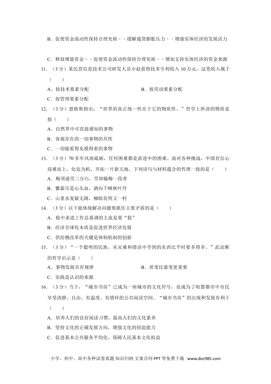 2021年上海市松江区高考政治二模试卷(等级考)一、单项选择题:(共60分,每小题3分)1~16题,每小题只能选一个答案,选出正确答案得3分,错选的0分。17~20题,每小题只能选一个答案,选出最佳答案得3分,次佳答案得2分,错选得0分。1.(3分)每年“两会”期间,全国人大代表和全国政协委员齐聚北京,共商国是。全国人民代表大会和中国人民政治协商会议()A.都行使或参与行使一定的国家权力B.都由人民通过选举产生的代表组成C.都是社会主义民主的重要实现形式2.(3分)2021年中央一号文件强调,要举全党全社会之力加快农业农村现代化,让广大农民过上更加美好的生活。从国家政权角度看,此举有助于()A.巩固国家政权的阶级基础B.加强国家政权的领导阶级C.扩大国家政权的社会基础3.(3分)十三届全国人大三次会议以2879票赞成、2票反对、5票弃权,高票表决通过《中华人民共和国民法典》。这一事实表明()A.全国人大行使了最高决定权和立法权B.人民代表大会制度坚持民主集中制原则C.民法典是党的主张和人民意志的集中统一4.(3分)2020年11月15日,区域全面经济伙伴关系协定(RCEP)正式签署,使各成员国形成稳定的自贸关系,让所有参与国在彼此的成果和繁荣中享有更大的相关利益。这说明()A.国家间的共同利益是国际合作的基础B.不同利益是国家间摩擦或冲突的根源C.世界正处于百年未有之大变局的时期5.(3分)中共中央在中南海召开党外人士座谈会,就2020年经济形势和2021年经济工作听取各民主党派中央、全国工商联负责人和无党派人士代表的意见和建议。中共中央召开党外人士座谈会()A.提高了民主党派和无党派人士参政议政的地位B.巩固了人民政协作为协商民主重要渠道的地位小学、初中、高中各种试卷真题知识归纳文案合同PPT等免费下载www.doc985.comC.是社会主义协商民主的重要内容和具体的表现6.(3分)2020年8月,“十四五”规划编制工作开展网上意见征求活动,这在我国五年规划编制史上是第一次。活动组织有序,社会反响热烈,累计收到网民建言超过101.8万条,为做好“十四五”规划编制工作提供了有益参考。下列对此认识不正确的是()A.规划编制工作倾听各方面意见,有力保障了计划规划的民主性、科学性B.广大公民积极参与规划建言献策,是对国家和人民履行的重要政治责任C.规划编制的过程是推动国家治理能力和治理体系现代化的一次务实尝试7.(3分)习近平在全面推动长江经济带发展座谈会上指出,推动长江经济带发展是党中央作出的重大决策,是关系国家发展全局的重大战略。推动长江经济带高质量发展,必须()A.加快经济发展速度B.更加注重社会发展C.要贯彻新发展理念8.(3分)为了有效应对疫情对经济发展的影响,进一步提振消费,推动复工复产,全国多地推出消费券,总额度从几百万元到上亿元不等,涉及餐饮、文化旅游、体育等多个方面。发放消费券有利于()A.优化消费环境,促进疫情后经济恢复与发展B.促进消费、投资和生产三者之间的良性循环C.拉动内需,增强消费对经济发展的决定作用9.(3分)近年来,中央财政加大了对国家科技重大专项的投入力度,实现了“非对称”赶超,即在发挥自己优势的基础上,采取不同于传统的发展道路或技术路线,实现沿其他道路的快速赶超。由此可见,国家财政()A.具有促进国民经济平稳运行的作用B.为推动创新驱动发展提供物质保障C.为生产力和综合国力提供战略支撑10.(3分)中国人民银行通过实施普惠金融定向降准,以支持实体经济发展,降低社会融资实际成本。下列选项中对实现定向降准的目的的推导正确的是(注:普惠金融定向降准是指对普惠金融领域贷款占比达到一定比例的大中型商业银行给予0.5个百分点或者1.5个百分点的准备金率优惠)()A.实施积极的财政政策﹣﹣引导社会融资规模合理增长﹣﹣促进实体经济的顺利发展小学、初中、高中各种试卷真题知识归纳文案合同PPT等免费下载www.doc985.comB.促使资金流动性保持合理充裕﹣﹣缓解通货膨胀压力﹣﹣增强实体经济的发展活力C.释放增量资金﹣﹣促使资金流动性保持合理充裕﹣﹣增加支持实体经济的资金来源11.(3分)某民营信息技术...