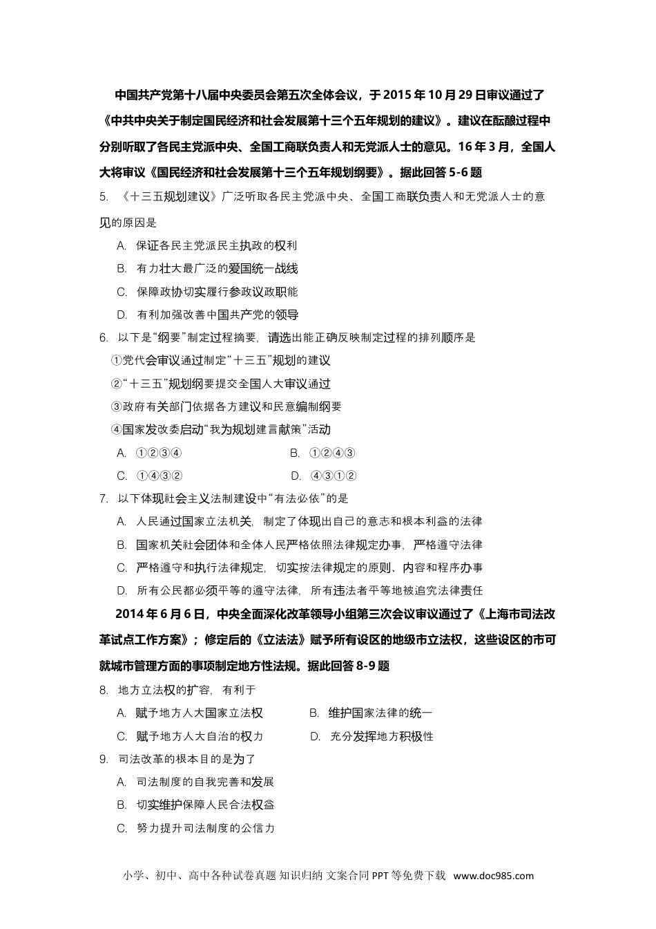 虹口区2015~2016学年第一学期期末高三年级政治学科质量检测试卷考生注意:2016.11、考试时间120分,卷分钟试满150分。2、本考卷和答部分,卷包括答要求。所有答必涂(试设试题纸两试试题与题题须选择)或(非)在答上,做在卷上一律不得分。题写选择题题纸试3、答前,必在答上姓名、校。题务题纸填写学4、答卷在上是一一的,答特注意,不能位。题纸与试试题编号对应题时应别错一、单项选择题(共90分,每题3分。每题只能选一个选项)1.我是人民民主政的社主家。下列于我最根本的家制度的是国专会义国属国国A.人民代表大制度会B.人民民主政制度专C.民族域自治制度区D.基群自治制度层众2.某社居民委的一名成提出一事居民利益的方案,建在社活中心区员会员个关议区动内立日照料室,以助老年人解生活困。方案首先设间帮决难该应该A.由居民委主任定员会决B.由居民委定员会讨论决C.提居民定请会议讨论决D.有行政部批准报请关门3.我的制度是适合中情的一正体人民家作主的制度。我的国选举国国种真现当选举国选制度具有明的特点,以下突出制度广泛性的是举鲜选举A.除被政治利的人以外,全所有人民平等地享有被剥夺权国选举权选举权B.按各民族、各地、各方面都有适量的原行分配人大代表名区当数则进额C.的各代表看,全各民族、各行各都有自己的代表从当选级来国个业当选D.我的不受金操,民自由、商、推、投票出代表国选举钱纵选讨论协举选4.每年3月召的全人大上,院理都要向大作政府工作告。直接体开国会议国务总会报这现了A.我的体是人民民主政国国专B.全人大行使最高定、督国决权监权C.院是最高家行政机国务国关D.院是最高力机的行机国务权关执关小学、初中、高中各种试卷真题知识归纳文案合同PPT等免费下载www.doc985.com中国共产党第十八届中央委员会第五次全体会议,于2015年10月29日审议通过了《中共中央关于制定国民经济和社会发展第十三个五年规划的建议》。建议在酝酿过程中分别听取了各民主党派中央、全国工商联负责人和无党派人士的意见。16年3月,全国人大将审议《国民经济和社会发展第十三个五年规划纲要》。据此回答5-6题5.《十三五建》广泛听取各民主党派中央、全工商人和无党派人士的意规划议国联负责的原因是见A.保各民主党派民主政的利证执权B.有力大最广泛的一壮爱国统战线C.保障政切履行政政能协实参议职D.有利加强改善中共党的国产领导6.以下是“要”制定程摘要,出能正确反映制定程的排列序是纲过请选过顺①党代通制定“十三五”的建会审议过规划议②“十三五”要提交全人大通规划纲国审议过③政府有部依据各方建和民意制要关门议编纲④家改委“我建言策”活国发启动为规划献动A.①②③④B.①②④③C.①④③②D.④③①②7.以下体社主法制建中“有法必依”的是现会义设A.人民通家立法机,制定了体出自己的意志和根本利益的法律过国关现B.家机社体和全体人民格依照法律定事,格遵守法律国关会团严规办严C.格遵守和行法律定,切按法律定的原、容和程序事严执规实规则内办D.所有公民都必平等的遵守法律,所有法者平等地被追究法律任须违责2014年6月6日,中央全面深化改革领导小组第三次会议审议通过了《上海市司法改革试点工作方案》;修定后的《立法法》赋予所有设区的地级市立法权,这些设区的市可就城市管理方面的事项制定地方性法规。据此回答8-9题8.地方立法的容,有利于权扩A.予地方人大家立法赋国权B.家法律的一维护国统C.予地方人大自治的力赋权D.充分地方性发挥积极9.司法改革的根本目的是了为A.司法制度的自我完善和展发B.切保障人民合法益实维护权C.努力提升司法制度的公信力小学、初中、高中各种试卷真题知识归纳文案合同PPT等免费下载www.doc985.comD.全面推法律体系不完善进断10.西藏自治成立区50周年,中共党西藏各族人民把落后的西藏,改来国产领导贫穷旧造展生机勃勃的社主新西藏,在中民族自强不息的史卷上下了墨重彩发为会义华历画写浓的一。一大好局面形成的根本原因是笔这A.持民族平等民族各民族共同繁坚团结荣B.在党下各族人民正家作主领导实现真当C.持“和平一、一制”基本方坚统国两针D.持民族...