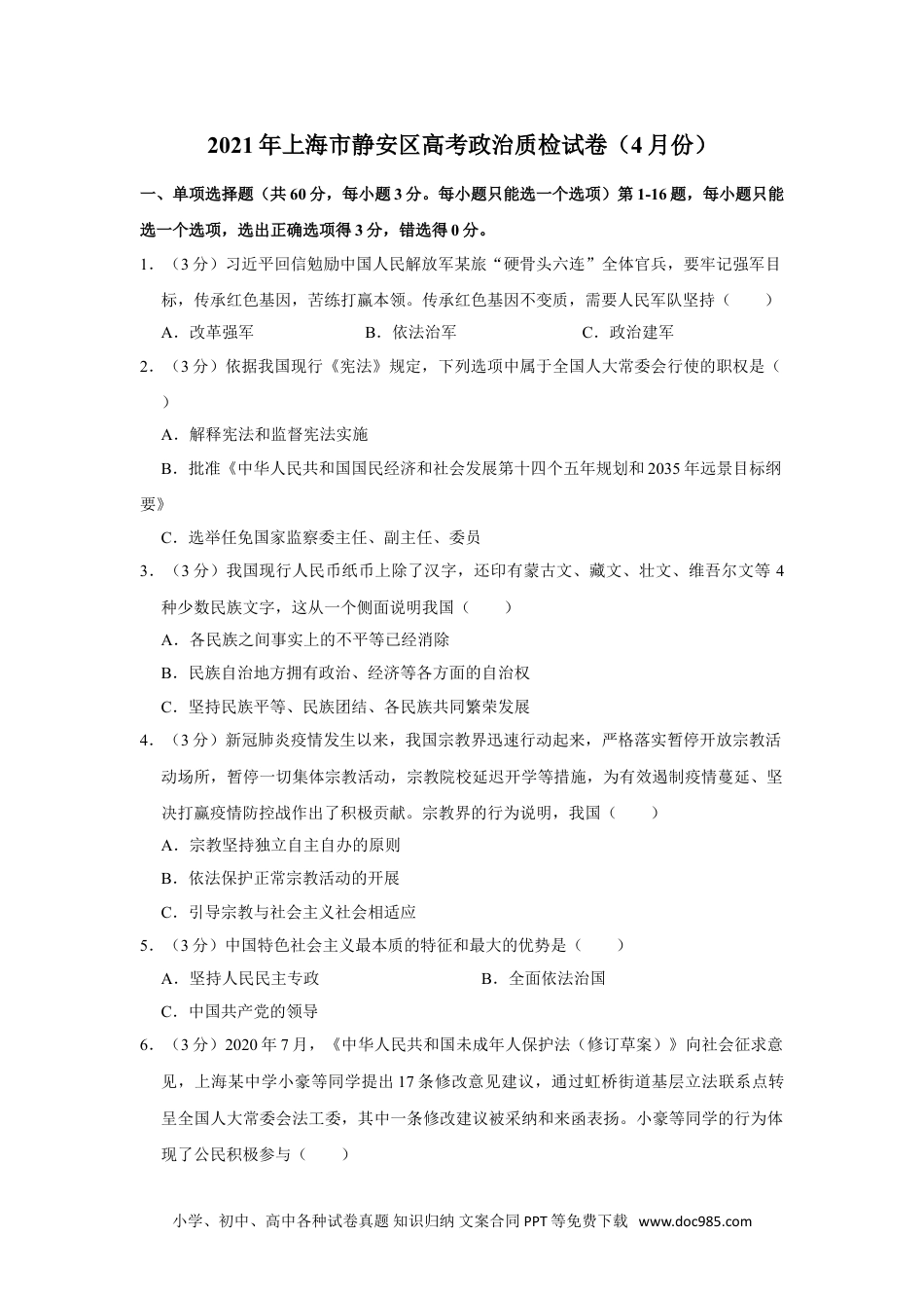 2021年上海市静安区高考政治质检试卷(4月份)一、单项选择题(共60分,每小题3分。每小题只能选一个选项)第1-16题,每小题只能选一个选项,选出正确选项得3分,错选得0分。1.(3分)习近平回信勉励中国人民解放军某旅“硬骨头六连”全体官兵,要牢记强军目标,传承红色基因,苦练打赢本领。传承红色基因不变质,需要人民军队坚持()A.改革强军B.依法治军C.政治建军2.(3分)依据我国现行《宪法》规定,下列选项中属于全国人大常委会行使的职权是()A.解释宪法和监督宪法实施B.批准《中华人民共和国国民经济和社会发展第十四个五年规划和2035年远景目标纲要》C.选举任免国家监察委主任、副主任、委员3.(3分)我国现行人民币纸币上除了汉字,还印有蒙古文、藏文、壮文、维吾尔文等4种少数民族文字,这从一个侧面说明我国()A.各民族之间事实上的不平等已经消除B.民族自治地方拥有政治、经济等各方面的自治权C.坚持民族平等、民族团结、各民族共同繁荣发展4.(3分)新冠肺炎疫情发生以来,我国宗教界迅速行动起来,严格落实暂停开放宗教活动场所,暂停一切集体宗教活动,宗教院校延迟开学等措施,为有效遏制疫情蔓延、坚决打赢疫情防控战作出了积极贡献。宗教界的行为说明,我国()A.宗教坚持独立自主自办的原则B.依法保护正常宗教活动的开展C.引导宗教与社会主义社会相适应5.(3分)中国特色社会主义最本质的特征和最大的优势是()A.坚持人民民主专政B.全面依法治国C.中国共产党的领导6.(3分)2020年7月,《中华人民共和国未成年人保护法(修订草案)》向社会征求意见,上海某中学小豪等同学提出17条修改意见建议,通过虹桥街道基层立法联系点转呈全国人大常委会法工委,其中一条修改建议被采纳和来函表扬。小豪等同学的行为体现了公民积极参与()小学、初中、高中各种试卷真题知识归纳文案合同PPT等免费下载www.doc985.comA.民主监督,提高民主意识B.民主决策,行使民主权利C.民主管理,实现当家作主7.(3分)社会经济活动包括生产、交换、分配、消费四个环节。下列现象中属于数据要素作用于生产环节的是()A.某车企依托汽车驾驶者使用数据的研究开发无人驾驶的技术B.沪上多家大型超市根据用户消费偏好分析数据调整供货结构C.大数据从业者通过为市场主体提供数据服务而大幅增加收益8.(3分)2020年我国GDP逆势增长2.3%,首次突破100万亿人民币大关。这一数据表明我国()A.经济结构越来越优化B.市场规模越来越扩大C.人民生活越来越富裕9.(3分)小李到某超市购物时因地面湿滑不慎摔倒骨折,花费医药费6080元,经与超市多次协商未果,小李选择到仲裁机构进行仲裁。下列有关这一维权途径的说法正确的是()A.实行一裁终局制度B.可以单方面提请仲裁C.裁决书不具有法律约束力10.(3分)国内某汽车集团车间里的每条生产流水线都配有机器人作业,这些机器人几乎承担了车间生产流水线的全部生产活动。从生产要素角度看,这些机器人属于()A.科技要素B.资本要素C.劳动要素11.(3分)航空行业的核心平台G企业通过股权激励推行薪酬改革,科技骨干冬冬以100万元现金入股,并于一年后拿到了一笔60万元的股权奖励。下列对此改革举措的认识正确的是()A.60万元是按技术要素分配所得收入B.完善初次分配可以调动职工积极性C.通过再分配更加注重了社会的公平12.(3分)我国近年来,以上年为基期的CPI如表(基期CPI一般定位100)。从表中数据可以得出,我国2017﹣2020年CPI()小学、初中、高中各种试卷真题知识归纳文案合同PPT等免费下载www.doc985.com2017201820192020101.6102.1102.9102.5A.持续上涨B.保持不变C.有升有降13.(3分)下列说法中,符合辩证法的选项是()A.和谐就是美和善B.不登高山不知天之高也,不临深谷不知地之厚也C.在纯粹的光明中就像在纯粹的黑暗中一样,什么也看不见14.(3分)教育部办公厅近日印发《关于加强中小学生手机管理工作的通知》,要求中小学生原则上不得将个人手机带入校园,确有需求的,经家长同意、书面提出申请,进校后手机应由学校统一保管,禁止带入课堂。该要求遵循的哲学依据是()A....