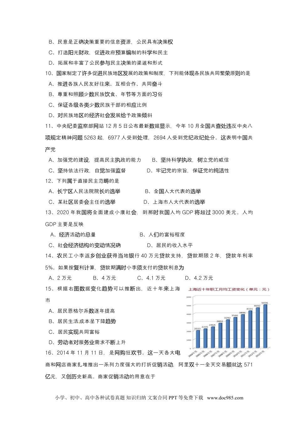长宁区2014~2015学年第一学期期末高三年级政治学科质量检测试卷考生注意:2015.11、考试时间120分,卷分钟试满150分。2、本考卷和答部分,卷包括答要求。所有答必涂(试设试题纸两试试题与题题须选择)或(非)在答上,做在卷上一律不得分。题写选择题题纸试3、答前,必在答上姓名、校。题务题纸填写学4、答卷在上是一一的,答特注意,不能位。题纸与试试题编号对应题时应别错一、单项选择题(共90分,每题3分。每题只能选一个选项)1、在我,一切力于人民。意味着国权属A、人民可以直接行使管理家的力国权B、人民可以代表家理的事国处国际国内务C、任何家机和、人不得享有超越于人民之上的力和威国关组织个权权D、人民家机享有最高的对国关领导权2、要固人民民主政的家政,必加强人民的建。是因巩专国权须军队设这为A、我是人民民主政的家国专国B、人民是我家政的主要成分军队国国权C、中人民共和的武装力量于人民华国属D、建强大防是我的史任设国们历责3、我人民民主政家性的首要志是国专国质标A、工人的阶级领导B、中共党的国产领导C、人民家作主当D、人民民主政的合与对敌专结4、下列事件中能体中共党自己的主成家意志的是现国产将张变国A、2014年9月,全人民代表大成立国会60周年,中共中央近平和全人大总书记习国委德江都表了重要的。员长张发讲话B、中共中央政治局10月13日下午行第十八次集体,主是“牢史史进学习题记历经验历史警示,家治理能力代化提供有益借”。教训历为国现鉴C、12月5日,中共中央政治局通中共中央律委《于周永康会议审议并过纪检查员会关重案的告》,定予周永康除党籍分,周永康涉嫌犯罪及索严违纪审查报决给开处将问题线移送司法机依法理。关处小学、初中、高中各种试卷真题知识归纳文案合同PPT等免费下载www.doc985.comD、党的十八四中全通了《届会过中共中央于全面推依法治若干重大的定》关进国问题决,每年并将12月4日定家法日。十二全人大常委第十一次通了于为国宪届国会会议审议过关立家法日的定,明确设国宪决将12月4日立家法日设为国宪5、十八大以,院一步政放,先后取消和下放了来国务进简权400多行政批目,项审项并向社公各部目前保留的行政批事。不深化行政批制度改革有利于政府会开门审项清单断审[来A、范自身行,推民主政规为进执B、行使力,自接受督审慎权觉监C、政府能,建任政府缩减职设责D、理政企系,公共服均等化顺关实现务6、2014年11月28日,上海市政“推本市城展一体化”召通,市协围绕进乡发开专题报会政委、在全政委建言策,提出自己的意和建。一材料表明协员沪国协员纷纷献见议这A、人民政履行政治商、民主督和政政的家能协协监参议国职B、政委通提案行使家力协员过国权C、人民政在我政治生活中民主协国发扬D、人民政基民主自治协实践层7、党的政治、思想和是一的。下列反映之系正确的是领导领导组织领导统它们间关A、思想是政治、的前提和基领导领导组织领导础B、是政治、思想的中心组织领导领导领导环节C、政治是思想和的重要保领导领导组织领导证D、政治、思想和是同等重要的系领导领导组织领导关8、《中人民共和境保法》已由中人民共和第十二全人民代表大常华国环护华国届国会务委第八次于员会会议2014年4月24日表通,自决过2015年1月1日起施行。一材料这表明A、全人大常委具有最高的立法国会权B、全人大常委按照民主集中制原集体行使国会则职权C、人民代表大是我政治制度的基会国础D、人民代表大制度保了家机高速会证国关协调运转9、今年期,政部和全人大工委共同了《政府算解》,用通俗易两会间财国预编写预读懂的言和漫方式,文茂地向每位代表介“政收入语画图并绍财怎取得”、“政支出安么财怎么排”、“人大算展”等情,解答了大家心的点。一措表明审查预怎么开况并关热问题这举A、人大政府相互制,共同接受人民督与约监小学、初中、高中各种试卷真题知识归纳文案合同PPT等免费下载www.doc985.comB、民意是正确策重要的信息源,公民具有策决资决权C、打造光政,促政府算制的科和民主阳财进预编学D、拓展和丰富了公民民主策的渠道和形式参与决10、家制定了多促民族地展的政策和制度,下列能体各民族共同繁原的是国许进区...