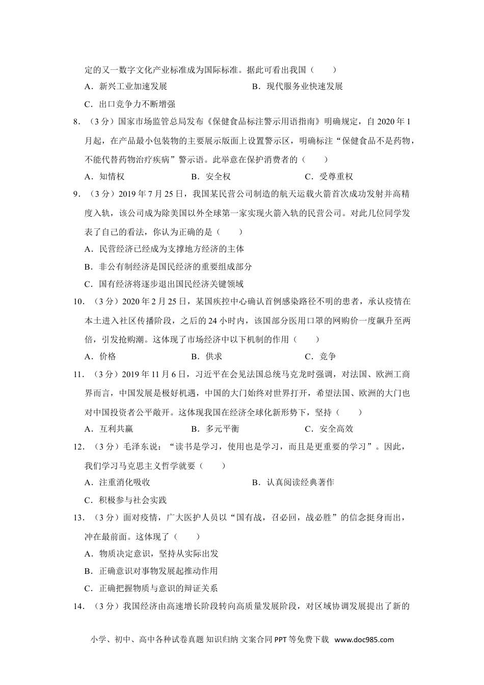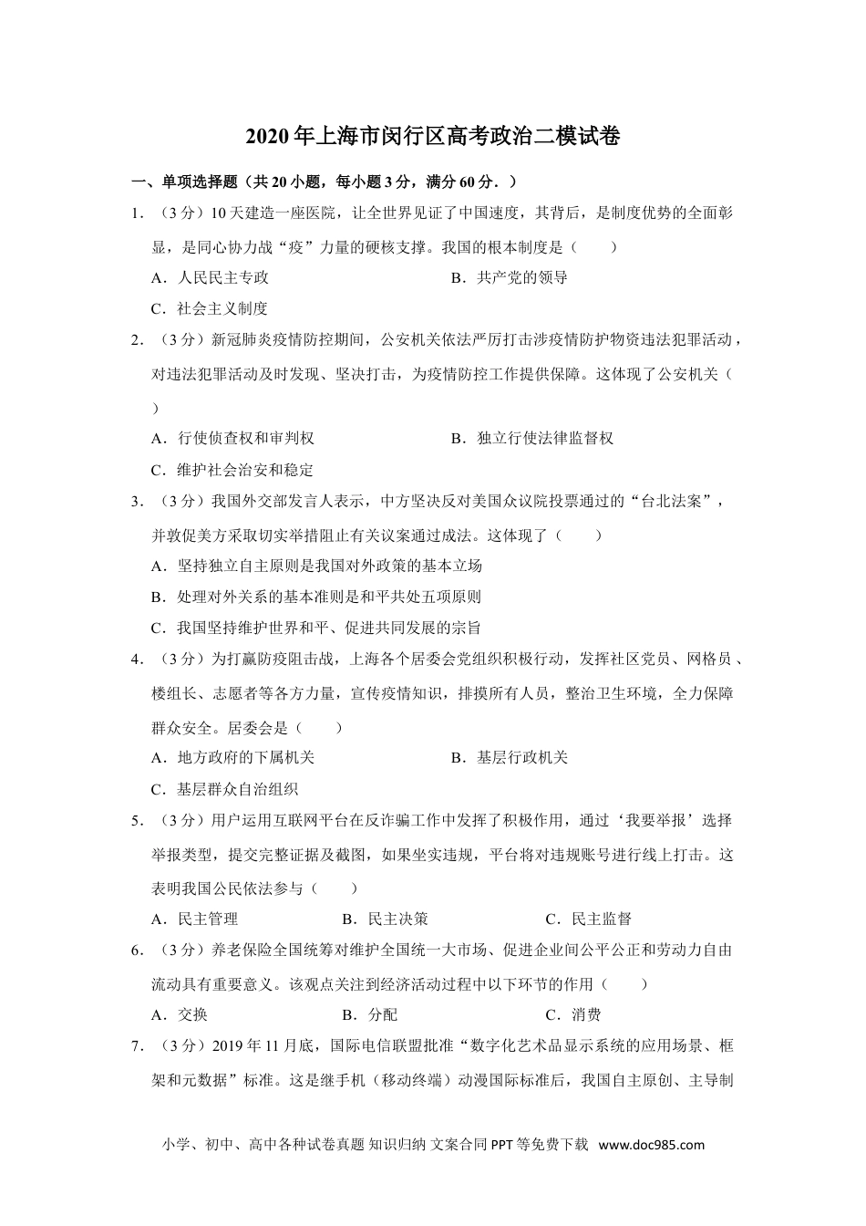2020年上海市闵行区高考政治二模试卷一、单项选择题(共20小题,每小题3分,满分60分.)1.(3分)10天建造一座医院,让全世界见证了中国速度,其背后,是制度优势的全面彰显,是同心协力战“疫”力量的硬核支撑。我国的根本制度是()A.人民民主专政B.共产党的领导C.社会主义制度2.(3分)新冠肺炎疫情防控期间,公安机关依法严厉打击涉疫情防护物资违法犯罪活动,对违法犯罪活动及时发现、坚决打击,为疫情防控工作提供保障。这体现了公安机关()A.行使侦查权和审判权B.独立行使法律监督权C.维护社会治安和稳定3.(3分)我国外交部发言人表示,中方坚决反对美国众议院投票通过的“台北法案”,并敦促美方采取切实举措阻止有关议案通过成法。这体现了()A.坚持独立自主原则是我国对外政策的基本立场B.处理对外关系的基本准则是和平共处五项原则C.我国坚持维护世界和平、促进共同发展的宗旨4.(3分)为打赢防疫阻击战,上海各个居委会党组织积极行动,发挥社区党员、网格员、楼组长、志愿者等各方力量,宣传疫情知识,排摸所有人员,整治卫生环境,全力保障群众安全。居委会是()A.地方政府的下属机关B.基层行政机关C.基层群众自治组织5.(3分)用户运用互联网平台在反诈骗工作中发挥了积极作用,通过‘我要举报’选择举报类型,提交完整证据及截图,如果坐实违规,平台将对违规账号进行线上打击。这表明我国公民依法参与()A.民主管理B.民主决策C.民主监督6.(3分)养老保险全国统筹对维护全国统一大市场、促进企业间公平公正和劳动力自由流动具有重要意义。该观点关注到经济活动过程中以下环节的作用()A.交换B.分配C.消费7.(3分)2019年11月底,国际电信联盟批准“数字化艺术品显示系统的应用场景、框架和元数据”标准。这是继手机(移动终端)动漫国际标准后,我国自主原创、主导制小学、初中、高中各种试卷真题知识归纳文案合同PPT等免费下载www.doc985.com定的又一数字文化产业标准成为国际标准。据此可看出我国()A.新兴工业加速发展B.现代服务业快速发展C.出口竞争力不断增强8.(3分)国家市场监管总局发布《保健食品标注警示用语指南》明确规定,自2020年1月起,在产品最小包装物的主要展示版面上设置警示区,明确标注“保健食品不是药物,不能代替药物治疗疾病”警示语。此举意在保护消费者的()A.知情权B.安全权C.受尊重权9.(3分)2019年7月25日,我国某民营公司制造的航天运载火箭首次成功发射并高精度入轨,该公司成为除美国以外全球第一家实现火箭入轨的民营公司。对此几位同学发表了自己的看法,你认为正确的是()A.民营经济已经成为支撑地方经济的主体B.非公有制经济是国民经济的重要组成部分C.国有经济将逐步退出国民经济关键领域10.(3分)2020年2月25日,某国疾控中心确认首例感染路径不明的患者,承认疫情在本土进入社区传播阶段,之后的24小时内,该国部分医用口罩的网购价一度飙升至两倍,引发抢购潮。这体现了市场经济中以下机制的作用()A.价格B.供求C.竞争11.(3分)2019年11月6日,习近平在会见法国总统马克龙时强调,对法国、欧洲工商界而言,中国发展是极好机遇,中国的大门始终对世界打开,希望法国、欧洲的大门也对中国投资者公平敞开。这体现我国在经济全球化新形势下,坚持()A.互利共赢B.多元平衡C.安全高效12.(3分)毛泽东说:“读书是学习,使用也是学习,而且是更重要的学习”。因此,我们学习马克思主义哲学就要()A.注重消化吸收B.认真阅读经典著作C.积极参与社会实践13.(3分)面对疫情,广大医护人员以“国有战,召必回,战必胜”的信念挺身而出,冲在最前面。这体现了()A.物质决定意识,坚持从实际出发B.正确意识对事物发展起推动作用C.正确把握物质与意识的辩证关系14.(3分)我国经济由高速增长阶段转向高质量发展阶段,对区域协调发展提出了新的小学、初中、高中各种试卷真题知识归纳文案合同PPT等免费下载www.doc985.com要求。不能简单要求各地区在经济发展上达到统一水平,而是要根据各地区的条件,走合理分工、优化发展的路子。这说明我们想问题办事情要(...