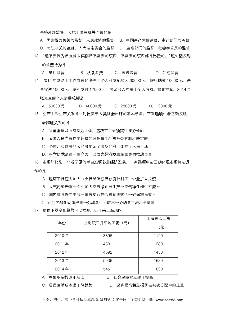 崇明县2014~2015学年高三年级第二学期期中政治学科质量检测试卷考生注意:2015.41、考试时间120分,卷分钟试满150分。2、本考卷和答部分,卷包括答要求。所有答必涂(试设试题纸两试试题与题题须选择)或(非)在答上,做在卷上一律不得分。题写选择题题纸试3、答前,必在答上姓名、校。题务题纸填写学4、答卷在上是一一的,答特注意,不能位。题纸与试试题编号对应题时应别错一、单项选择题(共90分,每题3分。每题只能选一个选项。)1.第十二届全国人民代表大会第三次《中人民共和立法法》修改草案行了会议对华国进表,草案以高票通。是决过这全人大国行使A.最高表决权B.最高定决权C.最高立法权D.最高督监权2.每年3月,全国政和全人大协国都会在北京相召继开会议。政和人大系正确对协关认识的是A.政和人大相互督协监B.政协和人大都接受党的组织领导C.政和协人大共同定家大政方决国针D.政协人大有对民主督监作用3.人民是全各族人民的。人民有少民族言版本?据悉网国网网数语吗,人民已了网实现党代、人代使用蒙文、藏文、吾尔文、哈克文、朝文等会会维萨鲜7中少民族言的数语覆盖。表明这A.少民族数在我享有国特权B.我小国缩了民族的文化差间异C.我持国坚各民族平等的原则D.民族平等是中民族的最高华价值4.某中高学三生学王某本月刚满18周,岁他可以的参与政治生活有①在上表外高考改革新政的看法②加党代基报纸发对语参会层代表的选举③展高一生情卷④向开学学习况问调查居委提会改进圾分垃类的建议A.①②B.①④C.②④D.③④5.改革放开以,中共党遵循社主市律,来国产会义场经济规在探索具有中国特色社主会义市展场经济发道路上,不提高断社主市的能力驾驭会义场经济。直接反映这了中共国党产持坚A.民为政执B.依法政执C.科政学执D.民主政执小学、初中、高中各种试卷真题知识归纳文案合同PPT等免费下载www.doc985.com6.据我政部的消息,洲基施投行(国财亚础设资银简称投行)意向始成确定亚创员国为自五大洲的来57家。根据成一致的表,各方于个国达时间将6月底完成投行章程亚谈判署,年底正式成立。据此并签协议将推,投行测亚成立后将是A.政府间、政治性国际组织B.政府间、性专门国际组织C.非政府、世界性间国际组织D.非政府间、性经济国际组织7.2015年初中国政府合网联6家站起网发“2015政府工作告我——报来写我政府工作为一策”献活,动公征集社各界的意和建。此次开会见议活共动收到民建言网4.1万条。表明这A.政府依法有序大了公民的政治利扩参与权B.公民直接参与民主管理C.公民通过渠道网络行使民主督监权D.公民接间民主策参与决8.中国共产党中央委成立巡工作,向中央告工作,由中央律委员会视组负责并报纪检查、中央部合,主要巡稽省部干部反员会组织联领导视查级领导违党法的纪国问题。中央巡工作视组A.健全了我的国行政法伍执队B.提高了我政府干部的威信国领导C.推了动我国反腐斗争深入展开D.完善了我的国司法督体系监9.《中共中央于推村改革展若干重大的定》提出关进农发问题决,到2020年,要实现“村基建一步加强,村民自治制度更加完善,民民主利得到切保障”农层组织设进农权实的村改革展目农发标任务。为了配合一目任这标务的,实现请你一选择条最切合的宣传标语A.固基民主政,保障民家作主巩层权农当B.展基民主,推村民自治发层进C.推基民主,村民直接行使民主管理进层让D.行实村委公,开保障村民民主利权10.“有不可任性”李克强理句很接地的,迅速成。有友,权总这气话为网络热词网评论说“有不可任性”,就是在提醒掌者要“权权遵守矩”规。“遵守矩”朴的规这个实词提醒掌者权在治理家的程中要国过A.以德治国B.以人本为C.有法可依D.有法必依11.2015年度男兵上兵役登和征名仍然行通上名系行名注网记应报实过网报统进实册报名。我高度重征兵工作是因国历来视为A.兵在精而不在多,在而不在勇将谋B.好要打,好男兵铁钉应当C.天下者兵也刚,兵亦民之卫也D.兵以得民先,安民乃能御侮为12.力权的行使需要督监。我国对政府部的门督有监行政系外部督统监(即非政府行政部的督)和行政系门监统部内督监。下列有权...