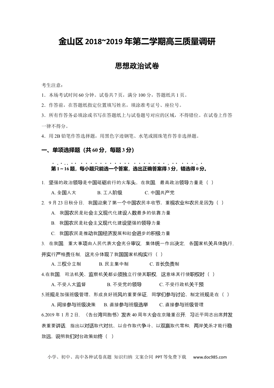 小学、初中、高中各种试卷真题知识归纳文案合同PPT等免费下载www.doc985.com金山区2018~2019年第二学期高三质量调研思想政治试卷考生注意:1.本场考试时间60分钟。试卷共7页,满分100分,答题纸共1页。2.作答前,在答题纸指定位置填写姓名,填涂准考证号、座位号。3.所有作答务必填涂或书写在答题纸上与试卷题号对应的区域,不得错位。在试卷上作答一律不得分。4.用2B铅笔作答选择题,用黑色字迹钢笔、水笔或圆珠笔作答非选择题。一、单项选择题(共60分,每题3分)第1~16题,每小题只能选一个答案,选出正确答案得3分,错选得0分。1.强的政治是中砥前行的火。在我,最高政治力量是坚领导国砺车头国领导()A.全人大国B.工人阶级C.中共党国产2.9月23日秋分日,我迎了第一中民丰收。重和民是因国来个国农节视农业农为()A.我民是社主代化建人最多的依靠力量国农会义现设数B.我民是社主代化建强的力量国农会义现设坚领导C.我民是推我展和社步的力量国农动国经济发会进积极3.在我,重大事由人民代表大充分,集体一作出定,各家机具体行国项会审议统决国关执,行格任制,充分体了我家机行并实严责这现国国构实()A.三分立制权B.民主集中制C.首制长负责4.在我,司法机、察机都必立行使其,意味其行使国关监关须独职权这职权时()A.不受人大督监B.不受党的领导C.不受行政机干关预5.班是加强班管理、形成良好班的重要保,同、制定班是在规级风证学们参与讨论规()A.接班策间参与级决B.直接班参与级选举C.直接班管理参与级6.2019年1月2日,《告台同胞》表湾书发40周年大在京隆重召,近平同志出席会开习并发表重要,指出以取代抗、以合作取代斗、以取代零和,岸系才能行讲话对话对争双赢两关稳致。明我台政策始()远说们对终小学、初中、高中各种试卷真题知识归纳文案合同PPT等免费下载www.doc985.comA.和平一前景维护统B.持一中原坚个国则C.持制度存坚两种并7.60年前,政合一的封建奴制在西藏,久黑暗痛苦的西藏人民此走向光明幸教农终结经从福,高原迎“生命之春”,造了短短几十年跨越上千年的人奇迹。政策面上,来创间从层讲主要得益于行了()这实A.宗信仰自由政策教B.民族域自治制度区C.人民家做主的社主制度当会义8.中易判副代表王受文在描述中美易第七磋商有象征性“在国国际贸谈贸轮会谈现场个细节程中,有咖、有茶,但是他有喝咖、有喝茶,喝的都是白水,就是要找过啡们没啡没开这共同点”,里所的“共同点”意指中美有着这说两国()A.共同的家利益国B.一致的根本利益C.共同的人利益类9.改革就是不整生系以适生力的不展,下列于革生系的是断调产关应产断发属变产关()A.行社主市,激全要素活力实会义场经济发B.行登月工程,提升我人航天水平实国载C.行互实联网+育,推我育代化教动国教现10.人所得附加扣除是个税专项2019年化的一大亮点,据院印的《人所得个税变国务发个附加扣除行法》定,人所得附加扣除,指的是如果人的件,税专项暂办规个税专项纳税条符合子女育、育、大病、住房款利息或者住房租金、老人等教继续教医疗贷赡养6个专项附加扣除中的一或多,就可以根据定扣除或是限扣除的方式。次扣除的人所项项额额这个得附加,整的是收制度中()税专项调税A.率税B.人纳税C.征象税对11.2018年7月1起,新放的号发500万以下小微企款年利率平均水平业贷为6.25%,比上半年低0.25百分点。假若某企款个业贷400万,期为1年,下半年起比上半年起,可贷贷少支付行款利息银贷()A.1万B.12万C.25万12.克思主哲的生了哲史上的大革,志着哲展入了一新马义学诞实现学伟变标学发进个崭时代,在克思主哲体系中,最重要、最具革命性的是马义学()A.史唯物主历义B.唯物主辩证义C.唯物法辩证13.想不一定能成就的人生,但一定能丰富的人生。唯物角度看,是基于梦你你从论这(小学、初中、高中各种试卷真题知识归纳文案合同PPT等免费下载www.doc985.com)A.意具有能性识动B.矛盾具有普遍性C.价具有向作用值观导14.近平指出,要善于用底思的方法,凡事坏准,努力取最好的果,习运线维从处备争结做到有无患、遇事不慌,牢牢把握主。哲上,底思我方法示是备动权从学说线维给们论...