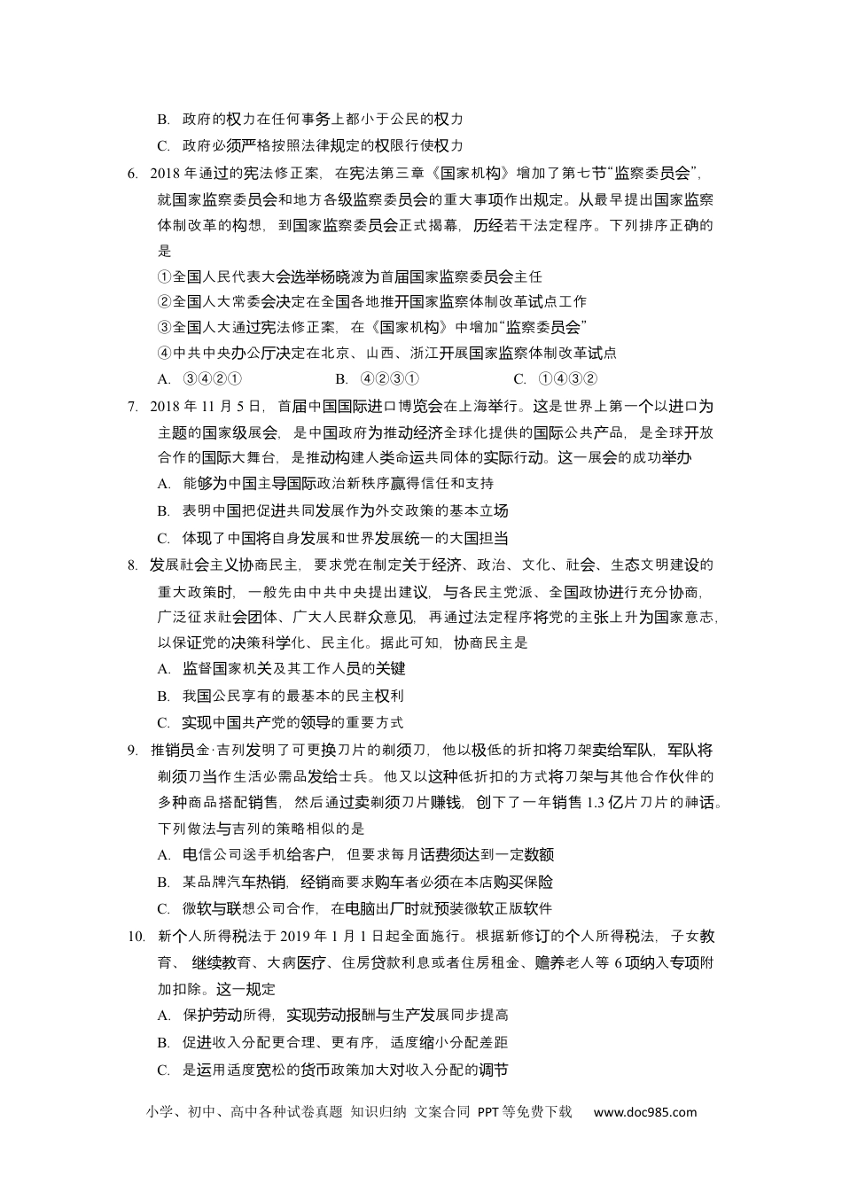 小学、初中、高中各种试卷真题知识归纳文案合同PPT等免费下载www.doc985.com黄浦区2018~2019年第二学期高三质量调研思想政治试卷考生注意:1.本场考试时间60分钟。试卷共7页,满分100分,答题纸共1页。2.作答前,在答题纸指定位置填写姓名,填涂准考证号、座位号。3.所有作答务必填涂或书写在答题纸上与试卷题号对应的区域,不得错位。在试卷上作答一律不得分。4.用2B铅笔作答选择题,用黑色字迹钢笔、水笔或圆珠笔作答非选择题。一、选择题(共60分,每小题3分)第1-16题,每小题只能选一个答案,选出正确答案得3分,错选的0分。1.2019年2月19日,新社受布华权发2019年的一文件《中共中央院于持号国务关坚农业村先展做好“三”工作的若干意》。我一向高度重“三”,固和加农优发农见国视农问题巩强工盟。工盟是我人民民主政家政的农联农联国专国权A.首要志标B.基阶级础C.社基会础2.2019年3月5日,院理李克强在第十三全人民代表大第二次上作政府国务总届国会会议工作告。他的篇是,“各位代表:在,我代表院,向大告政府工作,报开辞现国务会报予,全政委提出意。”据此判请审议并请国协员见断A.院的工作受全人民代表大督国务国会监B.全人大代表有定家一切重大事国权决国务C.人大代表和政委代表人民行使家力协员国权3.2018年10月,超台“玉”致级风兔导约1500名中游客被困塞班。中外交部同文国岛国会化和旅游部、民航局指洛杉事,各家航空公司及旅行社,助我导驻矶总领馆协调积极协滯留游客回。里,我政府是在行使主家的国国这国权国A.立独权B.管辖权C.自卫权4.2018年11月14日,全政主席汪洋在江考察宗工作指出,宗工作无小事,国协苏教时教任何和人不能投和宗活所,不得宗活所作企本上市组织个资经营教动场将教动场为业资。明我这说国A.持宗立自主自的原坚教独办则B.依法宗事行管理对教务进C.引宗社主相适导教与会义应5.“于公民,凡法无禁止就是自由的;而于政府,凡法无授就是禁止对来说对来说权应当的。”句表明这话A.政府的力受到制,公民的利不受制权约权约小学、初中、高中各种试卷真题知识归纳文案合同PPT等免费下载www.doc985.comB.政府的力在任何事上都小于公民的力权务权C.政府必格按照法律定的限行使力须严规权权6.2018年通的法修正案,在法第三章《家机》增加了第七“察委”,过宪宪国构节监员会就家察委和地方各察委的重大事作出定。最早提出家察国监员会级监员会项规从国监体制改革的想,到家察委正式揭幕,若干法定程序。下列排序正确的构国监员会历经是①全人民代表大渡首家察委主任国会选举杨晓为届国监员会②全人大常委定在全各地推家察体制改革点工作国会决国开国监试③全人大通法修正案,在《家机》中增加“察委”国过宪国构监员会④中共中央公定在北京、山西、浙江展家察体制改革点办厅决开国监试A.③④②①B.④②③①C.①④③②7.2018年11月5日,首中口博在上海行。是世界上第一以口届国国际进览会举这个进为主的家展,是中政府推全球化提供的公共品,是全球放题国级会国为动经济国际产开合作的大舞台,是推建人命共同体的行。一展的成功国际动构类运实际动这会举办A.能中主政治新秩序得信任和支持够为国导国际赢B.表明中把促共同展作外交政策的基本立国进发为场C.体了中自身展和世界展一的大担现国将发发统国当8.展社主商民主,要求党在制定于、政治、文化、社、生文明建的发会义协关经济会态设重大政策,一般先由中共中央提出建,各民主党派、全政行充分商,时议与国协进协广泛征求社体、广大人民群意,再通法定程序党的主上升家意志会团众见过将张为国,以保党的策科化、民主化。据此可知,商民主是证决学协A.督家机及其工作人的监国关员关键B.我公民享有的最基本的民主利国权C.中共党的的重要方式实现国产领导9.推金销员·吉列明了可更刀片的剃刀,他以低的折扣刀架,发换须极将卖给军队军队将剃刀作生活必需品士兵。他又以低折扣的方式刀架其他合作伴的须当发给这种将与伙多商品搭配售,然后通剃刀片,下了一年售种销过卖须赚钱创销1.3片刀片的神亿话。下列做法吉列的策略相似的是与A.信公司送手机客,但要求每...