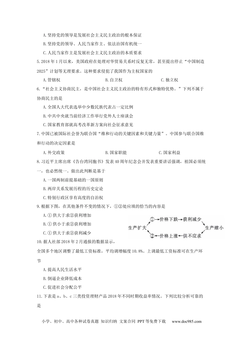 小学、初中、高中各种试卷真题知识归纳文案合同PPT等免费下载www.doc985.com虹口区2018~2019年第二学期高三质量调研思想政治试卷考生注意:1.本场考试时间60分钟。试卷共7页,满分100分,答题纸共1页。2.作答前,在答题纸指定位置填写姓名,填涂准考证号、座位号。3.所有作答务必填涂或书写在答题纸上与试卷题号对应的区域,不得错位。在试卷上作答一律不得分。4.用2B铅笔作答选择题,用黑色字迹钢笔、水笔或圆珠笔作答非选择题。一、选择题(共60分,每小题3分)第1-16题,每小题只能选一个答案,选出正确答案得3分,错选的0分。1.中国特色社会主义进入新时代,多党合作要有新气象。各民主党派要在服务大局中找准履职尽责切入点,为中共决策提出参考。因此,参政党有新面貌就应A.坚持多党合作的基本方针B.体现多党合作的显著特征C.积极建言献策提高参政本领2.近年来,我国积极推动政府部门向社会组织转移职能,引导社会组织积极参与社会管理。推动政府部门向社会组织转移职能目的是A.实现服务型政府自身建设核心目标B.提高公共服务质量,转变政府职能C.不断减少政府社会治理的支出成本3.中国裁判文书网是目前全球最有影响的法院审裁判文书网之--。审判文书互联网公开是法院系统回应社会关切,主动接受社会监督的重要举措。中国裁判文书网的运行体现A.依法治国的主体是广大人民群众B.有法必依是法制建设的中心环节C.社会主义法制保障社会主义民主4.2018年3月11日,十三届全国人民代表大会第一次会议表决通过了《中华人民共和国宪法修正案》。此次修宪贯彻了四个原则,即“坚持党对宪法修改的领导,严格依法按程序推进宪法修改,充分发扬民主,广泛凝聚共识,坚持对宪法作部分修改、不做大改”。以下说法对坚持“四个原则”概括最全面的是小学、初中、高中各种试卷真题知识归纳文案合同PPT等免费下载www.doc985.comA.坚持党的领导是发展社会主义民主政治的根本保证B.坚持党的领导、人民当家作主、依法治国有机统一C.人民当家作主是发展社会主义民主政治的本质要求5.2018年1月以来,美国政府在处理对华贸易关系时反复无常,甚至提出停止“中国制造2025”计划等无理要求。这种要求侵犯了我国作为主权国家的A.管辖权B.自卫权C.独立权6.“社会主义协商民主,是中国社会主义民主政治的特有形式和独特优势。”下列不属于协商民主的是A.全国人大代表选举中少数民族代表占一定比例B.中共中央就当前经济工作举行党外人士座谈会C.国家教育部就高考改革新方案向社会征求意见7.中国已被国际社会誉为联合国“维和行动的关键因素和关键力量”。中国参与联合国维和行动的决定因素是A.外交政策B.国家职能C.国家利益8.习近平主席出席《告台湾同胞书》发表40周年纪念会并发表重要讲话强调,祖国必须统一,也必然统一。做出此判断是基于A.一国两制前提基础的一国原则B.两岸关系发展历程的历史定论C.特别行政区享有高度的自治权9.根据下图,在其他条件不变的情况下,①②处应填的恰当的内容是A.①供大于求②获利增加B.①供小于求②获利增加C.①供大于求②获利减少10.据人社部2018年2月通报的数据显示,全国多个地区调整了最低工资标准,平均调增幅度10.8%。上调最低工资标准可在生产环节A.提高人民生活水平B.倒逼企业降低成本C.促进社会分配公平11.下表是a、b、c三类投资理财产品2018年不同时期收益率情况。下列比较分析可靠的是小学、初中、高中各种试卷真题知识归纳文案合同PPT等免费下载www.doc985.com时间a类产品b类产品c类产品2018年3月9%5.5%3.0%2018年6月1.8%4.5%2.5%2018年10月4.5%3.0%2.2%A.a产品收益率高,适合中低收入者投资B.c产品可能是债券,收益低,安全性更低C.三类产品收益率总体下滑,a产品可能是股票12.习近平总书记在谈选人用人时指出,致天下之治者在人才,选人用人“勿以一恶忘其善,勿以小瑕掩其功”。这-选人用人的至理名言强调的是A.必须坚持两点论观点B.要重视事物量的积累C.把握矛盾的主要方面13.“创新、协调、开放、共享、绿色”五大发展理念是在立足中国社会主义初级阶段基本国情,总结我国发展实践,借鉴国外发展经验,适应新时代发展要求提出的。五大发展理念A.是对马克思主...