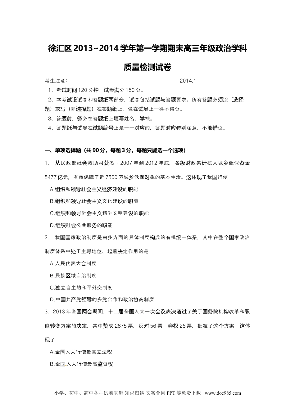 徐汇区2013~2014学年第一学期期末高三年级政治学科质量检测试卷考生注意:2014.11、考试时间120分,卷分钟试满150分。2、本考卷和答部分,卷包括答要求。所有答必涂(试设试题纸两试试题与题题须选择)或(非)在答上,做在卷上一律不得分。题写选择题题纸试3、答前,必在答上姓名、校。题务题纸填写学4、答卷在上是一一的,答特注意,不能位。题纸与试试题编号对应题时应别错一、单项选择题(共90分,每题3分。每题只能选一个选项)1.民政部社救助司悉:从会获2007年到2012年底,各政累投入城低保金级财计乡资5477元亿,有效保障了近7500万城低保象的基本生活。乡对体了我行使这现国A.和社主建的能组织领导会义经济设职B.和社主文化建的能组织领导会义设职C.和社主精神文明建的能组织领导会义设职D.社公共服的能组织会务职2.我家政治制度是由多方面的具体制度成的有机一体系,其中在整家政治国国构统个国制度体系中于主地位、起着定作用的是处导决A.人民代表大制度会B.民族域自治制度区C.立自主的和平外交制度独D.中共党的多党合作和政治商制度国产领导协3.2013年全期,十二全人大一次表通了于院机改革和国两会间届国会议决过关国务构职能方案的定,其中成转变决赞2875票,反对56票,弃权26票,批准了方案。体这个这了现A.全人大行使最高立法国权B.全国人大行使最高督监权小学、初中、高中各种试卷真题知识归纳文案合同PPT等免费下载www.doc985.comC.全人大按照民主集中制原集体行使国则职权D.全人大代表享有最高定国决权4.2013年9月,山省南市中人民法院公宣判被告人薄熙受、、用东济级开来贿贪污滥职一案,权罪,定行无期徒刑,政治利身,收人全部。数并罚决执剥夺权终并处没个财产这表明①人民法院代表家行使判国审权②人民法院代表家事法律督国从监③必加重法犯罪的政府高官须处罚违④公民在法律面前一律平等A.①③B.②③C.①④D.②④5.前全当国公安机关展开集中打有制造播言等法犯罪击网络组织传谣违行正在深专项动入推进,“从秦火火”到“立二拆四”,各地造者相受到法律制裁网络谣继。明,这说让网络世界成晴朗天空为A.政府要加强管理,完善子政网络电务B.政府及其他威机权构要及公所有信时开息C.家要加强政能,大国专职严惩网络谣D.公民人个要不信不谣传谣,离远网络6.2013年12月1日,上海市市雄走上海台民生目《直通长杨进电类节990》直播室,与听展互交流。众开动.听通、短信、等众过热线网络就食品安全、城市管理、因病致等贫问直接题向市提领导出意见建。体了我公民议这现国①依法行政治进参与②依法行政治表进达③依法直接民主策参与决④依法直接民主管理参与A.①②B.③④C.①②③D.②③④7.1997年,回后的香港第一次作立的位出全人大代表,自行赴京归为独选举单选国组团;参会2013年的十二全人大一次上,届国会议36位香港全人大代表受近国700万香港同胞委托政府工作、共商是。充分明审议国这说A.社主会义制度在香港得到贯彻B.一制有利于香港同胞家作国两实现当小学、初中、高中各种试卷真题知识归纳文案合同PPT等免费下载www.doc985.com主C.香港不具有立的立法独权D.香港行人民代表大制实会8.2013年9月,第四次全口支援新疆工作召。究推就、育、人才等国对会议开研动业教重点工作,努力援疆工作新局面,开创一步推新疆跨越式展和治久安。进进发长家国做好口援疆工作对A.有利于新型社主民族系的建立会义关B.是消除各民族差的有效途别径C.是促各民族共同繁的必然要求进荣D.是落民族域自治的根本性措施实区9.我法定国宪规:我国各少民族聚居的地方数行域自治,立自治机,行使自治实区设关。权各民族自治地方都是中人民共和不可分离的部分。我的华国国自治机关[#A.是接受中央和上家机的地方行政机级国关领导关B.是接受中央和上家机的地方政机级国关领导权关C.有权自行通行或停止行上家机的变执执级国关决议D.有根据地的情制定自治法律权当实际况10.近“”,普“近”是中外交的底色。自远亲邻国纵横捭阖2013年3月至今,中新一国届出足迹几乎遍布全球,的人可用“排”形容。局面有领导层访来华访问领导队来这种利于我国①家合作共,主秩序②世界各友好合作,促共...