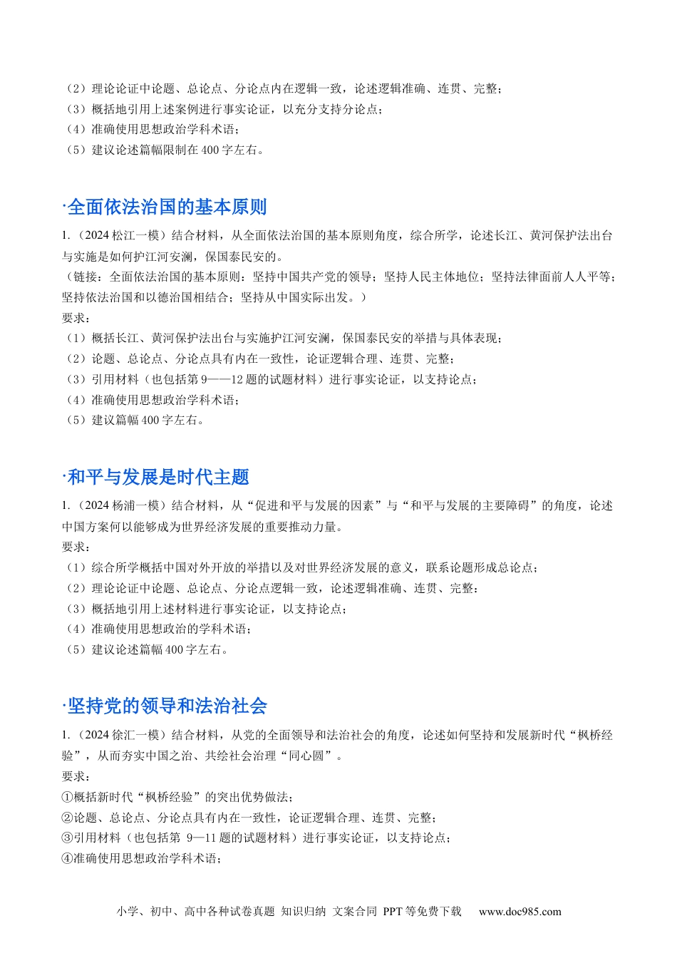 小学、初中、高中各种试卷真题知识归纳文案合同PPT等免费下载www.doc985.com专题08论述题·以人民为中心1.(2024黄浦一模)结合材料,从“人民建”和“为人民”的角度,论述上海如何全面践行人民城市理念。要求:(1)综合运用所学内容概括上海全面践行人民城市理念的做法,联系论题形成总论点;(2)理论论证中论题、总论点、分论点内在逻辑一致,论述逻辑较准确、连贯、完整;(3)概括地引用材料(也包括第11-14题的试题材料)进行事实论证,以充分支持分论点;(4)准确使用思想政治学科术语;(5)建议论述篇幅限制在400字左右。2.(2024浦东一模)结合材料,综合运用所学内容,论述《体育法》修订如何坚持以人民为中心的价值取向。要求:(1)综合运用所学内容概括《体育法》修订程序和内容中的价值取向,联系论题形成总论点;(2)理论论证中论题、总论点、分论点内在逻辑一致,论述逻辑准确、连贯、完整;(3)概括地引用上述材料进行事实论证,以充分支持分论点;(4)准确使用思想政治学科术语;(5)建议论述篇幅限制在400字左右。·坚持党的领导与高质量发展1.(2024静安一模)结合材料,论述坚持和加强党对科技创新工作的全面领导与坚持创新发展在推动上海经济高质量发展中的作用。要求:(1)概括坚持和加强党对科技创新工作的全面领导与坚持创新发展在推动上海经济高质量发展中的作用,联系论题形成总论点;(2)理论论证中论题、总论点、分论点内在逻辑一致,论述逻辑较准确、连贯、完整;(3)概括地引用材料(也包括第1-2题的试题材料)进行事实论证,以充分支持分论点;(4)准确使用思想政治学科术语;(5)建议论述篇幅限制在400字左右。·高质量发展与经济全球化1.(2024闵行一模)综合学科内容,从推动经济高质量发展和经济全球化与中国的角度,论述:我国是如何发展更高层次开放型经济,做全球发展贡献者的。要求:(1)综合运用所学内容概括中欧班列对世界经济发展的贡献;小学、初中、高中各种试卷真题知识归纳文案合同PPT等免费下载www.doc985.com(2)理论论证中论题、总论点、分论点内在逻辑一致,论述逻辑准确、连贯、完整;(3)概括地引用上述案例进行事实论证,以充分支持分论点;(4)准确使用思想政治学科术语;(5)建议论述篇幅限制在400字左右。·全面依法治国的基本原则1.(2024松江一模)结合材料,从全面依法治国的基本原则角度,综合所学,论述长江、黄河保护法出台与实施是如何护江河安澜,保国泰民安的。(链接:全面依法治国的基本原则:坚持中国共产党的领导;坚持人民主体地位;坚持法律面前人人平等;坚持依法治国和以德治国相结合;坚持从中国实际出发。)要求:(1)概括长江、黄河保护法出台与实施护江河安澜,保国泰民安的举措与具体表现;(2)论题、总论点、分论点具有内在一致性,论证逻辑合理、连贯、完整;(3)引用材料(也包括第9——12题的试题材料)进行事实论证,以支持论点;(4)准确使用思想政治学科术语;(5)建议篇幅400字左右。·和平与发展是时代主题1.(2024杨浦一模)结合材料,从“促进和平与发展的因素”与“和平与发展的主要障碍”的角度,论述中国方案何以能够成为世界经济发展的重要推动力量。要求:(1)综合所学概括中国对外开放的举措以及对世界经济发展的意义,联系论题形成总论点;(2)理论论证中论题、总论点、分论点逻辑一致,论述逻辑准确、连贯、完整:(3)概括地引用上述材料进行事实论证,以支持论点;(4)准确使用思想政治的学科术语;(5)建议论述篇幅400字左右。·坚持党的领导和法治社会1.(2024徐汇一模)结合材料,从党的全面领导和法治社会的角度,论述如何坚持和发展新时代“枫桥经验”,从而夯实中国之治、共绘社会治理“同心圆”。要求:①概括新时代“枫桥经验”的突出优势做法;②论题、总论点、分论点具有内在一致性,论证逻辑合理、连贯、完整;③引用材料(也包括第9—11题的试题材料)进行事实论证,以支持论点;④准确使用思想政治学科术语;小学、初中、高中各种试卷真题知识归纳文案合同PPT等免费下载www.doc985.com⑤篇幅400字左右。·坚持党的领导和基层民主1....