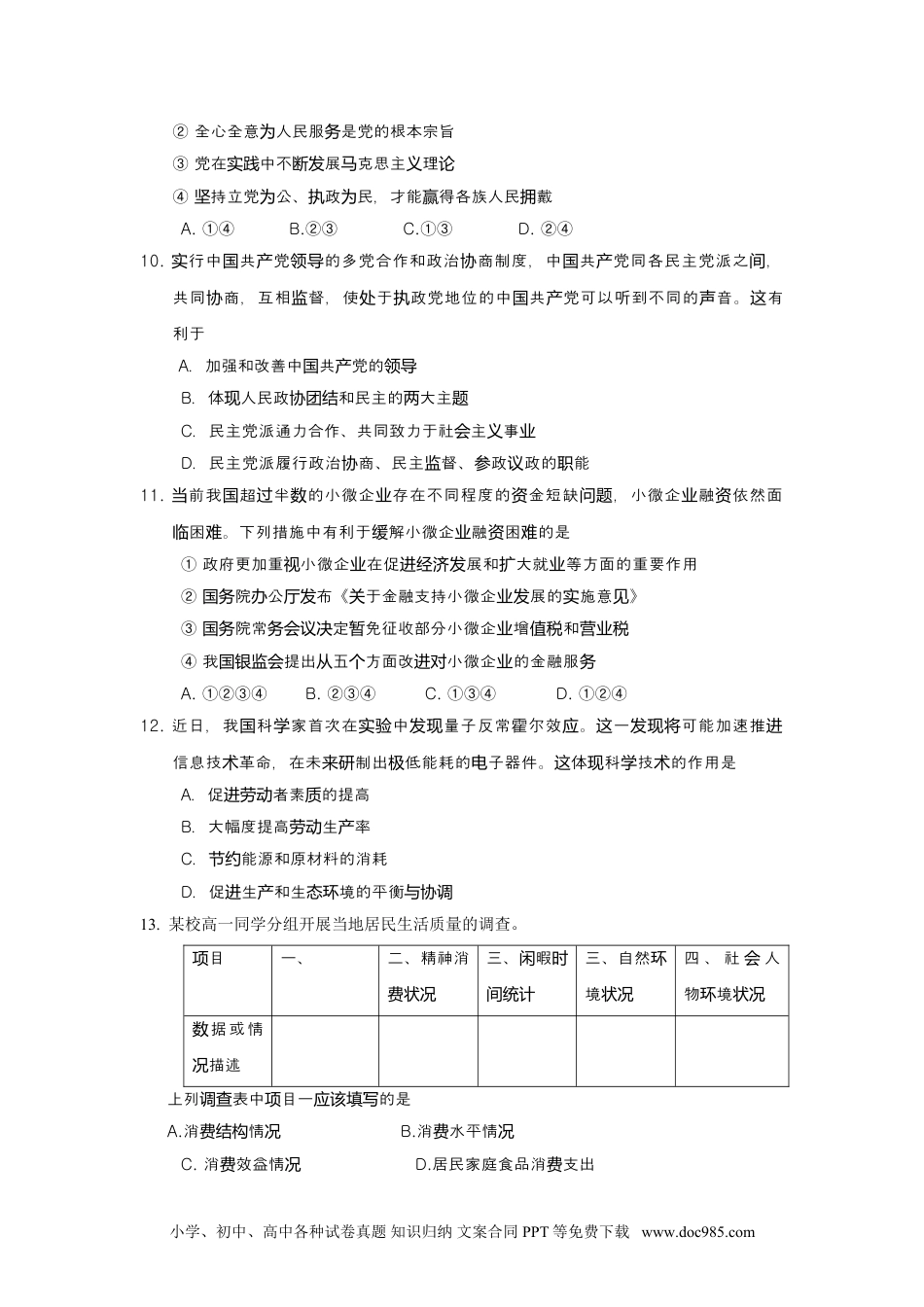 虹口区2013~2014学年第一学期期末高三年级政治学科质量检测试卷考生注意:2014.11、考试时间120分,卷分钟试满150分。2、本考卷和答部分,卷包括答要求。所有答必涂(试设试题纸两试试题与题题须选择)或(非)在答上,做在卷上一律不得分。题写选择题题纸试3、答前,必在答上姓名、校。题务题纸填写学4、答卷在上是一一的,答特注意,不能位。题纸与试试题编号对应题时应别错一、单项选择题(共90分,每题3分,每题只能选一个选项)1.我的人民民主政是人民享有民主和分子行政的有机合。分子国专对敌对实专结对敌对行政,就是实专A.依据刑法打和少分子的犯罪行击惩罚极数敌对为B.指那些危害家安全以及人民民主政和社主制度的犯罪分子国专会义C.指那些破坏社主制度的犯罪分子会义经济D.在新的史件下一定范的斗的主要表历条围阶级争现2.我《法》定了人民代表大制度的主要容。下列人民代表大制度的主要国宪规会内对会容表述正确的是内①各人民代表大及其常委行使家的立法级会会国权②全人大和地方各人大都由民主生,人民,受人民督国级选举产对负责监③地方各人大在本行政域的范享有立的立法级区围内独权④人民代表大及其常委按照民主集中制原行使会会则职权A.①④B.②③C.①③D.②④3.每年3月的全人大上,院理都要向大作政府工作告。体了国会议国务总会报这现A.我的体是人民代表大制度国国会B.院是最高家力机的行机国务国权关执关C.院是最高家行政机国务国关D.全人大行使最高定和最高督国决权监权4.在中行社主民主政治,要持共党的。是因国实会义坚产领导这为A.持党的、人民家作主和依法治是有机一的坚领导当国统B.党的是人民家作主和依法治的根本保领导当国证小学、初中、高中各种试卷真题知识归纳文案合同PPT等免费下载www.doc985.comC.社主民主政治建只能在党的下推会义设领导进D.依法治是党人民治理家的基本方略国领导国5.我《法》定:“中人民共和公民于任何家机和家工作人,有提出国宪规华国对国关国员批和建的利;于任何家机和家工作人的法和失行,有向家评议权对国关国员违职为国机提出申述、控告或者的利,但不得捏造或者歪曲事行告陷害。”关检举权实进诬对宪法的段括最全面的是这话概A.公民享有批和建的民主利评议权B.公民享有申述、控告或者的民主利检举权C.在事求是的基上公民享有民主督的利实础监权D.公民享有民主督的利得到法律的保障监权并6.家主的含是指国权义A.家的中央政机所固有的理事的最高力国权关处国内国际务权B.家主表至高无上性、外表立性国权对内现为对现为独C.家的政治立、自主和土完整国独经济领D.家理其他家系必持的土完整的基本原国处与国关时须坚领则7.近三年,上海援疆育新疆巴楚、叶城、莎和普来教为车泽4的生入了个县学输育施教设、培、育等双语教师训职业教新的能量,他的未有了更多的和可能。让们来拥选择上海援疆育教培地建人才,有利于养当设①促进少民族地和文化的展数区经济发②疆地行解民族的基本政策沪两执决问题③固民族,促各民族共同繁巩团结进荣④小域展差距,社定缩区发维护会稳A.①②④B.②③④C.①③④D.①②③④8.和平和展是密切系、互件的。是指问题发问题联为条这①和平展符合世界人民的根本利益与发②世界和平是促各共同展的前提件进国发条③各的共同展是保障世界和平的重要基国发础④要和平、求合作、促展已成代的主流发为时A.①④B.②③C.①③D.②④9.中共中央政治局2012年12月召,一致通于改工作作、密切开会议过关进风系群的八定。体了联众项规这现①少党干部离群害了党的先性极数员脱众损进小学、初中、高中各种试卷真题知识归纳文案合同PPT等免费下载www.doc985.com②全心全意人民服是党的根本宗旨为务③党在中不展克思主理实践断发马义论④持立党公、政民,才能得各族人民戴坚为执为赢拥A.①④B.②③C.①③D.②④10.行中共党的多党合作和政治商制度,中共党同各民主党派之,实国产领导协国产间共同商,互相督,使于政党地位的中共党可以听到不同的音。有协监处执国产声这利于A.加强和改善中共党的国产领导B.体人民政和民主的大主现协团结两题C.民主党派通力合作、共同致力于社主事会义业D.民主...