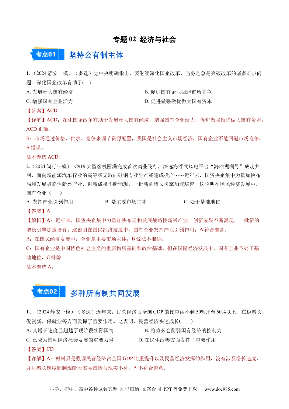 小学、初中、高中各种试卷真题知识归纳文案合同PPT等免费下载www.doc985.com专题02经济与社会坚持公有制主体1.(2024静安一模)(多选)党中央明确指出,要继续深化国企改革,当务之急是突破改革的诸多难点问题。深化国企改革有助于()A.发展壮大国有经济B.促进国有企业回避市场竞争C.增强国有企业活力D.促进做强做优做大国有资本【答案】ACD【详解】ACD:深化国企改革有助于发展壮大国有经济,增强国有企业活力,促进做强做优做大国有资本,ACD正确。B:市场通过价格、供求、竞争来调节资源配置,我国是社会主义市场经济,国有企业不能回避市场竞争,B错误。故本题选ACD。2.(2024闵行一模)C919大型客机圆满完成首次商业飞行,深远海浮式风电平台“海油观澜号”成功并网,面向新能源汽车行业的高等级无取向硅钢专业生产线建成投产……近年来,国资央企集中力量加快布局和发展战略性新兴产业,创新成果不断涌现,一批新的增长引擎加速培育。这说明在国民经济发展中,国有企业()A.发挥产业引领作用B.是主要市场主体C.处于基础地位【答案】A【解析】A:近年来,国资央企集中力量加快布局和发展战略性新兴产业,创新成果不断涌现,一批新的增长引擎加速培育。这说明在国民经济发展中,国有企业发挥产业引领作用,A符合题意。B:在国民经济发展中,企业是主要市场主体,B说法不准确。C:国有企业是中国特色社会主义的重要物质基础和政治基础,但在国民经济发展中,国有企业不处于基础地位,C排除。故本题选A。多种所有制共同发展1、(2024静安一模)(多选)近年来,民营经济占全国GDP的比重由不到50%升至60%以上,在稳增长、促创新、保就业等方面发挥了重要作用。这表明,民营经济快速成长()A.其增长速度已超越了现阶段实际国情B.将势必会削弱国有经济的控制力C.已成为推动经济社会发展的重要力量D.在民生改善方面发挥了重要作用【答案】CD【详解】A:材料只是强调民营经济占全国GDP比重提升以及民营经济发挥的作用,没有涉及增长速度,并且增长速度超越现阶段实际国情与现实不符,A不符合题意。小学、初中、高中各种试卷真题知识归纳文案合同PPT等免费下载www.doc985.comB:材料只是强调民营经济的作用,不涉及对国有经济的削弱作用,并且我国仍然是国有经济控制国民经济的命脉,在重要行业和关键领域占支配地位,B错误。CD:民营经济快速成长说明民营经济已成为推动经济社会发展的重要力量,在民生改善方面发挥了重要作用,CD符合题意。故本题选CD。2.(2024静安一模)依法保护民营企业产权和企业家权益。防止和纠正利用行政或刑事手段干预经济纠纷,以及执法司法中的地方保护主义。对材料主旨概括最准确的是()A.毫不动摇地巩固和发展多种所有制经济B.依法规范民营资本健康发展C.各种所有制经济应该具有同等竞争能力D.强化民营经济发展法治保障【答案】D【详解】A:毫不动摇地巩固和发展公制经济,A错误。B:材料涉及的是依法保护民营企业产权和企业家权益,而不是规范民营资本健康发展,B不符合题意。C:各种所有制经济依法平等使用生产要素,公平参与竞争,不意味着具有同等竞争能力,C错误。D:材料强调依法保护民营经济,D符合题意。故本题选D。3.(2024静安一模)(多选)政府在市场开拓组织化、贸易物流便利化、贸易平台创新和扩大出口退税品类等方面,帮助企业攻坚克难;进一步加大对外贸企业的资金支持,比如加大对进出口信贷支持;鼓励民营企业加大科技研发投入,提升产品技术含量和附加值,推动传统产业转型升级,培育新兴产业和新业态,为民营企业拓展新的市场空间。这将有助于()A.进一步推动民营企业参与外贸发展B.提升民营企业在外贸市场中的竞争力C.使民营资产在社会总资产中占优势D.更好地促进外贸增长潜力的持续释放【答案】ABD【详解】A:材料中政府采取政策帮助企业攻坚克难,加大对外贸企业资金支持,有助于进一步推动民营企业参与外贸发展,A符合题意。B:加大对企业的帮助,鼓励其加大科技研发,有助于提升民营企业在外贸市场中的竞争力,B符合题意。C:我国公有资产在社会总资产中占优势,C错误。D:为民营企业拓展新的市场空间,培育新业态新兴产业等措施...