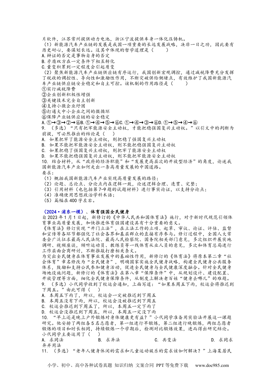 小学、初中、高中各种试卷真题知识归纳文案合同PPT等免费下载www.doc985.com2024届上海高三政治一模各区小作文文汇编(2024·青浦一模)上海赵巷:“枫桥经验”新样板一直以来,赵巷镇坚持和发展新时代“枫桥经验”,积极探索社会治理创新服务模式,改造升级了“赵巷镇社会治理创新服务中心”,实现人民群众矛盾纠纷调处“少跑一里路、只进一扇门、解决一揽事”。赵巷镇不断探索“农民”变“居民”的社区治理模式。设在居民家中的“巷心·客堂间”就是一个新探索。村里有什么大事小情,村民们都会聚到“巷心·客堂间”一起说说、一起议议,形成农民集中居住社区“村居民自治”的新模式,也是营造社区文明风尚、居民和谐邻里关系的一个缩影。近年来,赵巷镇政府自上而下推进法理堂建设,以家门口服务圈为标准,构建街镇—村居—小组三级法律服务网络,开展普法讲座61次,组织法治宣传活动36次。同时深入实施“律师来敲门”品牌项目,共现场解答群众咨询439次,通过电话、网络解答咨询272次,参与纠纷调解15次;该项目化“被动服务”为“主动问需”,推进公共法律服务体系建设,打通法律服务群众“最后一公里”。11.“枫桥经验”是20世纪60年代初浙江诸暨枫桥镇干部群众创造的“发动和依靠群众,坚持矛盾不上交,就地解决,实现捕人少、治安好”的基层治理经验。由此可见,“枫桥经验”()A.创造了基层治理的通用法则B.来自于基层群众的生动实践C.蕴涵了治国理政的基本方略12.(多选)2023年是毛泽东同志批示学习推广“枫桥经验”60周年,是习近平总书记指示坚持和发展“枫桥经验”20周年。党的二十大报告明确指出,坚持和发展新时代“枫桥经验”。这反映了中国共产党始终坚持()A.解放思想B.与时俱进C.居安思危D.实事求是13.(多选)赵巷镇积极探索将党群服务与信访服务合二为一,以村居“一站两中心”为载体,将信访服务与综治、信访、司法、公安等基层社会治理力量有机融合,为群众提供“点单式”服务。这种“党建+信访”模式坚持了()A.系统优化方法B.辩证的分与合C.从具体到抽象14.从乡村“枫桥经验”到城镇社区“枫桥经验”、网上“枫桥经验”,从社会治安领域扩展到经济、政治、文化、社会、生态等多个领域,“枫桥经验”必将薪火相传,历久弥新。“枫桥经验”的生命力在于坚持()A.稳中求进B.发展优先C.人民至上15.综合学科内容,从“人民当家作主”和“依法治国”的角度,论述如何坚持和发展新时代“枫桥经验”。(1)综合运用所学内容概括赵巷镇坚持和发展“枫桥经验”的两个途径,联系论题形成总论点;(2)理论论证中论题、总论点、分论点内在逻辑一致,论述逻辑准确、连贯、完整;(3)概括地引用上述案例信息进行事实论证,以充分支持分论点;(4)准确使用思想政治学科术语;(5)建议论述篇幅限制在400字左右。(2024·虹口一模)创设良好平台激发青春活力青年有理想、有本领、有担当,国家就有前途,民族就有希望。因此,党的二十大报告指出:“全党要把青年工作作为战略性工作来抓。”S市在市委领导下将建设青年发展型城市纳入工作重点,优化青年宜学环境,不断完善高等教育、职业教育、继续教育、资质认证等教育培训服务体系,着力建设终身学习型城市。同时,为了促进青年宜业宜家,出台了覆盖就业、创业、居住等领域的普惠性政策,破解青年就业居住难题,增强其创业底气,降低青年人落户门槛。轻松、娱乐、开放的人文环境有利于促进创意创新。S市积极回应青年人的高品质精神文化需求,建设青年友好“宜娱”之城,也让丰富多彩的文娱生活进一步激发青年人的创新创意灵感。11.《新时代的中国青年》白皮书指出,“中国特色社会主义新时代,是青年大有可为,也必将大有作为的大时代”。新时代青年大有可为,是因为他们()A.身处于中国特色社会主义的新时代小学、初中、高中各种试卷真题知识归纳文案合同PPT等免费下载www.doc985.comB.深植家国情怀,与国家人民共命运C.立足新时代,努力适应新发展要求12.(多选)S市某区委从优秀年轻干部中选派援藏援青援滇人才,与西部各族儿女一道,奋力谱写西部高质量发展新篇章。选拔优秀青年干部援边的作用在于()A.巩固...