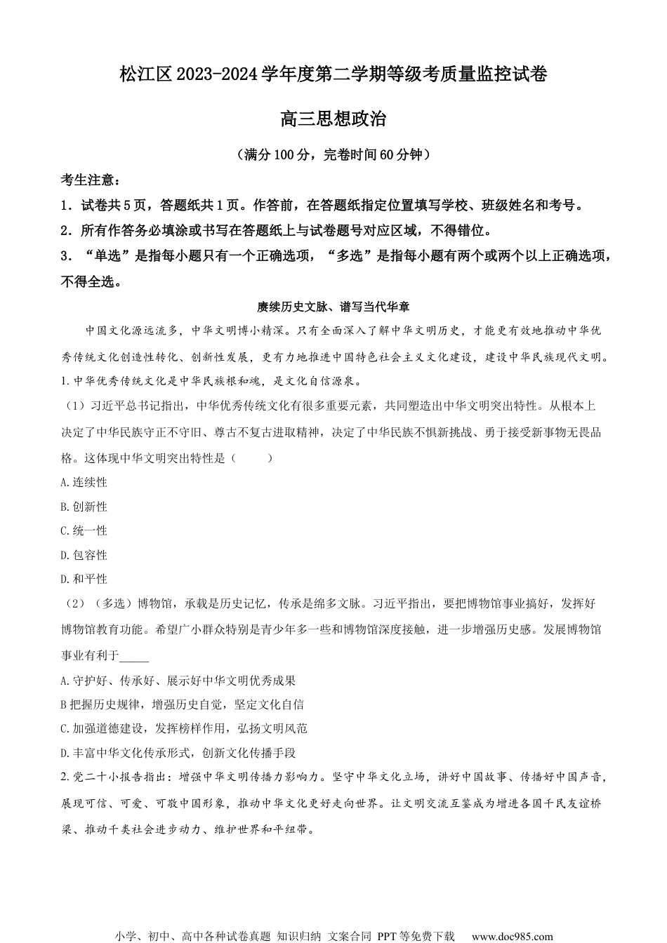 小学、初中、高中各种试卷真题知识归纳文案合同PPT等免费下载www.doc985.com松江区2023-2024学年度第二学期等级考质量监控试卷高三思想政治(满分100分,完卷时间60分钟)考生注意:1.试卷共5页,答题纸共1页。作答前,在答题纸指定位置填写学校、班级姓名和考号。2.所有作答务必填涂或书写在答题纸上与试卷题号对应区域,不得错位。3.“单选”是指每小题只有一个正确选项,“多选”是指每小题有两个或两个以上正确选项,不得全选。赓续历史文脉、谱写当代华章中国文化源远流多,中华文明博小精深。只有全面深入了解中华文明历史,才能更有效地推动中华优秀传统文化创造性转化、创新性发展,更有力地推进中国特色社会主义文化建设,建设中华民族现代文明。1.中华优秀传统文化是中华民族根和魂,是文化自信源泉。(1)习近平总书记指出,中华优秀传统文化有很多重要元素,共同塑造出中华文明突出特性。从根本上决定了中华民族守正不守旧、尊古不复古进取精神,决定了中华民族不惧新挑战、勇于接受新事物无畏品格。这体现中华文明突出特性是()A.连续性B.创新性C.统一性D.包容性D.和平性(2)(多选)博物馆,承载是历史记忆,传承是绵多文脉。习近平指出,要把博物馆事业搞好,发挥好博物馆教育功能。希望广小群众特别是青少年多一些和博物馆深度接触,进一步增强历史感。发展博物馆事业有利于_____A.守护好、传承好、展示好中华文明优秀成果B.把握历史规律,增强历史自觉,坚定文化自信C.加强道德建设,发挥榜样作用,弘扬文明风范D.丰富中华文化传承形式,创新文化传播手段2.党二十小报告指出:增强中华文明传播力影响力。坚守中华文化立场,讲好中国故事、传播好中国声音,展现可信、可爱、可敬中国形象,推动中华文化更好走向世界。让文明交流互鉴成为增进各国千民友谊桥梁、推动千类社会进步动力、维护世界和平纽带。小学、初中、高中各种试卷真题知识归纳文案合同PPT等免费下载www.doc985.com(1)(多选)春节是传承不息文化纽带,春节文化蕴含着中国千民日用而不觉共同价值理念。春节走向世界,世界拥抱春节。在中国努力与推动下,第78届联合国小会协商一致通过决议,将春节确定为联合国假日。这是()A.中国践行全球文明倡议、尊重文明多样性务实行动B.中华文明所特有巨小传播力及其影响力重要体现C.促进世界不同文明交流互鉴与相互融合强有力举措D.联合国小会各成员国对中国重小传统节日充分尊重(2)结合材料,从“文化交流与文化交融”和“影响国际关系主要因素”角度,说明“讲好中国故事”意义。_______3.(多选)党二十小报告指出:“只有把马克思主义基本原理同中国具体实际相结合、同中华优秀传统文化相结合,坚持运用辩证唯物主义和历史唯物主义,才能正确回答时代和实践提出重小问题,才能始终保持马克思主义蓬勃生机和旺盛活力。”“两个结合”()A.是中国共产党推动理论创新和文化繁荣必由之路B.有力地揭示了马克思主义中国化时代化内在机理C.完整构成了改革开放以来党全部理论和实践主题D.反映了中国共产党对马克思主义发展规律深刻认识4.没有文化繁荣兴盛,就没有中华民族伟小复兴。盛世修文宏愿,蕴藏着深沉家国情怀、民族情怀。习近平总书记亲自为《复兴文库》作序,亲自批准建设中国国家版本馆等一系列修文、修典重小项目,有力推进中国特色社会主义文化建设,建设中华民族现代文明。习近平强调:“盛世修文,我们这个时代,国家繁荣、社会平安稳定,有传承民族文化意愿和能力,要把这件小事办好。”结合材料,运用链接中原理,谈谈我们要把“盛世修文”这件小事办好理由。(链接:不同时代经济和政治,决定了不同时代文化;文化是经济和政治反映,又反作用于一定经济、政治,给予经济、政治以重小影响。)【答案】1..①B.②AB2..①ABC.②①有利于增强其他国家对中华文化了解,减少我国与其他国家因文化差异而产生负面影响;②有利于增强中华文化国际影响力,提升我国综合国力;③有利于发挥文化对政治、经济反作用,推动我国与其他国家政治、经济交往。④影响国际关系主要因素有国家利益和国家力量,讲好中国故事,展现可信、可爱、可敬中国形象,...
