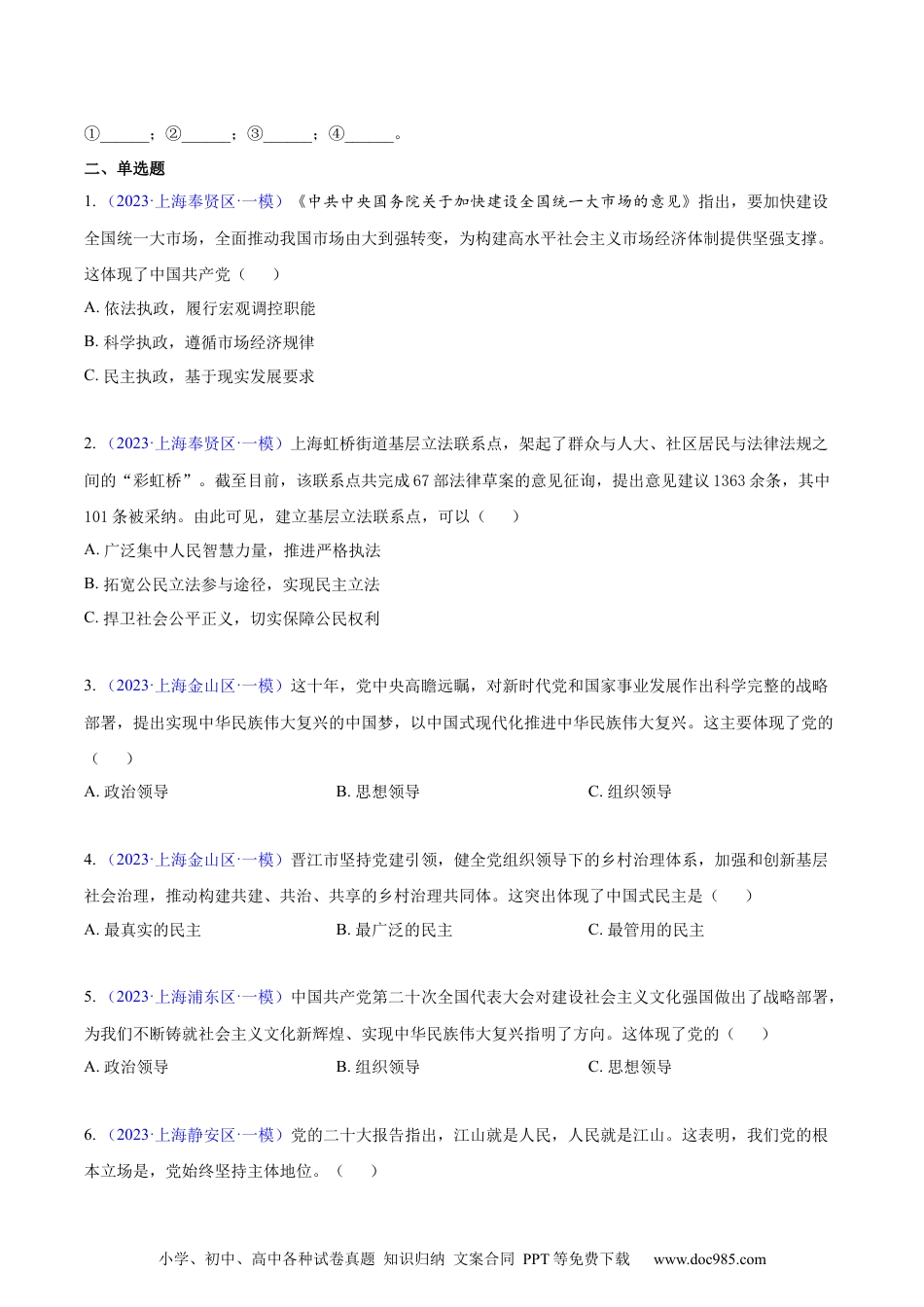 小学、初中、高中各种试卷真题知识归纳文案合同PPT等免费下载www.doc985.com专题04政治与法治客观题一、填空、匹配题1.(2023·上海长宁区·一模)习近平总书记在党的二十大报告中庄严宣示:“从现在起,中国共产党的中心任务就是团结带领全国各族人民全面建成社会主义现代化强国、实现第二个百年奋斗目标,以中国式现代化全面推进中华民族伟大复兴。”这体现出党的领导方式是_____________________。2.(2023·上海青浦区·一模)习近平总书记指出,“有事好商量,众人的事情由众人商量,是人民民主的真谛”,这是因为______是我国社会主义民主政治的特有形式和独特优势,也是实践全过程人民民主的重要形式。3.(2023·上海奉贤区·一模)习近平总书记在党的二十大报告中深刻指出:“全面依法治国是国家治理的一场深刻革命,关系党执政兴国,关系人民幸福安康,关系党和国家长治久安。”在编号处匹配全面依法治国的基本要求。深化行政体制改革,全面推行行政执法公示制度、执法全过程记录制度、重大执法决定法制审核制度,推动解决执法不严格、不规范、不文明、不透明等问题。截至今年6月底,制定、修改法律行政法规730余件次,现行有效法律292件、行政法规598件,中国特色社会主义法律体系日趋科学完善。加大全民普法力度,努力培育全社会办事依法、遇事找法、解决问题用法、化解矛盾靠法的法治环境,全社会法治观念、对法治的认同感明显提升。深化以司法责任制为重点的司法体制改革,推进以审判为中心的刑事诉讼制度改革,严格落实防止干预司法“三个规定”,依法纠正冤错案件,社会公平正义法治保障更加有力。①②③④A.科学立法B.严格执法C.公正司法D.全民守法小学、初中、高中各种试卷真题知识归纳文案合同PPT等免费下载www.doc985.com①______;②______;③______;④______。二、单选题1.(2023·上海奉贤区·一模)《中共中央国务院关于加快建设全国统一大市场的意见》指出,要加快建设全国统一大市场,全面推动我国市场由大到强转变,为构建高水平社会主义市场经济体制提供坚强支撑。这体现了中国共产党()A.依法执政,履行宏观调控职能B.科学执政,遵循市场经济规律C.民主执政,基于现实发展要求2.(2023·上海奉贤区·一模)上海虹桥街道基层立法联系点,架起了群众与人大、社区居民与法律法规之间的“彩虹桥”。截至目前,该联系点共完成67部法律草案的意见征询,提出意见建议1363余条,其中101条被采纳。由此可见,建立基层立法联系点,可以()A.广泛集中人民智慧力量,推进严格执法B.拓宽公民立法参与途径,实现民主立法C.捍卫社会公平正义,切实保障公民权利3.(2023·上海金山区·一模)这十年,党中央高瞻远瞩,对新时代党和国家事业发展作出科学完整的战略部署,提出实现中华民族伟大复兴的中国梦,以中国式现代化推进中华民族伟大复兴。这主要体现了党的()A.政治领导B.思想领导C.组织领导4.(2023·上海金山区·一模)晋江市坚持党建引领,健全党组织领导下的乡村治理体系,加强和创新基层社会治理,推动构建共建、共治、共享的乡村治理共同体。这突出体现了中国式民主是()A.最真实的民主B.最广泛的民主C.最管用的民主5.(2023·上海浦东区·一模)中国共产党第二十次全国代表大会对建设社会主义文化强国做出了战略部署,为我们不断铸就社会主义文化新辉煌、实现中华民族伟大复兴指明了方向。这体现了党的()A.政治领导B.组织领导C.思想领导6.(2023·上海静安区·一模)党的二十大报告指出,江山就是人民,人民就是江山。这表明,我们党的根本立场是,党始终坚持主体地位。()小学、初中、高中各种试卷真题知识归纳文案合同PPT等免费下载www.doc985.comA.人民立场、人民B.公民立场、公民C.人民立场、公民D.群众立场、公民7.(2023·上海静安区·一模)李克强总理代表国务院在十三届全国人大五次会议上作《2022年政府工作报告》时提出,要启动一批产业基础再造工程项目,促进传统产业升级,大力推进智能制造,加快发展先进制造业集群,实施国家战略性新兴产业集群工程。全国人大审议李克强总理所作《政府工作报告》是在行使()A.最高立法权B.最高决...