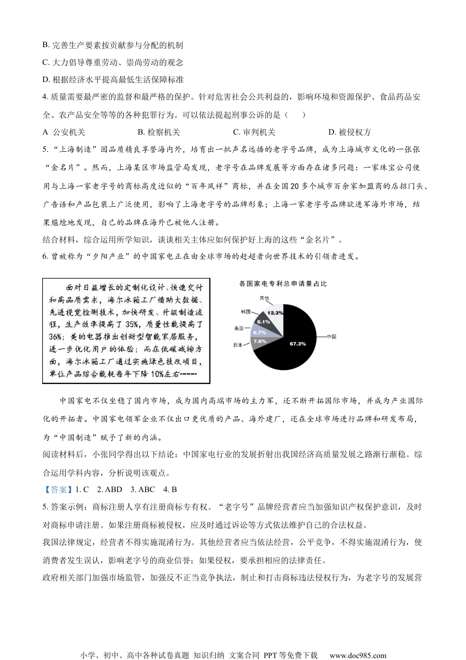 小学、初中、高中各种试卷真题知识归纳文案合同PPT等免费下载www.doc985.com浦东新区2022学年度第二学期教学质量检测高三政治试卷考生注意:1.试卷满分100分,考试时间60分钟。试卷共5页。2.本考试分设试卷和答题纸两部分。答题前,务必在答题纸上填写姓名、报名号、考场号和座位号,并将核对后的条形码贴在指定位置上。作答必须涂或写在答题纸上,在试卷上作答一律不得分。3.试卷分为三个主题,其中选择题分单选(3分)与多选(4分,至少2个正确答案,单选、全选都不给分),所有的题目必须在答题纸上与试卷题号对应的位置作答。一、夯实质量基石、共筑强国梦想为促进我国经济高质量发展,更好满足人民美好生活需要,中共中央、国务院印发《质量强国建设纲要》,对加快建设质量强国进行了全面部署,掀开了新时代建设质量强国的新篇章。1.推进质量强国建设,才能更好满足人民群众对美好生活的需要。这是()A.联言判断B.选言判断C.假言判断2.(多选)质量兴则经济兴,质量强则国家强。从1996年到2023年,我们走过质量理念不断创新、质量内涵不断丰富、质量水平不断提高的二十七年。年份文件要求1996年《质量振兴纲要》提高我国产品质量、工程质量和服务质量的总体水平2012年《质量发展纲要》促进经济发展方式转变,提高我国质量总体水平2023年《质量强国建设纲要》统筹推进质量强国建设,全面提高我国质量总体水平可见,从“质量振兴”到“质量强国”,我们始终坚持()A.辩证否定,既继承又创新B.与时俱进,推动事物发展C.适度原则,防止过犹不及D.循序渐进,实现质量互变3.(多选)发挥工匠精神,提高产品质量,从“制造大国”向“制造强国”迈进,要努力培养一支高素质劳动者队伍,调动劳动者的积极性。这需要()A.提高劳动报酬在初次分配中所占比重小学、初中、高中各种试卷真题知识归纳文案合同PPT等免费下载www.doc985.comB.完善生产要素按贡献参与分配的机制C.大力倡导尊重劳动、崇尚劳动的观念D.根据经济水平提高最低生活保障标准4.质量需要最严密的监督和最严格的保护。针对危害社会公共利益的,影响环境和资源保护、食品药品安全、农产品安全等等的各种犯罪行为。可以依法提起刑事公诉的是()A.公安机关B.检察机关C.审判机关D.被侵权方5.“上海制造”因品质精良享誉海内外,培育出一批声名远播的老字号品牌,成为上海城市文化的一张张“金名片”。然而,上海某区市场监管局发现,老字号在品牌发展等方面存在诸多问题:一家珠宝公司使用与上海一家老字号的商标高度近似的“百年凤祥”商标,并在全国20多个城市百余家加盟商的店招门头、广告语和产品包装上广泛使用,影响了上海老字号的品牌形象;上海一家老字号品牌欲进军海外市场,结果尴尬地发现,自己的品牌在海外已被他人注册。结合材料,综合运用所学知识,谈谈相关主体应如何保护好上海的这些“金名片”。6.曾被称为“夕阳产业”的中国家电正在由全球市场的赶超者向世界技术的引领者进发。中国家电不仅坐稳了国内市场,成为国内高端市场的主力军,还不断开拓国际市场,并成为产业国际化的开拓者。中国家电领军企业不仅出口更优质的产品、海外建厂,还在全球市场进行品牌和研发布局,为“中国制造”赋予了新的内涵。阅读材料后,小张同学得出以下结论:中国家电行业的发展折射出我国经济高质量发展之路渐行渐稳。综合运用学科内容,分析说明该观点。【答案】1.C2.ABD3.ABC4.B5.答案示例:商标注册人享有注册商标专有权。“老字号”品牌经营者应当加强知识产权保护意识,及时对商标申请注册。如果注册商标被侵权,应及时通过诉讼等方式依法维护自己的合法权益。我国法律规定,经营者不得实施混淆行为。其他经营者应当依法经营,公平竞争,不得实施混淆行为,使消费者发生误认,影响老字号的商业信誉;如果侵权,要承担相应的法律责任。政府相关部门加强市场监管,加强反不正当竞争执法,制止和打击商标违法侵权行为,为老字号的发展营小学、初中、高中各种试卷真题知识归纳文案合同PPT等免费下载www.doc985.com造良好的营商环境。6.答案示例:我国家电专利总申请量居世界前列,家电企业加快研发、升级制造流程,...