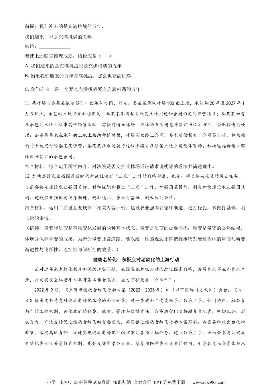 小学、初中、高中各种试卷真题知识归纳文案合同PPT等免费下载www.doc985.com静安区2022学年第二学期教学质量检测高三政治试卷考生注意:1.试卷满分100分,考试时间60分钟。2.本考试分设试卷和答题纸。考生作答前,在答题纸指定位置填写学校、班级、姓名,填涂准考证号。所有作答务必填涂或书写在答题纸上与试卷题号对应的区域,不得错位。在试卷上作答一律不得分。3.用2B铅笔作答选择题,用黑色字迹钢笔、水笔或圆珠笔作答非选择题。以中国式现代化全面推进中华民族伟大复兴中国共产党成立以来,始终践行初心使命,团结带领全国各族人民绘就了人类发展史上的壮美画卷,中华民族伟大复兴展现出前所未有的光明前景。从现在起,中国共产党的中心任务就是团结带领全国各族人民全面建成社会主义现代化强国、实现第二个百年奋斗目标,以中国式现代化全面推进中华民族伟大复兴。1.下列标志着中国人民谋求民族独立、人民解放和国家富强、人民幸福的斗争有了主心骨的事件是()A.北伐战争B.新文化运动C.中国共产党的成立D.五四运动2.________是坚持和发展中国特色社会主义的必由之路,是决定当代中国命运的关键一招,也是决定实现“两个一百年“奋斗目标,实现中华民族伟大复兴的关键一招。()A.提出中国梦B.改革开放C.市场经济D.理论自信3.党的十八大以来,面对深刻变化的国际形势,党中央深刻把握新时代中国和世界发展大势,在对外工作上进行一系列重大理论和实践创新,形成了习近平外交思想。习近平外交思想是一个完整的理论体系。________是习近平外交思想的核心理念。()A.构建人类命运共同体B.独立自主C.和平共处D.总体国家安全观4.“明天的中国,希望寄予青年。青年兴则国家兴,中国发展要靠广大青年挺膺担当。”习近平主席在2023新年贺词中寄语青年:“广大青年要厚植家国情怀、涵养进取品格,以奋斗姿态激扬青春,不负时代,不负华年。”(1)(多选)由“青年兴则国家兴,中国发展要靠广大青年挺膺担当”可知,“青年兴则国家兴”是一个()A.关系判断B.复合判断小学、初中、高中各种试卷真题知识归纳文案合同PPT等免费下载www.doc985.comC.假言判断(2)(多选)习近平主席在2023新年贺词中寄语青年,激励广大青年挺膺担当,以奋斗姿态激扬青春,不负时代,不负华年。以下理解正确的是()A.人的价值只能在社会中实现B.实现人生价值需要正确价值观的指引C.有价值观就能实现人生价值D.实现个人价值不应追求人的个性发展5.(多选)在带领中国人民进行革命、建设、改革的长期历史实践中,中国共产党人始终是中国优秀传统文化的忠实继承者和弘扬者。以下属于中华优秀传统文化的有()A.任人唯亲B.自强不息C.亲仁善邻D.扶危济困6.党的二十大提出,中国式现代化是人口规模巨大的现代化,是全体人民共同富裕的现代化,是人与自然和谐共生的现代化,是物质文明和精神文明相协调的现代化,是走和平发展道路的现代化。结合材料,从绿色发展角度简要回答,在实现“中国式现代化”的进程中,坚持“人与自然和谐共生”的必然性。强国必先强农农强方能国强农业强国是社会主义现代化强国的根基,满足人民美好生活需要、实现高质量发展、夯实国家安全基础,都离不开农业发展。要铆足干劲,抓好以乡村振兴为重心的“三农”各项工作,大力推进农业农村现代化,为加快建设农业强国而努力奋斗。7.习近平总书记指出,乡村建设要遵循城乡发展建设规律,做到先规划后建设。各地情况不一样,要加强分类指导,不要一刀切、搞运动,不要干超越发展阶段的事。这体现了中国共产党坚持()A.科学执政B.民主执政C.依法执政D.法治建设8.(多选)某村委会不断完善民主监督制度,丰富监督形式,开展民主评议、规范村干部任期和离任经济责任审计等方式,逐步建立起责权明晰、衔接配套、运转有效的村级民主监督机制。此举对___________具有积极意义。()A.完善我国基层群众自治制度B.充分发挥基层群众自治制度优势C.更好发挥村委会基层政权功能D.保障村民依法直接行使民主权利9.2022年10月,民政部、中央农村工作领导小组办公室、财政部、国家乡村振兴局发布《关于进一步做好最低生活保障等社会救助兜底保障工作的...