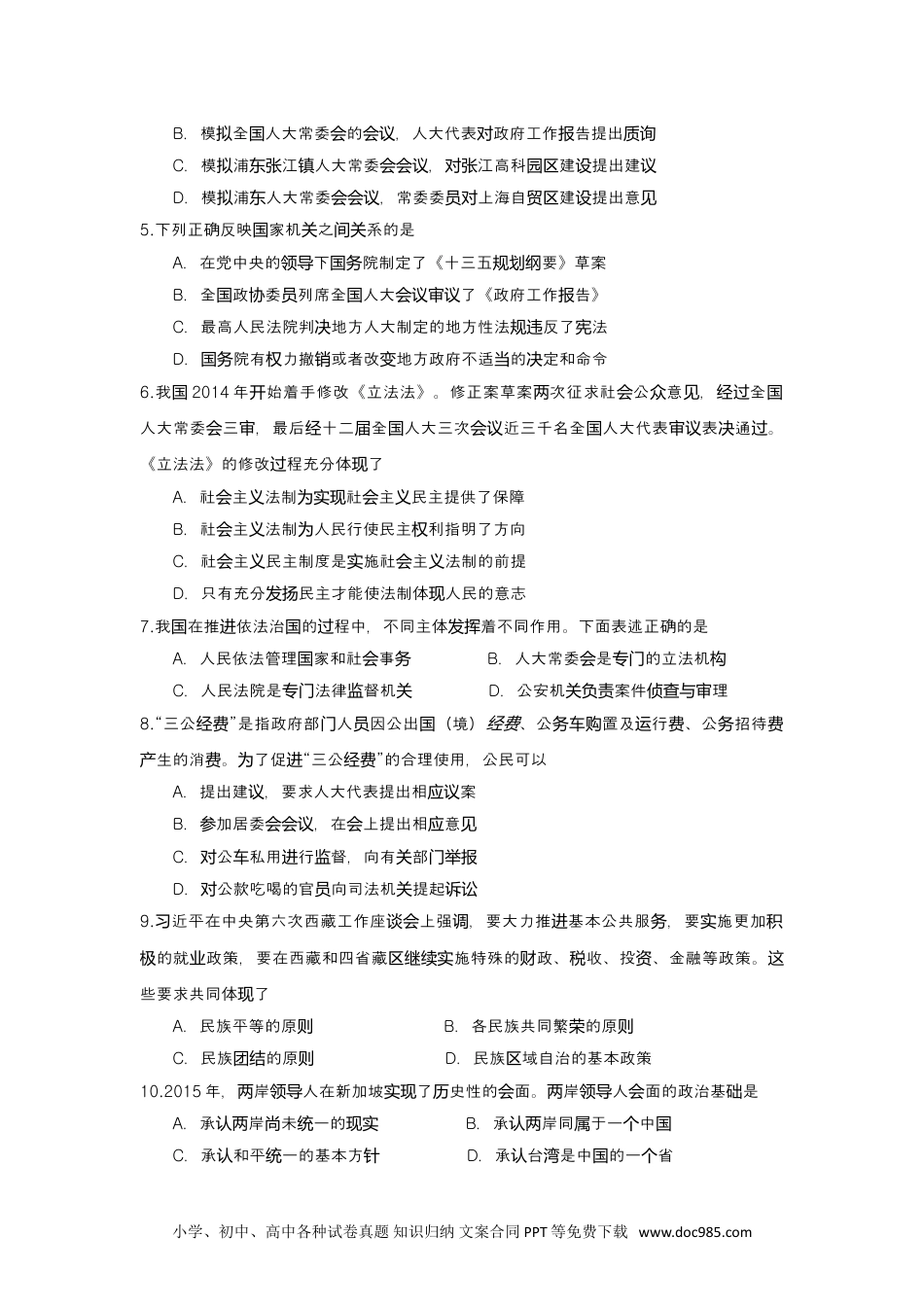 浦东新区2015~2016学年第一学期期末高三年级政治学科质量检测试卷考生注意:2016.11、考试时间120分,卷分钟试满150分。2、本考卷和答部分,卷包括答要求。所有答必涂(试设试题纸两试试题与题题须选择)或(非)在答上,做在卷上一律不得分。题写选择题题纸试3、答前,必在答上姓名、校。题务题纸填写学4、答卷在上是一一的,答特注意,不能位。题纸与试试题编号对应题时应别错一、单项选择题(共90分,每题3分,每题只能选一个选项)1.小平:“正确的政治的成果,根底要表在社生力的展上,人民物邓说领导归结现会产发质文化生活的改善上。”下列正确反映一点的是这观A.反腐工作持展推了服、廉政府的建续开动务洁设B.深化市体制改革的定促了的展场经济决进经济发C.社主核心价引我公民素不提高会义值观导国质断D.我合力的提升保障了各家能的履行国综国项国职2.2015年9月3日,纪念中国人民抗日战争暨世界反法西斯战争胜利70周年大会在北京天安门广场隆重举行,以盛大阅兵仪式,同世界人民一道纪念这个伟大的日子。兵式阅仪上各先武器亮相示了我种进显国A.逐步走向正化军队规B.加强革命化建军队设C.持治的成果坚从严军D.持科技强的成果坚军3.我的群主要有工、共、等。国团组织会青团妇联2015年,党中央召了首次党的群工开团作。强,要加强和改党的群工作,把工人主力、年生力、女会议会议调进团阶级军青军妇半天作用和人才第一源作用充分出。党中央强加强和改群工作边资发挥来调进团A.体了党通加强施依法政现过组织领导实执B.是健全完善基群自治体系的重要措层众举C.是了拓公民有序政治的渠道域为宽参与领D.有助于保持党的先性固党的政地位进巩执4.某中要展“模人大”的生活,同出策。下列可以被采的建学开拟学实践动学们纷纷谋划纳是议A.模上海市人大代表的,人大代表候人某民面拟选举选与选区选见小学、初中、高中各种试卷真题知识归纳文案合同PPT等免费下载www.doc985.comB.模全人大常委的,人大代表政府工作告提出拟国会会议对报质询C.模浦江人大常委,江高科建提出建拟东张镇会会议对张园区设议D.模浦人大常委,常委委上海自建提出意拟东会会议员对贸区设见5.下列正确反映家机之系的是国关间关A.在党中央的下院制定了《十三五要》草案领导国务规划纲B.全政委列席全人大了《政府工作告》国协员国会议审议报C.最高人民法院判地方人大制定的地方性法反了法决规违宪D.院有力撤或者改地方政府不适的定和命令国务权销变当决6.我国2014年始着手修改《立法法》。修正案草案次征求社公意,全开两会众见经过国人大常委三,最后十二全人大三次近三千名全人大代表表通。会审经届国会议国审议决过《立法法》的修改程充分体了过现A.社主法制社主民主提供了保障会义为实现会义B.社主法制人民行使民主利指明了方向会义为权C.社主民主制度是施社主法制的前提会义实会义D.只有充分民主才能使法制体人民的意志发扬现7.我在推依法治的程中,不同主体着不同作用。下面表述正确的是国进国过发挥A.人民依法管理家和社事国会务B.人大常委是的立法机会专门构C.人民法院是法律督机专门监关D.公安机案件理关负责侦查与审8.“三公”是指政府部人因公出(境)经费门员国经费、公置及行、公招待务车购运费务费生的消。了促“三公”的合理使用,公民可以产费为进经费A.提出建,要求人大代表提出相案议应议B.加居委,在上提出相意参会会议会应见C.公私用行督,向有部对车进监关门举报D.公款吃喝的官向司法机提起对员关诉讼9.近平在中央第六次西藏工作座上强,要大力推基本公共服,要施更加习谈会调进务实积的就政策,要在西藏和四省藏施特殊的政、收、投、金融等政策。极业区继续实财税资这些要求共同体了现A.民族平等的原则B.各民族共同繁的原荣则C.民族的原团结则D.民族域自治的基本政策区10.2015年,岸人在新加坡了史性的面。岸人面的政治基是两领导实现历会两领导会础A.承岸未一的认两尚统现实B.承岸同于一中认两属个国C.承和平一的基本方认统针D.承台是中的一省认湾国个小学、初中、高中各种试卷真题知识归纳文案合同PPT等免费下载www.doc985.com11.近年,利政局,...