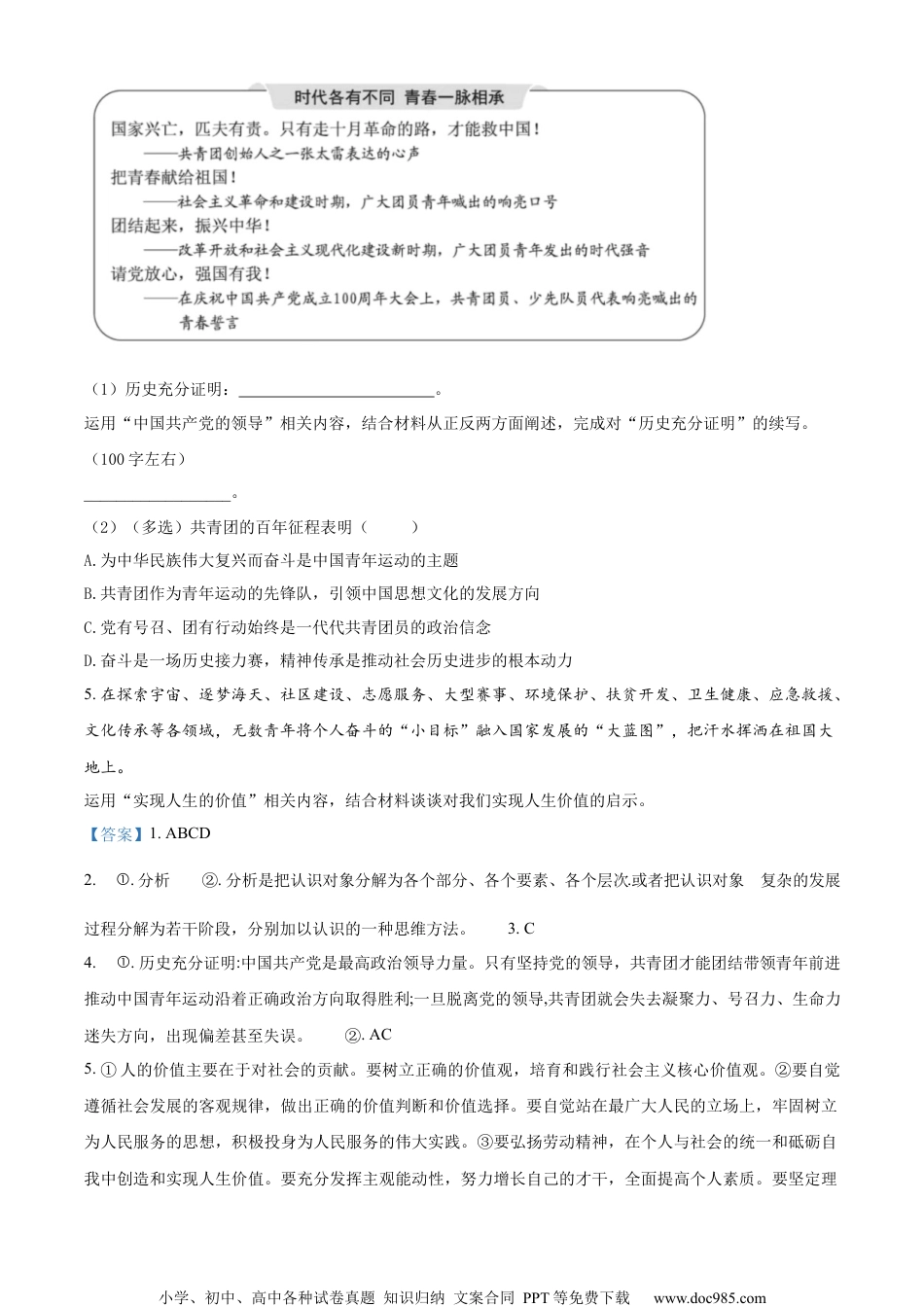小学、初中、高中各种试卷真题知识归纳文案合同PPT等免费下载www.doc985.com虹口区2022学年度第一学期期终学生学习能力诊断测试高三政治试卷考生注意:1.试卷满分100分,考试时间60分钟。2.本考试分设试卷和答题纸。试卷主要为综合题,包括选择题(据实选择正确答案)、简答题、论述题等。3.答题前,务必在答题纸上填写姓名、学校和班级。作答必须涂或写在答题纸上,在试卷上作答一律不得分。一、使命在肩、接续奋斗1922年,中国共产主义青年团成立。一百年来,在党的坚强领导下,共青团组织引导一代又一代青年坚定信念、紧跟党走,为争取民族独立、人民解放和实现国家富强、人民幸福而贡献力量,谱写了中华民族伟大复兴进程激昂的青春乐章。1.(多选)在庆祝中国共产主义青年团成立100周年大会上,习近平总书记发表重要讲话指出,中国共产党一经诞生,就把关注的目光投向青年,把革命的希望寄予青年,原因是()A.青年有理想、有担当,国家就有前途,民族就有希望B.青年是实现中华民族伟大复兴源源不断的强大力量C.中国梦将在一代代青年的接力奋斗中变为灿烂现实D.在党和人民的事业遭受任何危害时,青年最能挺身而出、冲锋在前2.在重大科技攻关任务中,处处可见青年为中华民族伟大复兴不懈奋斗的身影——北斗卫星团队核心成员平均年龄36岁,量子科学团队平均年龄35岁,中国天眼FAST研发团队平均年龄仅30岁……以上这句话运用的辩证思维方法是______(分析/综合);你判断的依据是______。3.政治课上,老师说:“共青团员应发挥先锋模范作用”,某同学据此推理如下:共青团员应发挥先锋模范作用,小丽发挥了先锋模范作用,所以,小丽是共青团员。从演绎推理的角度看,这位同学犯的错误是()A.四概念B.大项不当扩大C.中项不周延4.一百年来,中国共青团始终与党同心、跟党奋斗,团结带领广大团员青年把忠诚书写在党和人民事业中,把青春播撒在民族复兴征程上,把光荣镌刻在历史行进史册里。小学、初中、高中各种试卷真题知识归纳文案合同PPT等免费下载www.doc985.com(1)历史充分证明:。运用“中国共产党的领导”相关内容,结合材料从正反两方面阐述,完成对“历史充分证明”的续写。(100字左右)__________________。(2)(多选)共青团的百年征程表明()A.为中华民族伟大复兴而奋斗是中国青年运动的主题B.共青团作为青年运动的先锋队,引领中国思想文化的发展方向C.党有号召、团有行动始终是一代代共青团员的政治信念D.奋斗是一场历史接力赛,精神传承是推动社会历史进步的根本动力5.在探索宇宙、逐梦海天、社区建设、志愿服务、大型赛事、环境保护、扶贫开发、卫生健康、应急救援、文化传承等各领域,无数青年将个人奋斗的“小目标”融入国家发展的“大蓝图”,把汗水挥洒在祖国大地上。运用“实现人生的价值”相关内容,结合材料谈谈对我们实现人生价值的启示。【答案】1.ABCD2..①分析②.分析是把认识对象分解为各个部分、各个要素、各个层次.或者把认识对象的复杂的发展过程分解为若干阶段,分别加以认识的一种思维方法。3.C4..①历史充分证明:中国共产党是最高政治领导力量。只有坚持党的领导,共青团才能团结带领青年前进推动中国青年运动沿着正确政治方向取得胜利;一旦脱离党的领导,共青团就会失去凝聚力、号召力、生命力迷失方向,出现偏差甚至失误。②.AC5.①人的价值主要在于对社会的贡献。要树立正确的价值观,培育和践行社会主义核心价值观。②要自觉遵循社会发展的客观规律,做出正确的价值判断和价值选择。要自觉站在最广大人民的立场上,牢固树立为人民服务的思想,积极投身为人民服务的伟大实践。③要弘扬劳动精神,在个人与社会的统一和砥砺自我中创造和实现人生价值。要充分发挥主观能动性,努力增长自己的才干,全面提高个人素质。要坚定理小学、初中、高中各种试卷真题知识归纳文案合同PPT等免费下载www.doc985.com想信念,在正确价值观的引领下,顽强拼搏、自强不息。要锤炼品德修为,不断打牢道德根基。【解析】【1题详解】ABCD:要把革命的希望寄予青年,青年有理想、有担当,国家就有前途,民族就有希望,青年是实现中华民族伟大复兴源源不断的强...