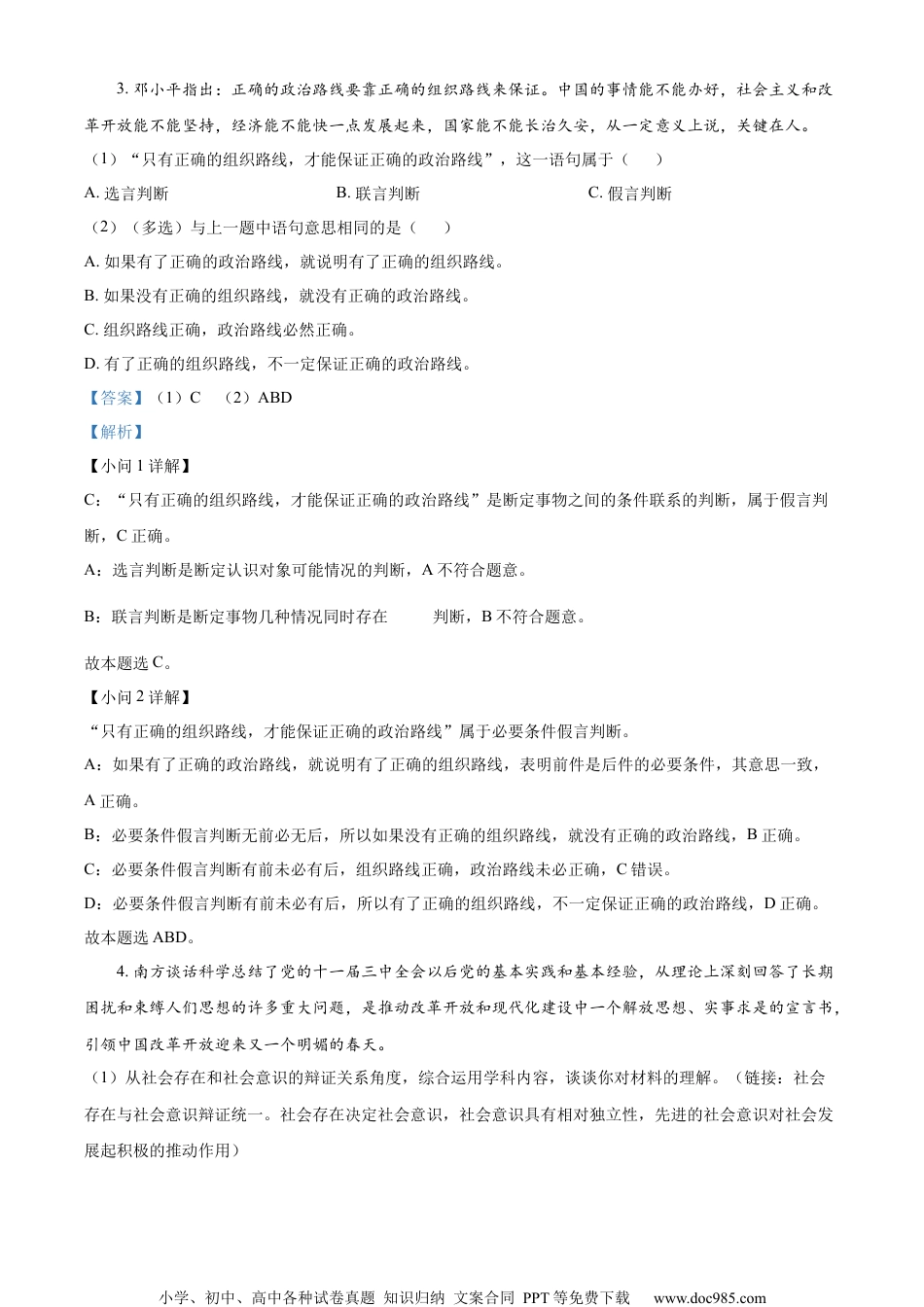 小学、初中、高中各种试卷真题知识归纳文案合同PPT等免费下载www.doc985.com上海市青浦区2022届高三二模政治试题一、赓续改革精神奋进新的征程30年前,1992年1月18日至2月21日,我国改革开放的总设计师邓小平同志先后赴武昌、深圳、珠海和上海等地视察,沿途发表了系列关于中国改革的重要谈话,史称为“南方谈话”。1.中国共产党团结带领全国各族人民不懈奋斗,书写了中华民族几千年历史上最恢宏的史诗。二十世纪七十年代,在历史的重要关头,中国开启了波澜壮阔的改革开放的伟大征程。请在编号处选填相应的选项A.提出形成全面对外开放新格局B.我国全方位、多层次、宽领域的对外开放格局基本形成C.要使市场在资源配置中起决定性作用和更好发挥政府作用D.开启了改革开放和社会主义现代化建设新时期①____________②______________③______________④________________【答案】①.D.②B.③C.④A【解析】【详解】①:1978年党的十一届三中全会开启了改革开放和社会主义现代化建设新时期。故D说法正确。②:1990年开始,开放上海浦东、内陆城市、沿边城市,我国全方位、多层次、宽领域的对外开放格局基本形成。故B说法正确。③:2013年党的十八届三中全会提出要使市场在资源配置中起决定性作用和更好发挥政府作用。故C说法正确。④:2017年,党的十九大召开,开启了改革开放和社会主义现代化建设新时期。故A说法正确。故正确答案是DBCA。2.改革开放以来,我国取得一切成绩和进步的根本原因,归结起来就是:中国共产党带领全国人民,开辟了中国特色社会主义道路,形成了中国特色社会主义_______________,确立了中国特色社会主义制度,发展了中国特色社会主义文化。【答案】理论体系【解析】【详解】本题属于填空题,可参照教材知识进行回答,详解略。小学、初中、高中各种试卷真题知识归纳文案合同PPT等免费下载www.doc985.com3.邓小平指出:正确的政治路线要靠正确的组织路线来保证。中国的事情能不能办好,社会主义和改革开放能不能坚持,经济能不能快一点发展起来,国家能不能长治久安,从一定意义上说,关键在人。(1)“只有正确的组织路线,才能保证正确的政治路线”,这一语句属于()A.选言判断B.联言判断C.假言判断(2)(多选)与上一题中语句意思相同的是()A.如果有了正确的政治路线,就说明有了正确的组织路线。B.如果没有正确的组织路线,就没有正确的政治路线。C.组织路线正确,政治路线必然正确。D.有了正确的组织路线,不一定保证正确的政治路线。【答案】(1)C(2)ABD【解析】【小问1详解】C:“只有正确的组织路线,才能保证正确的政治路线”是断定事物之间的条件联系的判断,属于假言判断,C正确。A:选言判断是断定认识对象可能情况的判断,A不符合题意。B:联言判断是断定事物几种情况同时存在的判断,B不符合题意。故本题选C。【小问2详解】“只有正确的组织路线,才能保证正确的政治路线”属于必要条件假言判断。A:如果有了正确的政治路线,就说明有了正确的组织路线,表明前件是后件的必要条件,其意思一致,A正确。B:必要条件假言判断无前必无后,所以如果没有正确的组织路线,就没有正确的政治路线,B正确。C:必要条件假言判断有前未必有后,组织路线正确,政治路线未必正确,C错误。D:必要条件假言判断有前未必有后,所以有了正确的组织路线,不一定保证正确的政治路线,D正确。故本题选ABD。4.南方谈话科学总结了党的十一届三中全会以后党的基本实践和基本经验,从理论上深刻回答了长期困扰和束缚人们思想的许多重大问题,是推动改革开放和现代化建设中一个解放思想、实事求是的宣言书,引领中国改革开放迎来又一个明媚的春天。(1)从社会存在和社会意识的辩证关系角度,综合运用学科内容,谈谈你对材料的理解。(链接:社会存在与社会意识辩证统一。社会存在决定社会意识,社会意识具有相对独立性,先进的社会意识对社会发展起积极的推动作用)小学、初中、高中各种试卷真题知识归纳文案合同PPT等免费下载www.doc985.com(2)(多选)“南方谈话”从根本上解除了把计划经济和市场经济看作属于社会基本制度范畴的思想束缚,党的十四大明确我国...